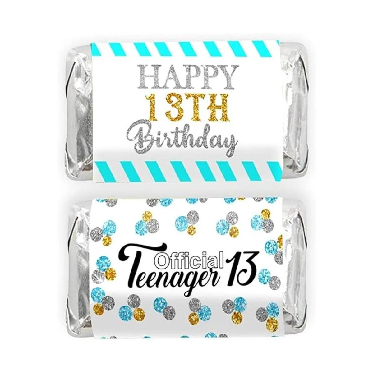 Perfecto para fiestas de 13 cumpleaños: las pegatinas envuelven exactamente alrededor de las miniaturas de barras de caramelos de chocolate, hacen de tu celebración un verdadero regalo memorable con un único favor. 2.65 x 1.45 pulgadas cada uno.