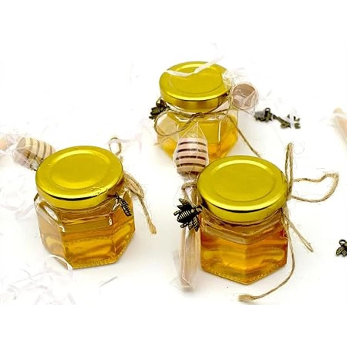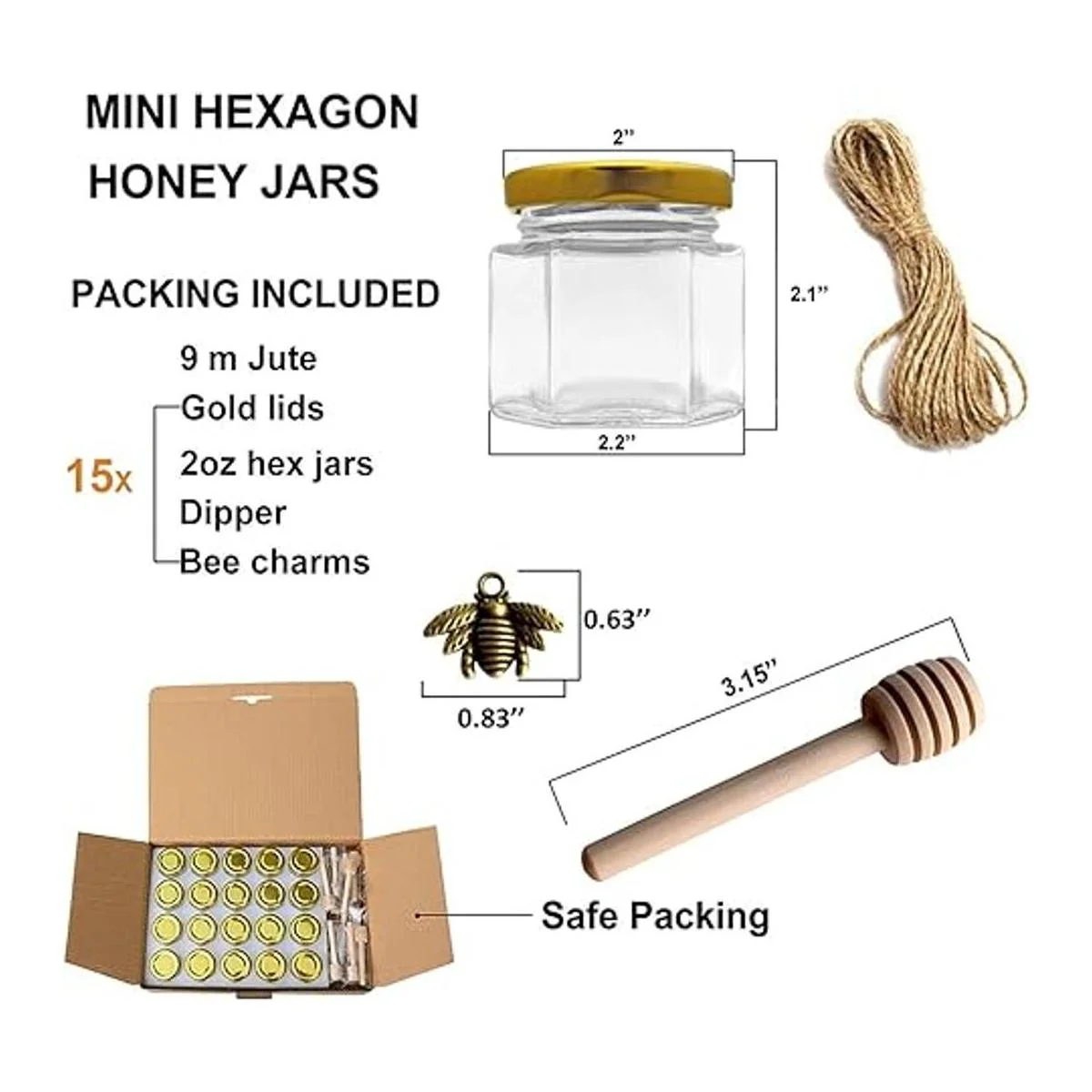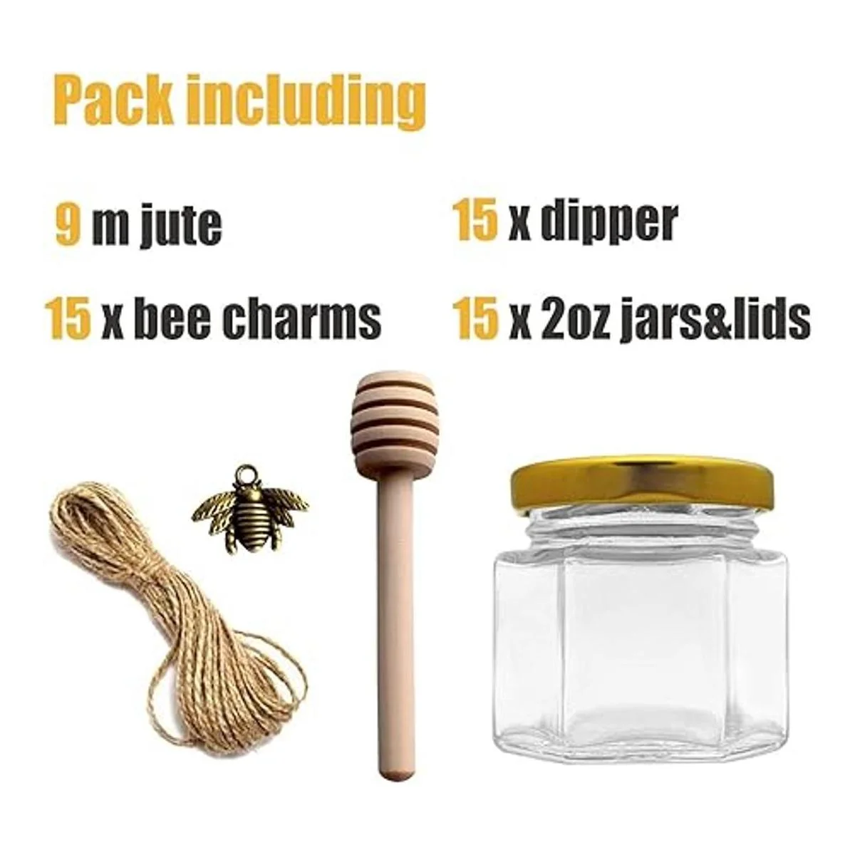 Mini tarros hexagonales de miel de 2 onzas, paquete de 15 tarros de miel de vidrio pequeño Tarros de miel de vidrio con tapas doradas, cucharones de madera, dijes de abeja y yutes Tarros pequeños de miel para baby shower, recuerdos de boda y fiesta