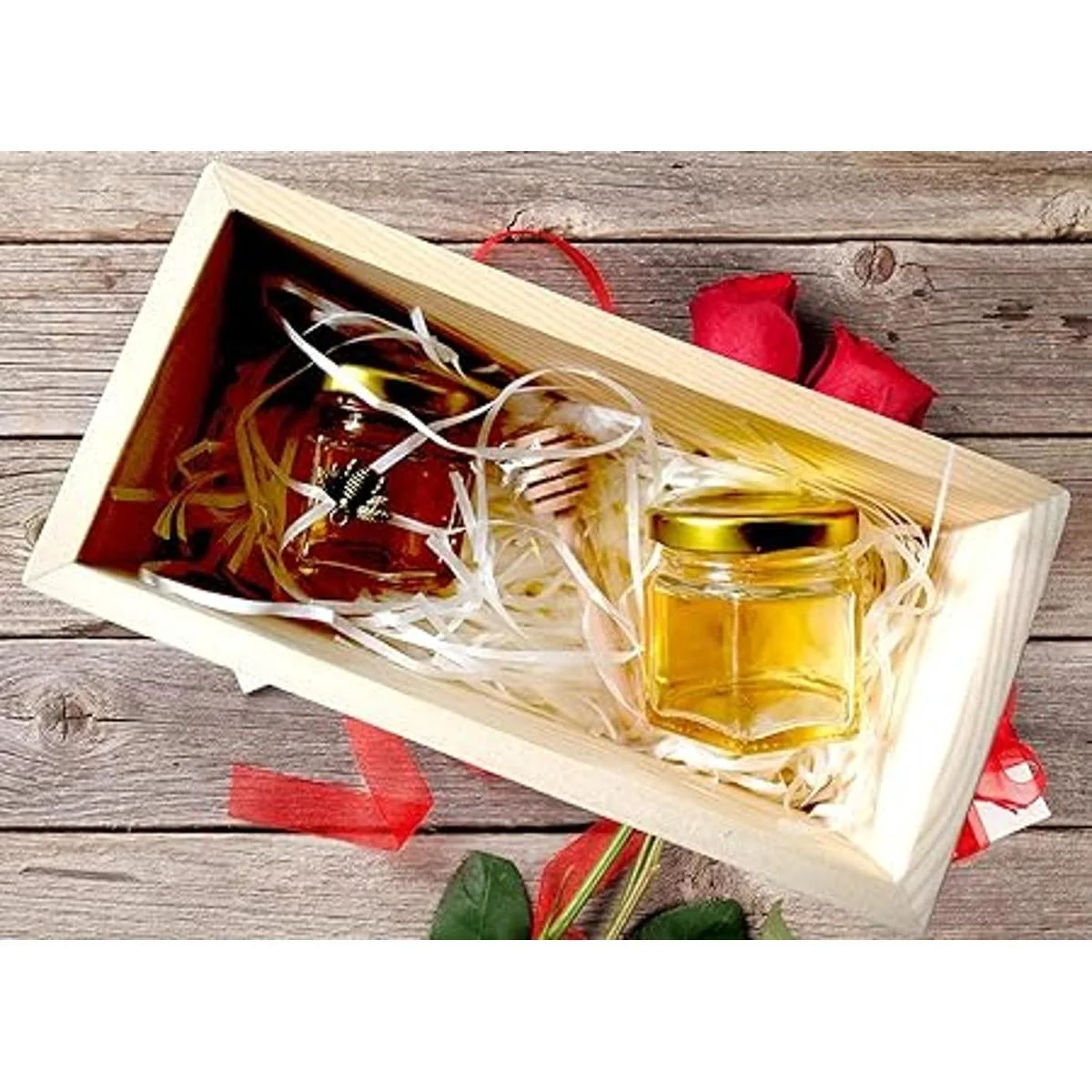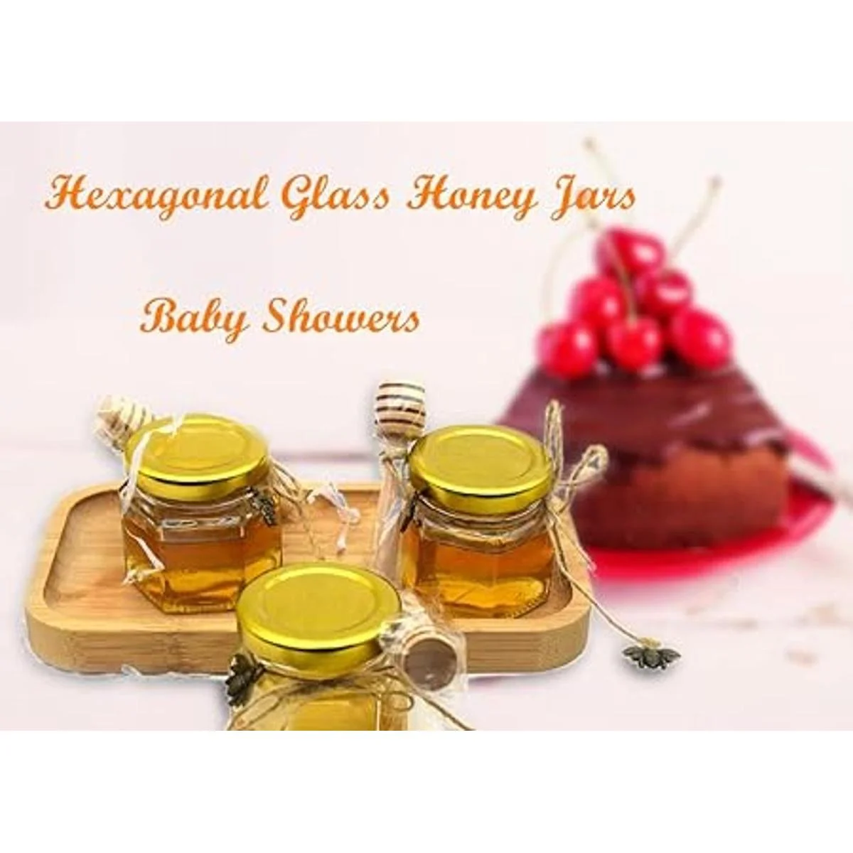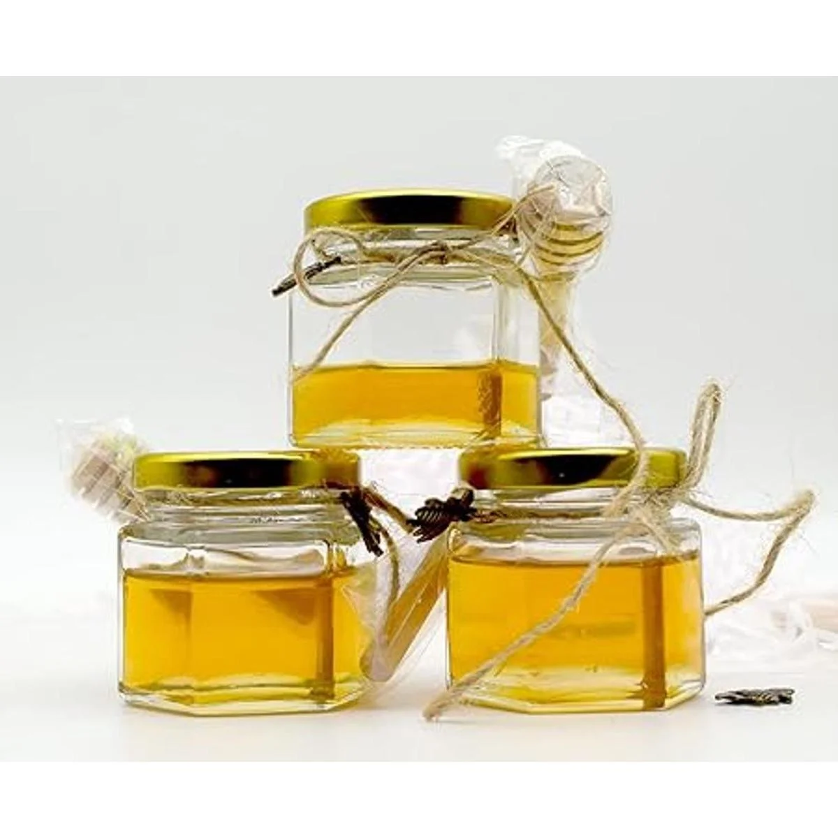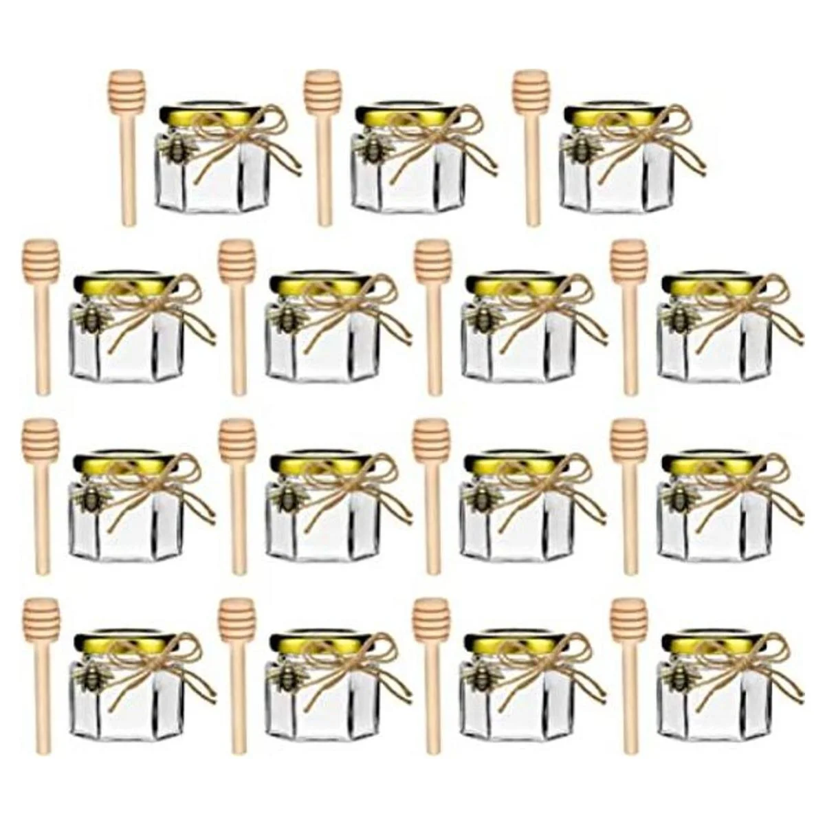 Mini tarros hexagonales de miel de 2 onzas, paquete de 15 tarros de miel de vidrio pequeño Tarros de miel de vidrio con tapas doradas, cucharones de madera, dijes de abeja y yutes Tarros pequeños de miel para baby shower, recuerdos de boda y fiesta