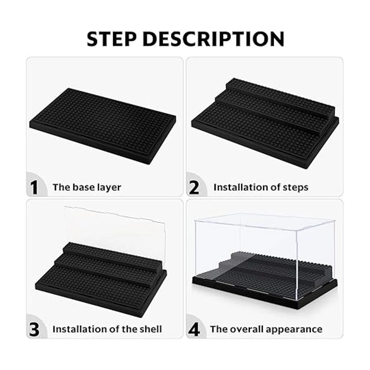 Minifigure Display Case for Action Figures Blocks, Clear Dustproof Acrylic Display Box Storage with 3 Movable Steps Gifts for Children,Black