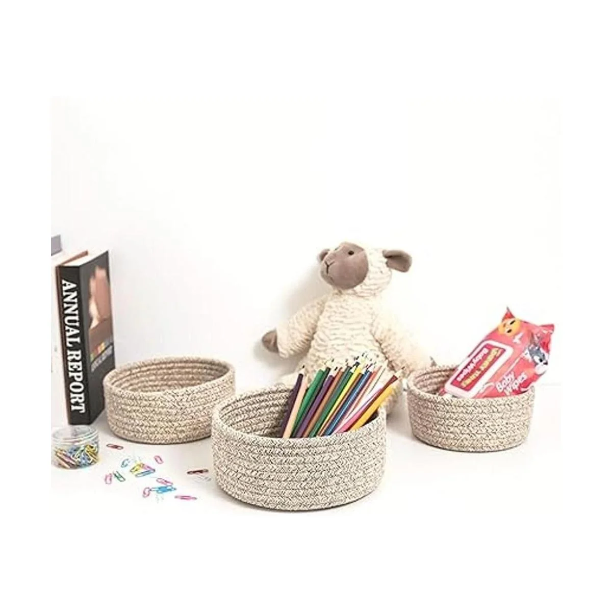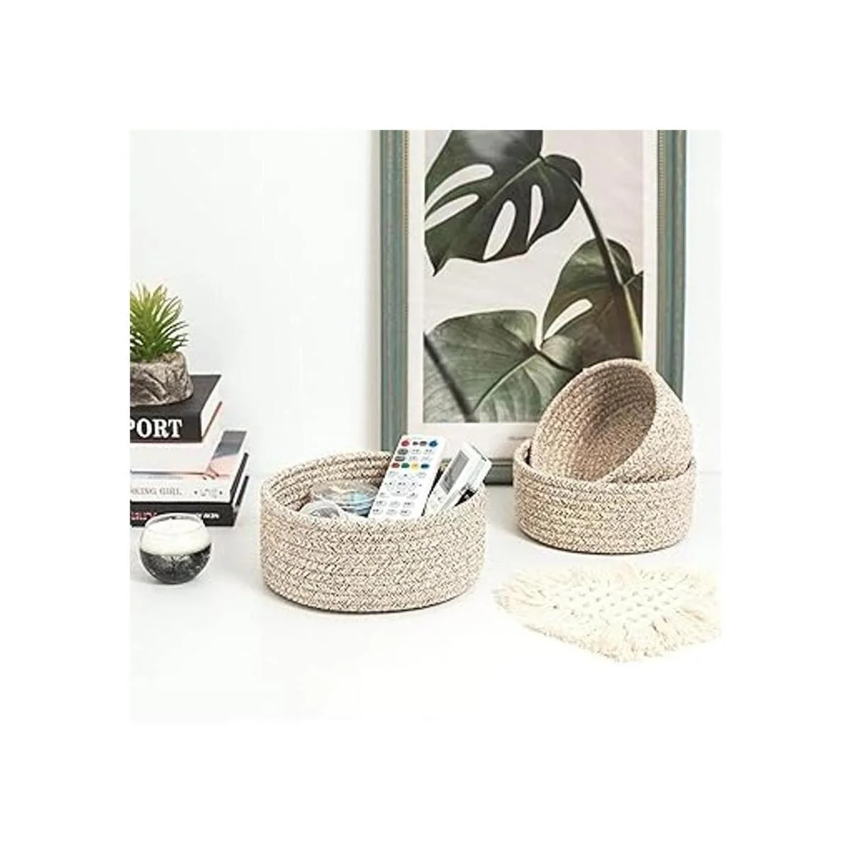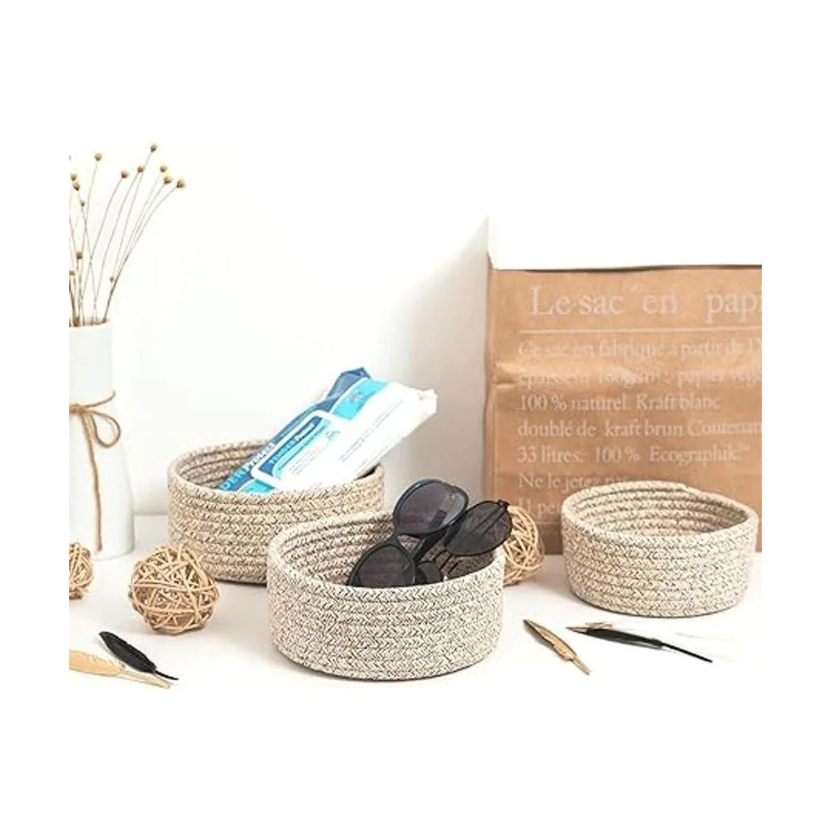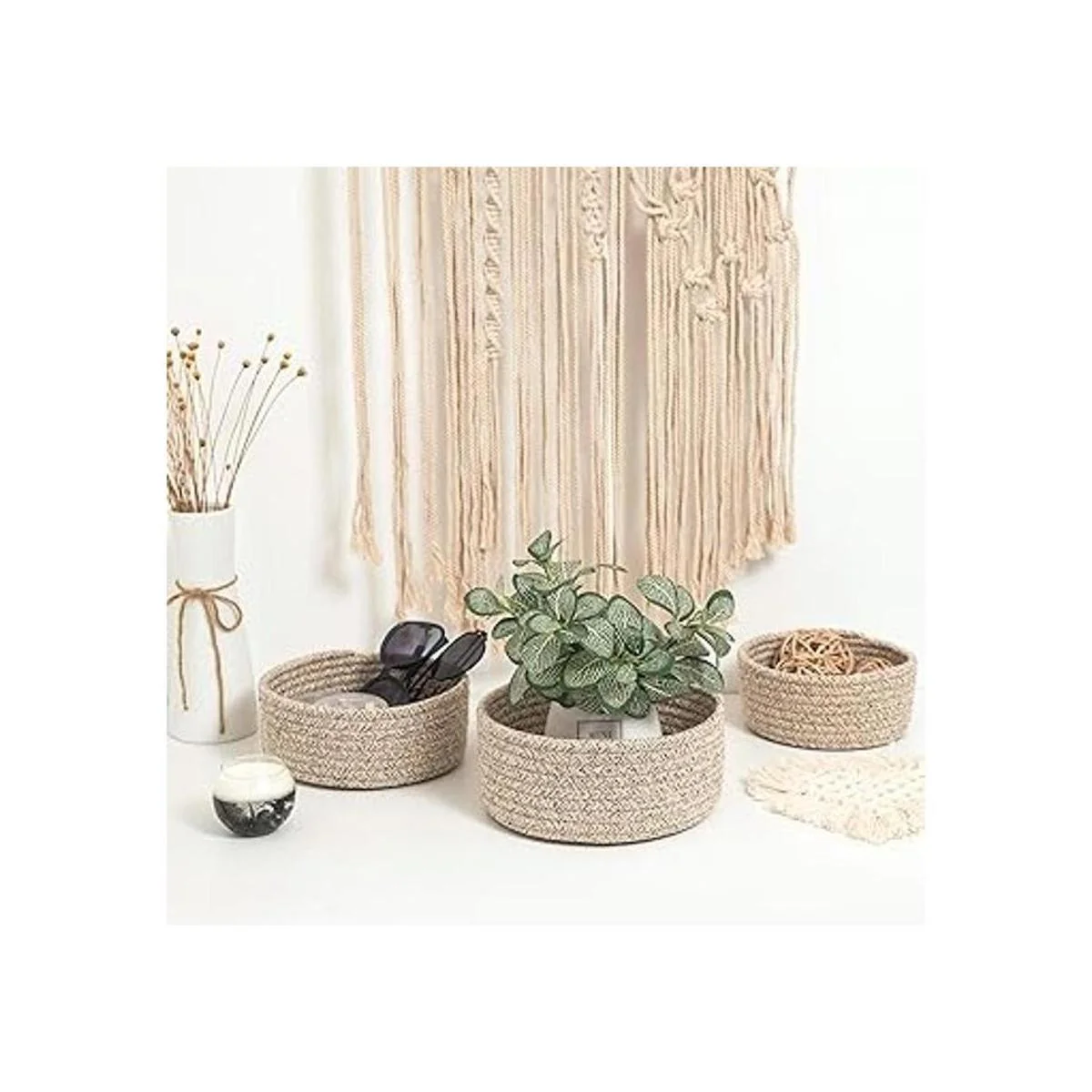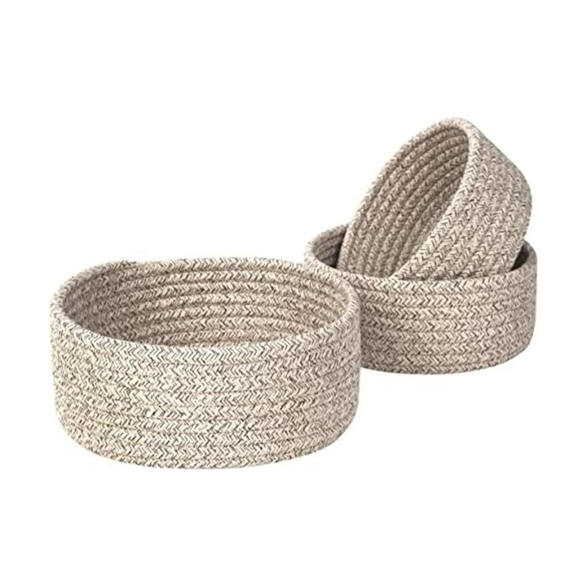MINTWOOD Design Juego de 3 cuencos anidadores de cuerda de algodón, canastas pequeñas para atrapar todas las canastas, bonitas cestas de armario y contenedores para estantes, mini organizador de mesa para accesorios pequeños, marrón claro