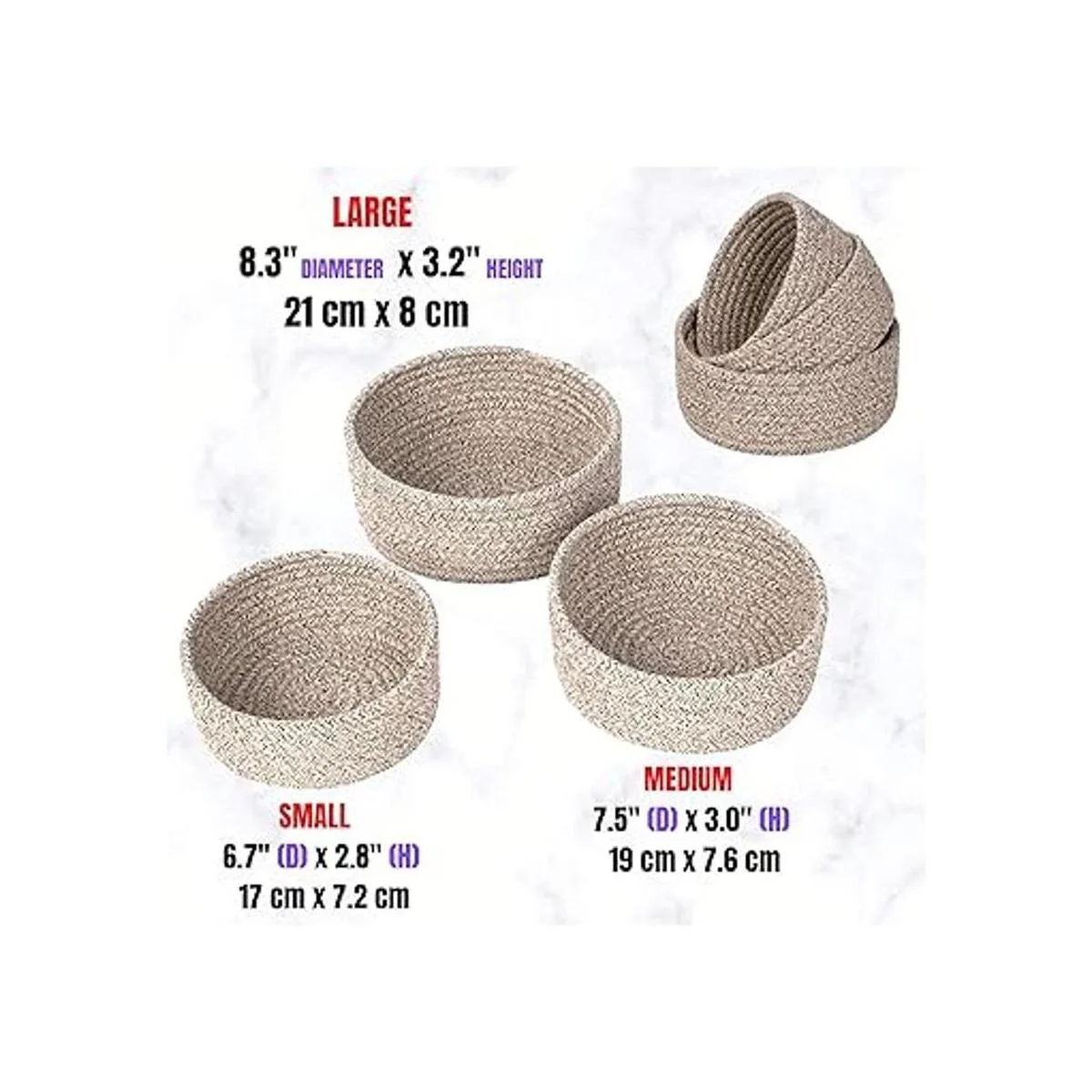 Buen tamaño para adaptarse a tus necesidades: juego de tres 3 cestas / cuencos para atrapar todos: S: 6.7 pulgadas profundidad x 2.8 pulgadas alto, M: 7.5 pulgadas profundidad x 3 pulgadas alto, grande: 8.3 pulgadas profundidad x 3.2 pulgadas alto.