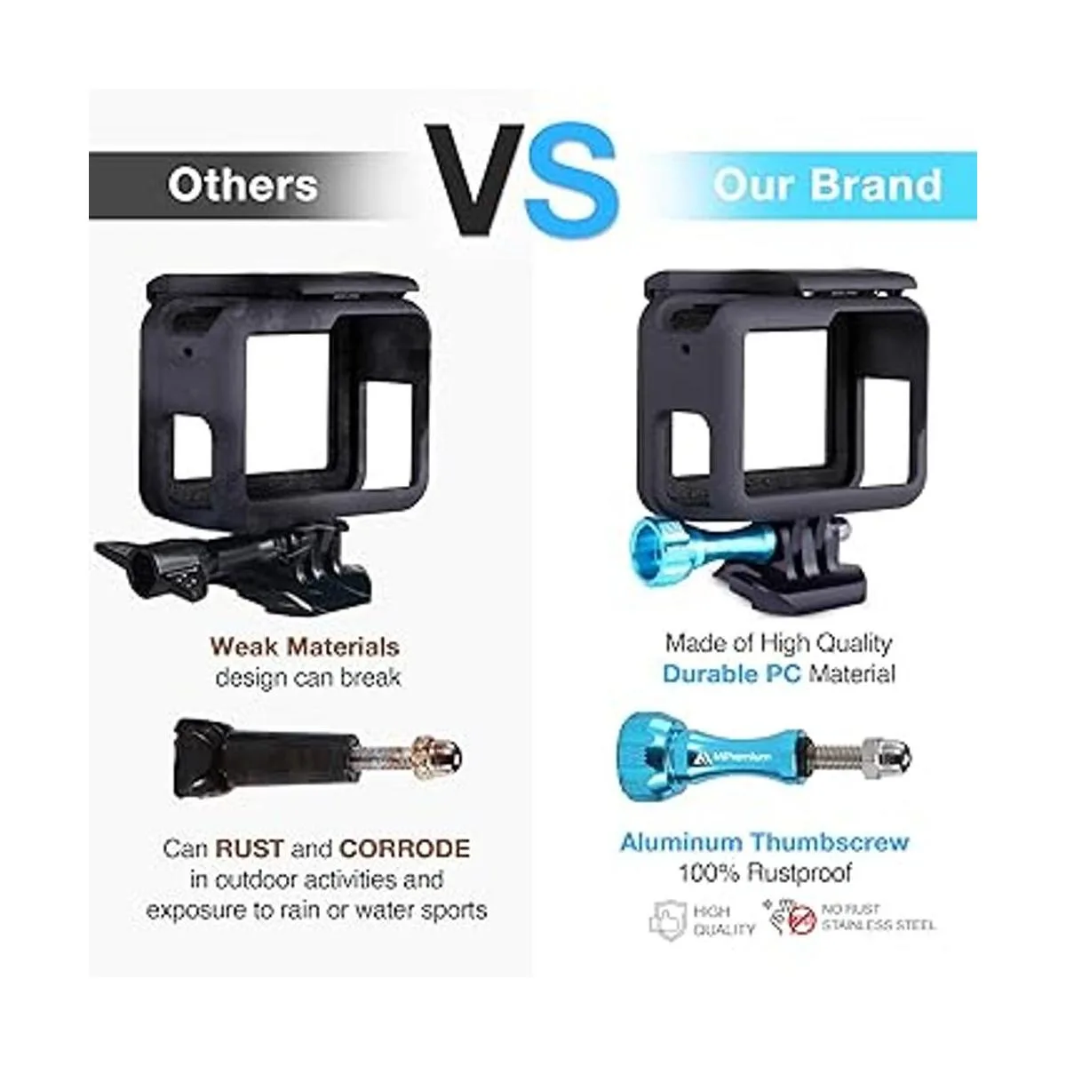 Nivel de tornillos oxidados Viene con un tornillo de pulgar de aluminio 100 antioxidante y un montaje de hebilla de liberación rápida con amplia gama de aplicaciones. La carcasa protectora MiPremium para GoPro viene con un tornillo de pulgar de aluminio y un soporte de hebilla de liberación rápida. Puedes conectar fácilmente tu Go Pro a accesorios como monopiés, palos de selfie, trípode, soporte de bicicleta, soporte de ventosa, soporte de casco, soporte de tabla de surf, soporte de manillar/poste, soportes para llevar y montar.