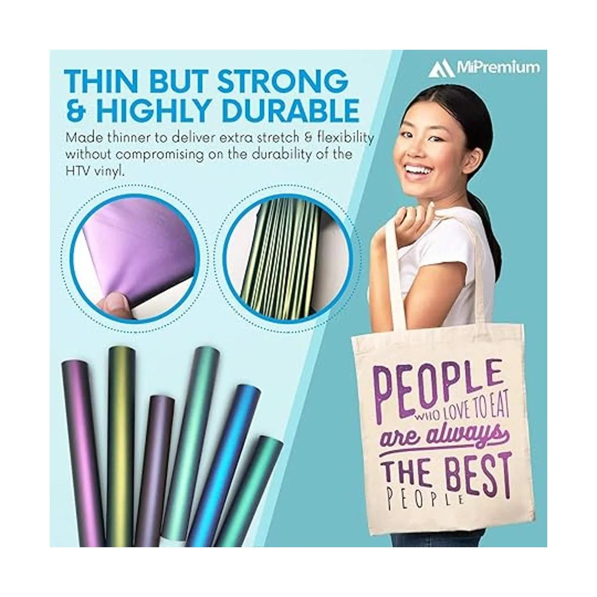 Delgado pero fuerte y altamente duradero: MiPremium variado camaleón degradado cambio de color vinilo está hecho más delgado para ofrecer extra elástico y flexibilidad sin comprometer la durabilidad del vinilo HTV. Esta película de transferencia de calor está diseñada para soportar un uso resistente y no se pela, agrieta o decolora. Su diseño extrafino ofrece una gran elasticidad y elasticidad que permite que las telas se estiren a través de movimientos naturales. Conserva la forma y tonalidad del color incluso después de un largo período y repetidos lavados.