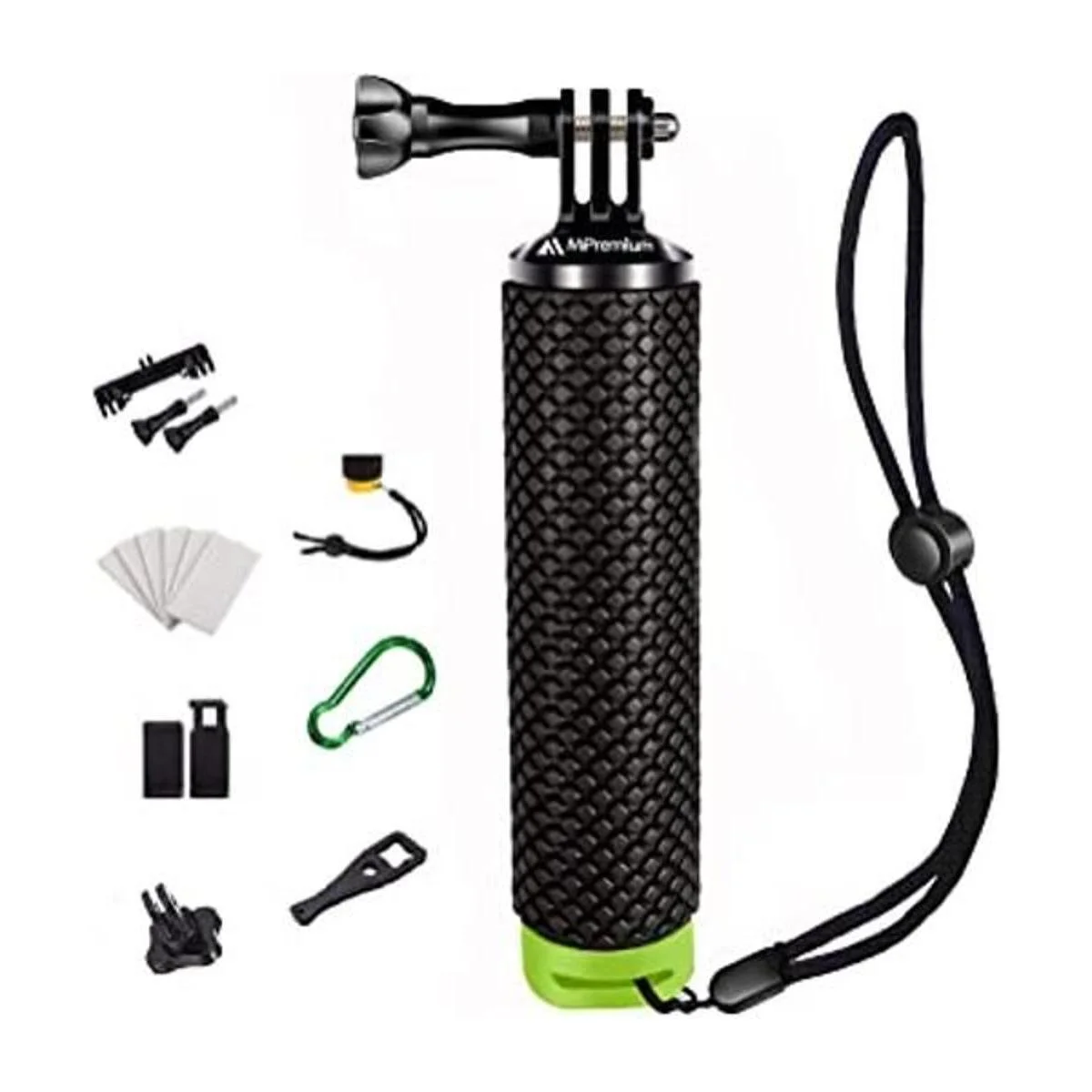 MiPremium Mango flotante impermeable compatible con cámaras GoPro Hero 9, 8, 7, 6, 5, 4, 3, 2, 1, sesión de color negro, plateado, además de accesorios de montaje en asa para deportes acuáticos y cámaras de acción verde