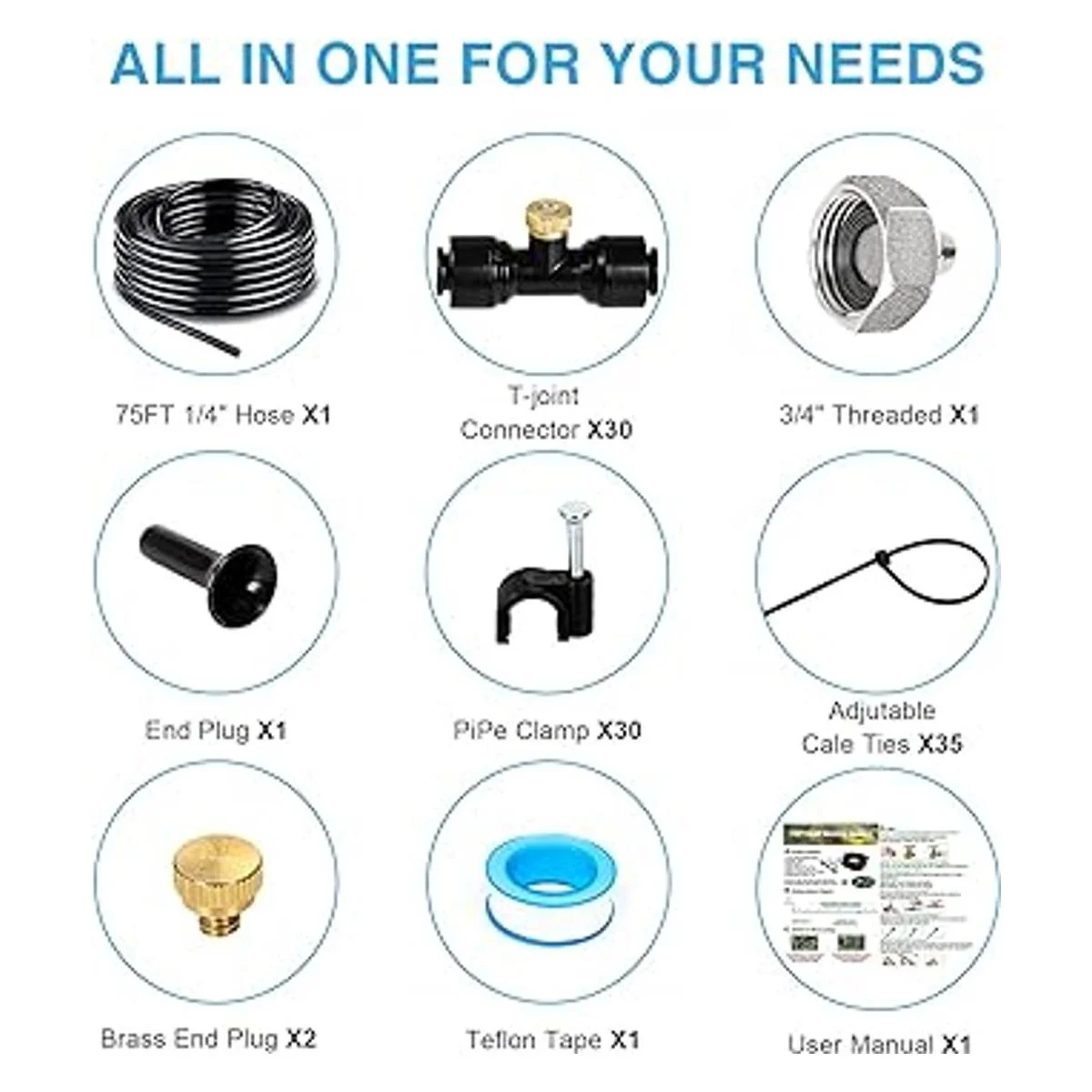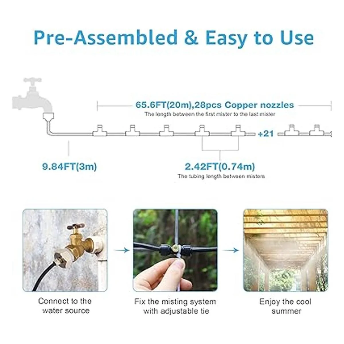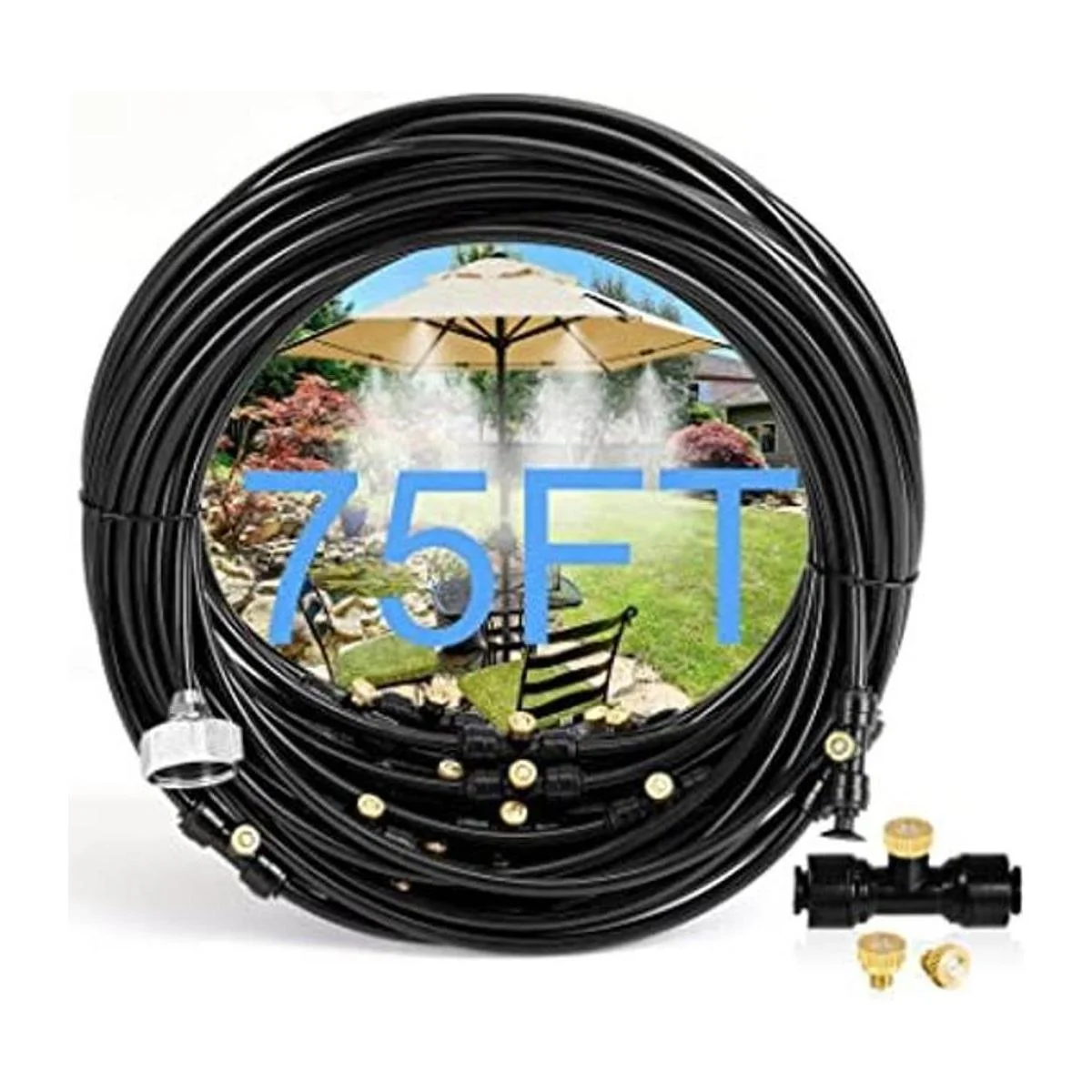 Misters para patio exterior, sistema de refrigeración de nebulización de 75 pies para patio, línea de nebulización de 75 pies 28 boquillas de niebla adaptador de latón de 34 pulgadas, sistema de nebulización al aire libre para patio, jardín, invernadero, trampolín para parque acuático