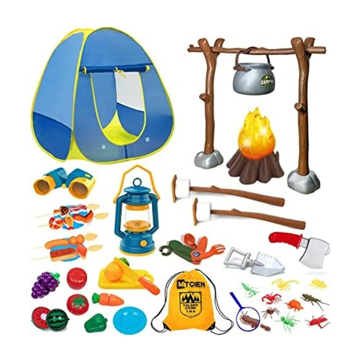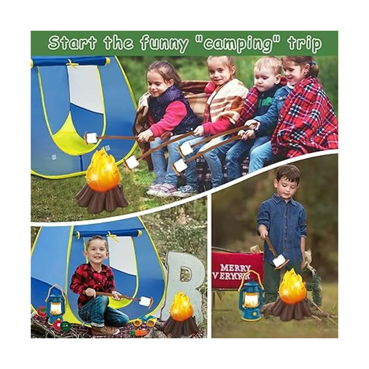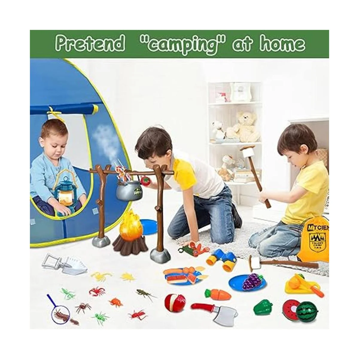 MITCIEN Juego de campamento para niños con fogata, tienda de campaña de juego, binoculares, linterna de aceite, niños pequeños que cortan frutas, malvavisco, juguetes de campamento para niños y niñas de 3 a 5 años en adelante, juguetes para interiores y exteriores