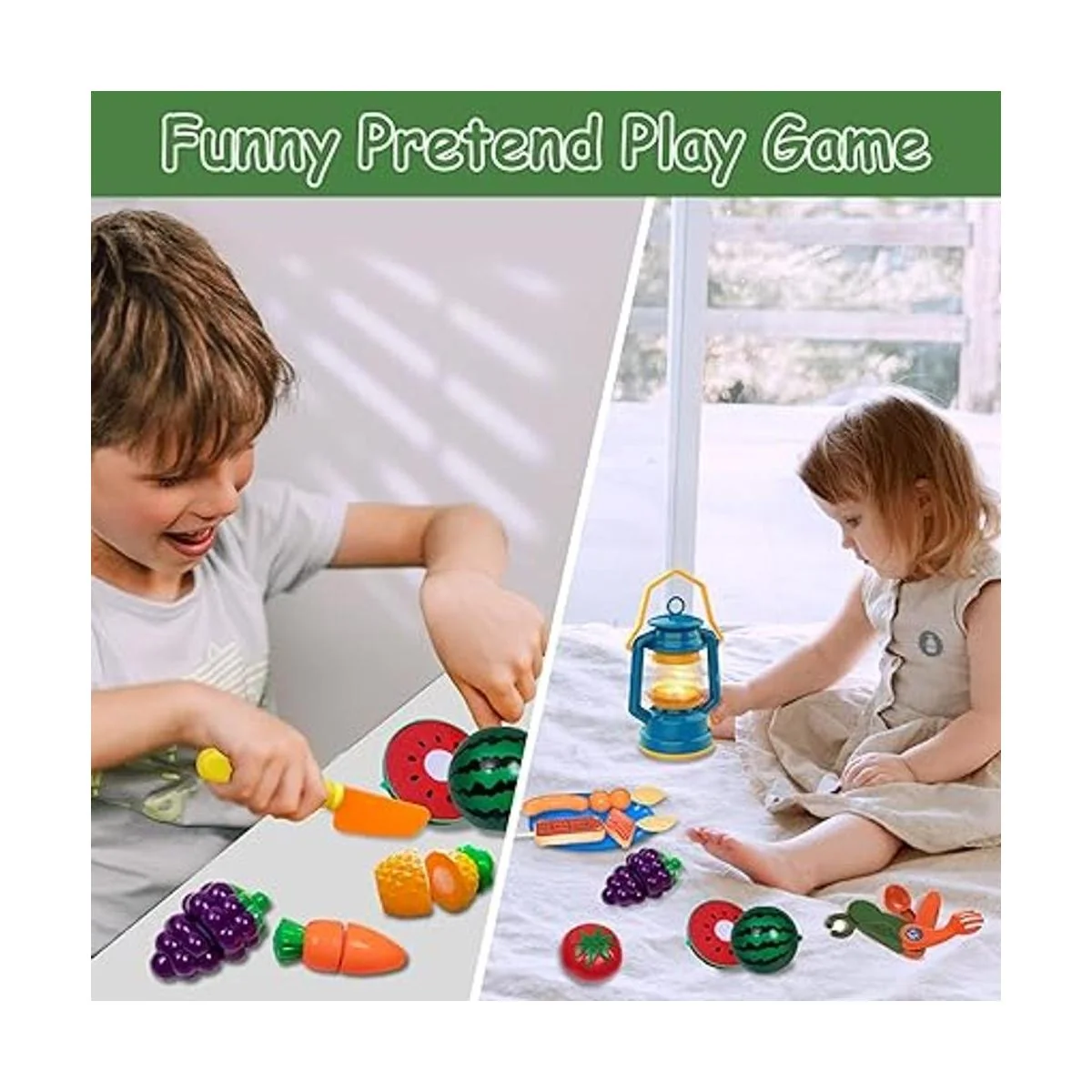 Juego de simulación: contiene más de 30 piezas de juguete, incluye tienda de campaña, fogata, sartén, frutas cortadas, comida de juguete, linterna, etc. Adecuado para juegos de simulación de niños y clase de juego dramática en preescolar. Pueden cortar las frutas, hornear los SMores, hervir el agua, freír el huevo… Realmente divertido