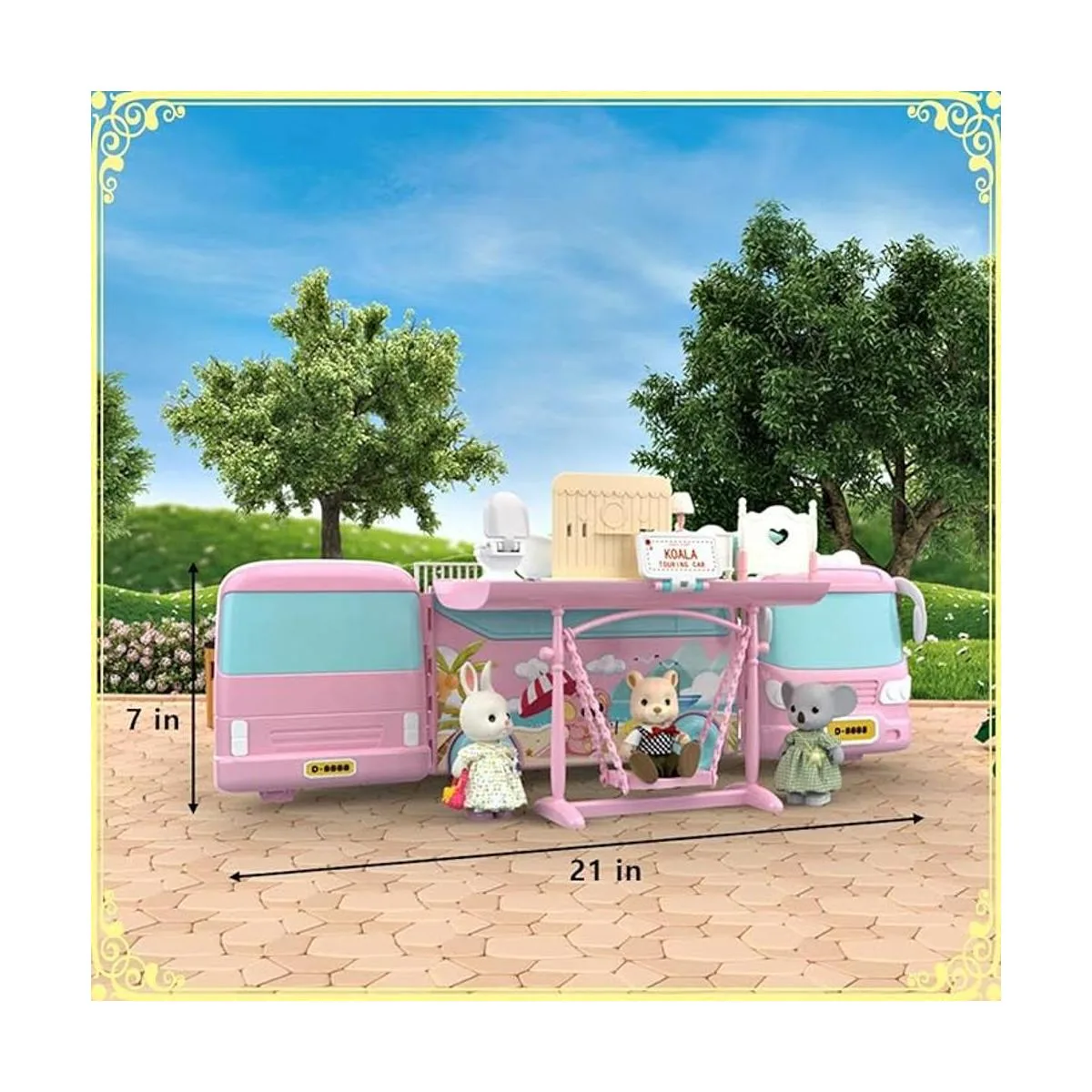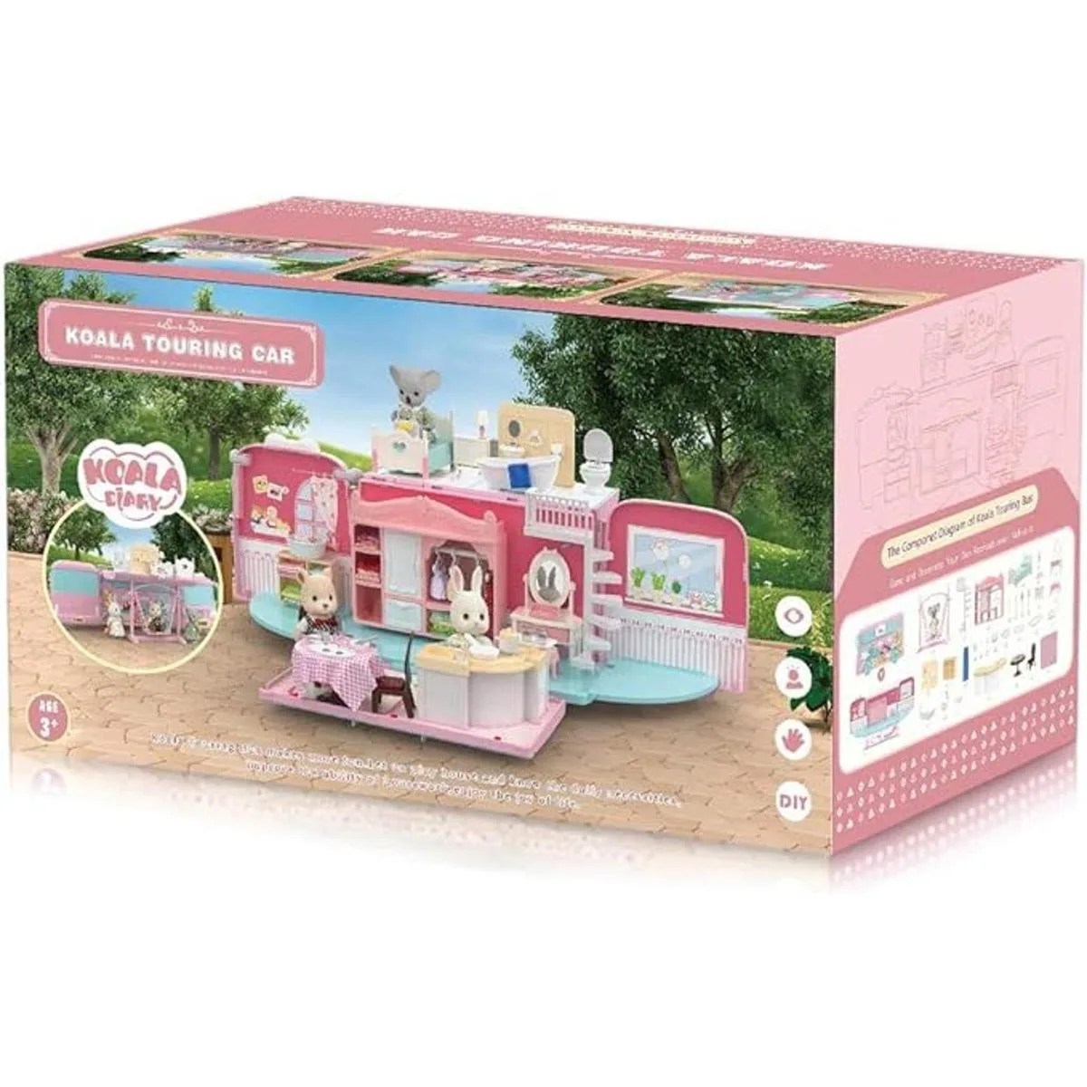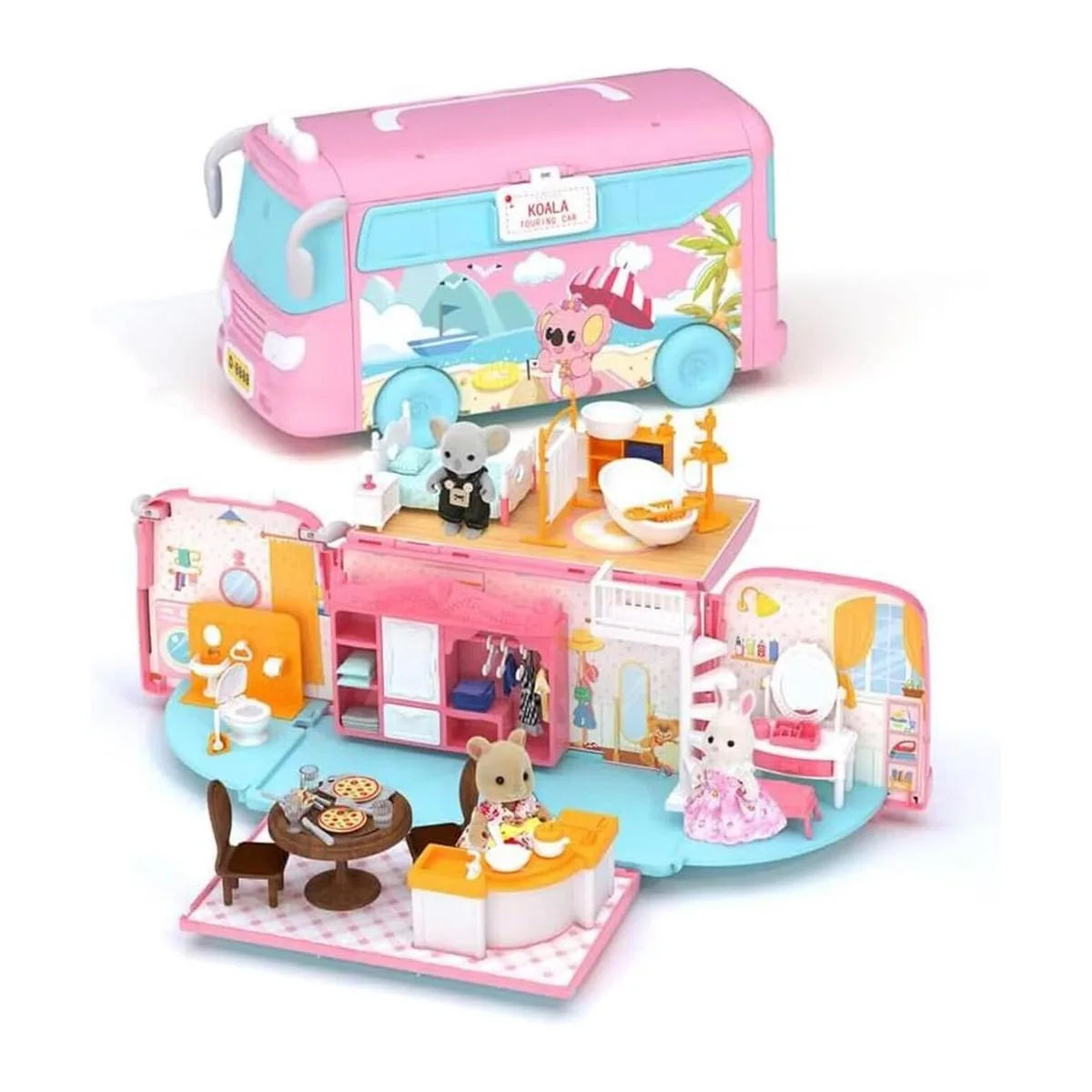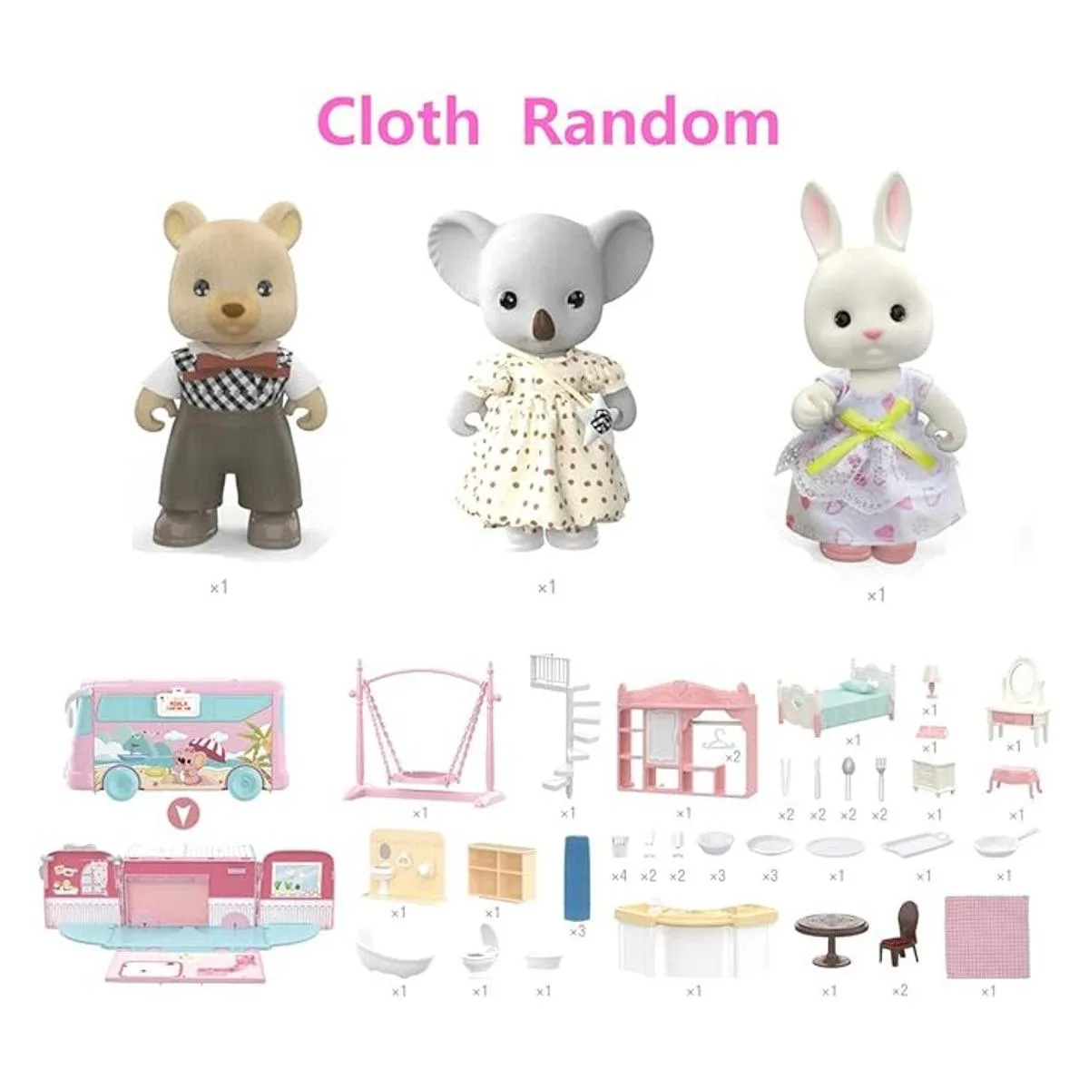 Tres bonitos animales en miniatura: conejito, oso y Koala con todos los muebles caben perfectamente dentro de la caravana, equipado con un práctico asa de transporte para un fácil transporte donde quiera que vayas. Diviértete en casa, en la casa de un amigo o en el viaje. Los niños tienen asas resistentes que permiten a los niños y padres llevar el juguete para jugar portátil.
