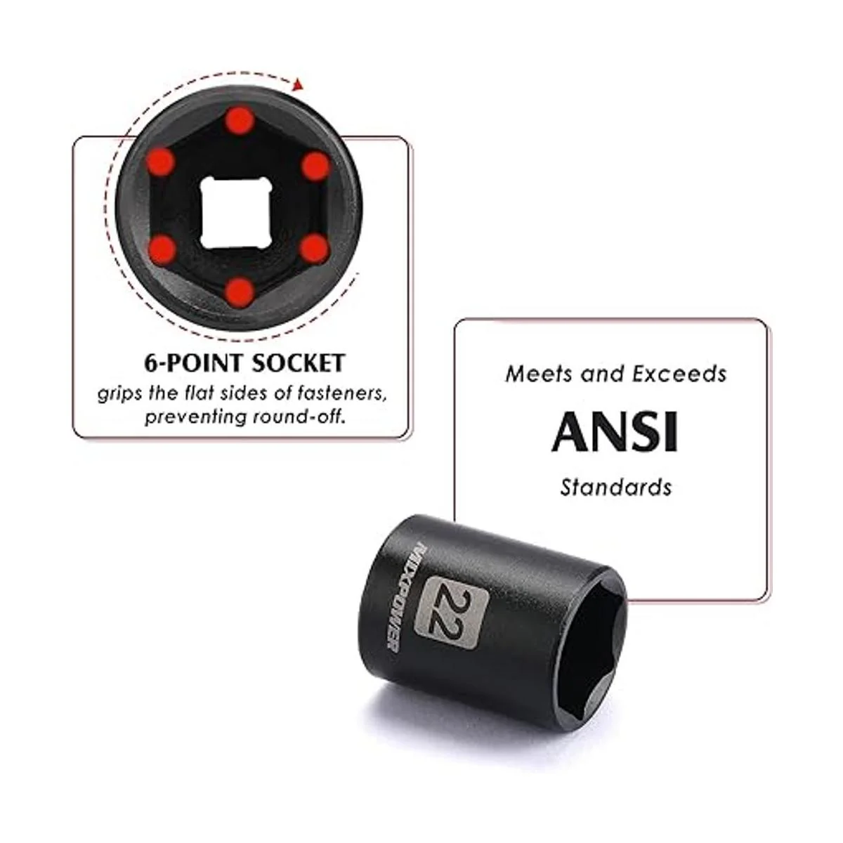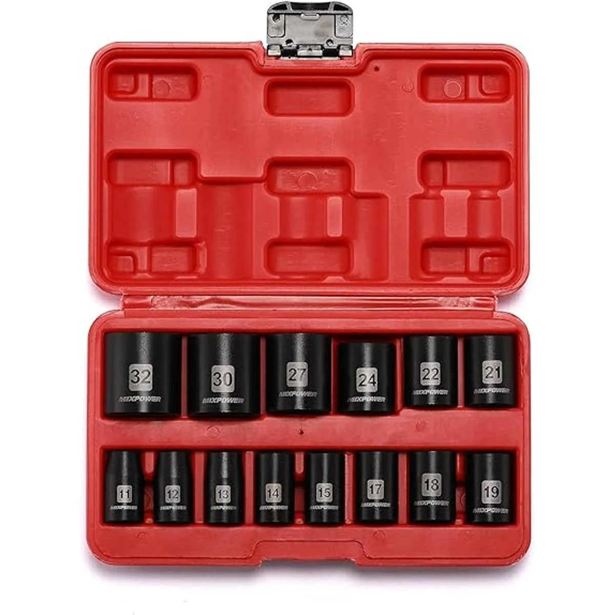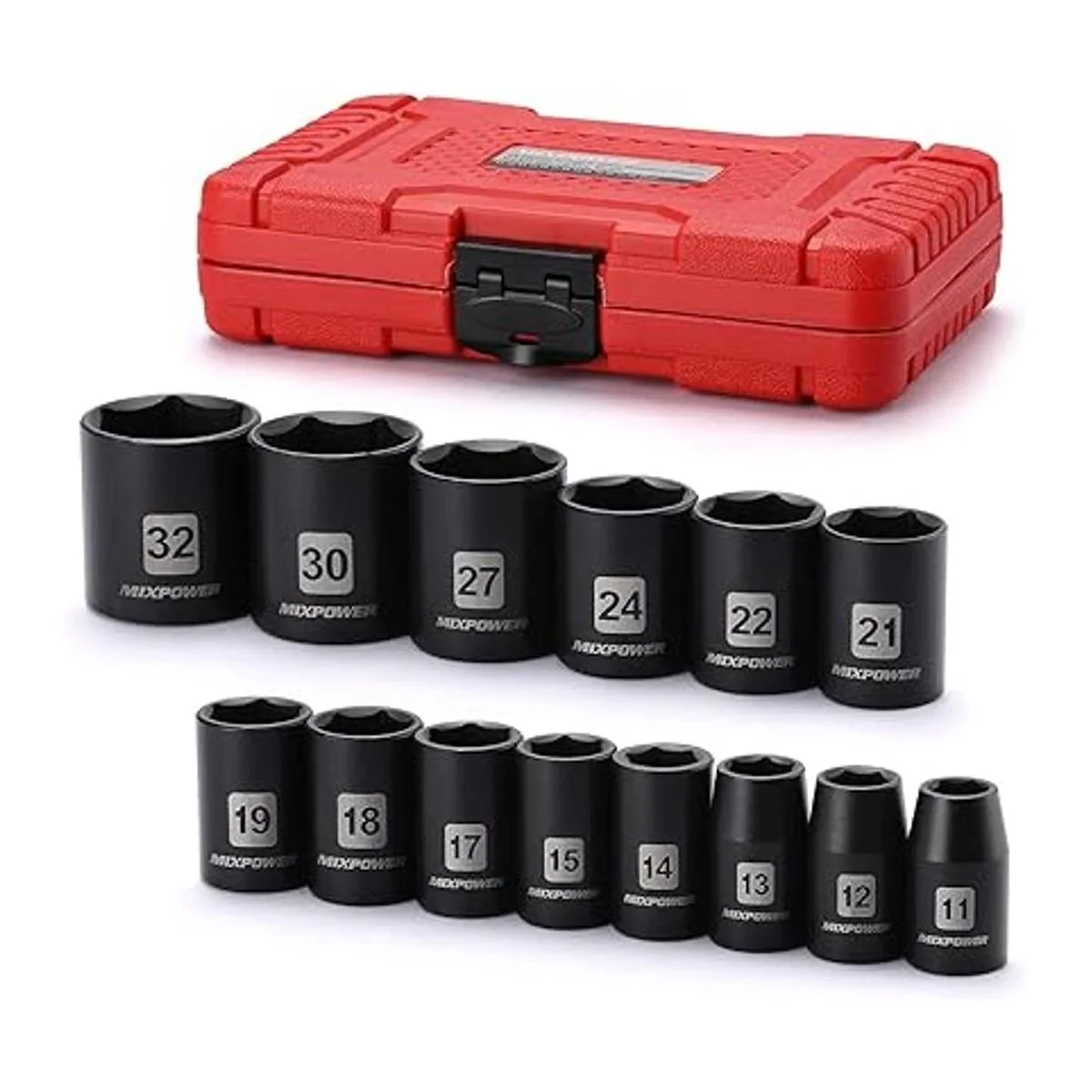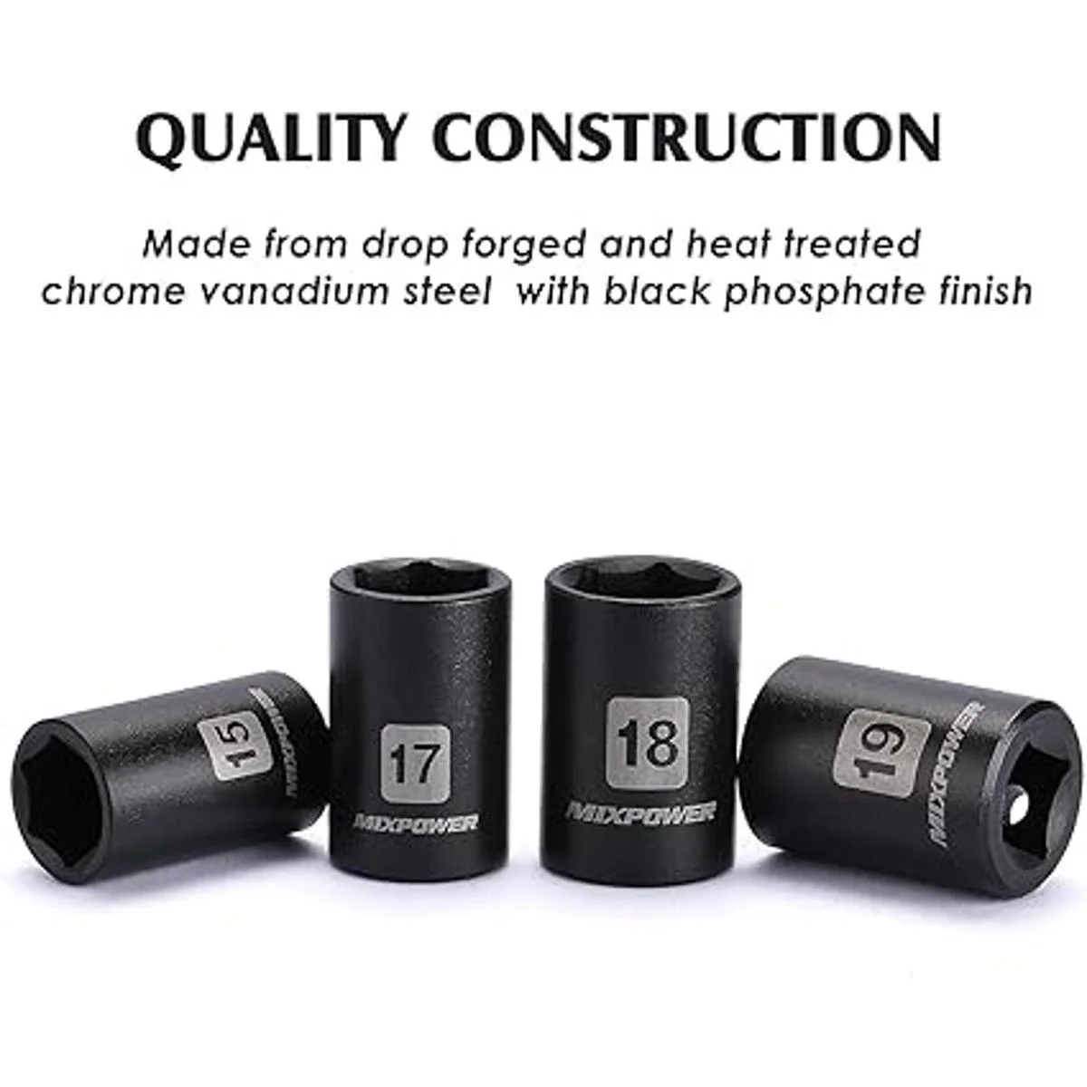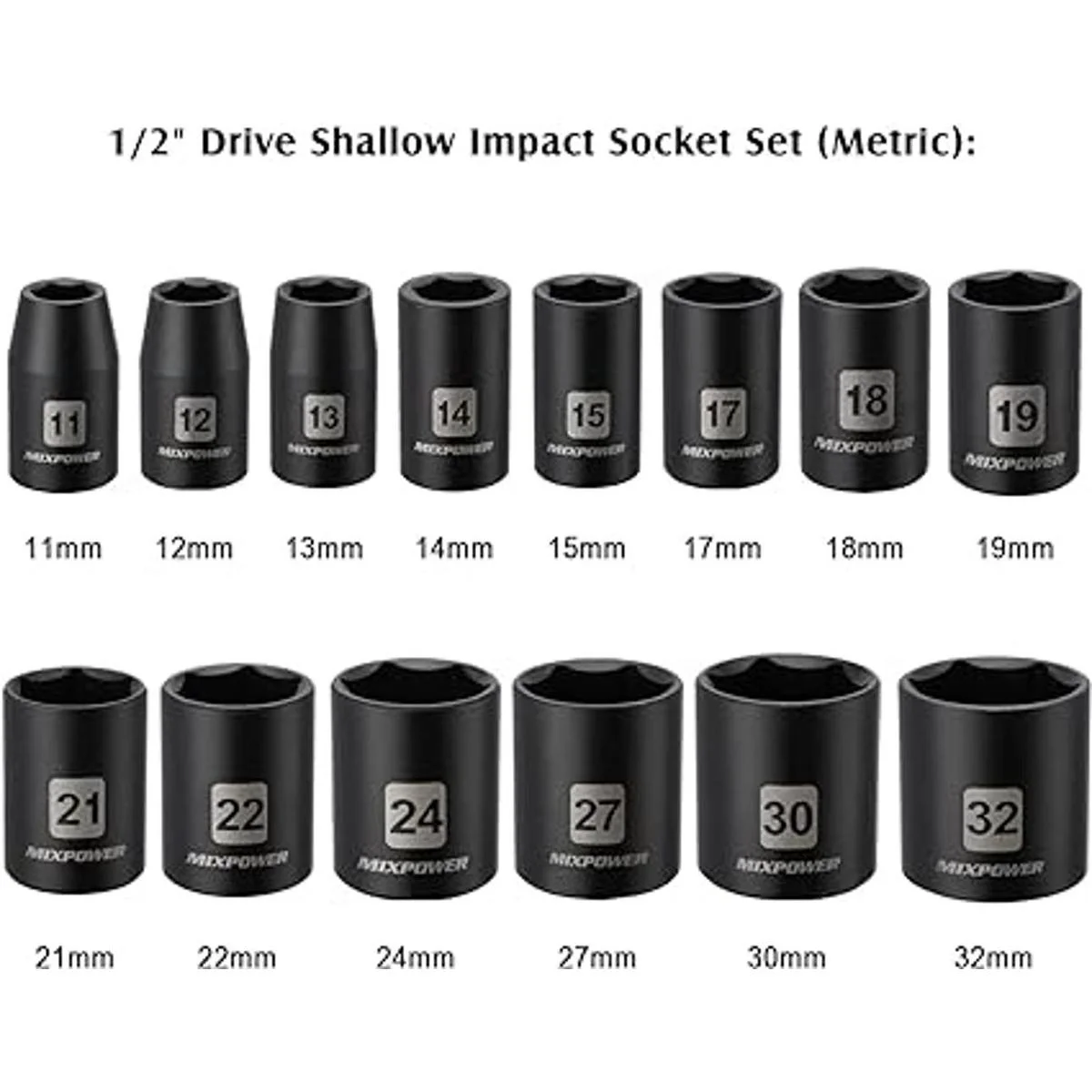 MIXPOWER Juego de 14 llaves de impacto poco profundo de 12 pulgada, 0.4331.260 in, CRV, métrica, 6 puntos, poco profundas, 14 piezas de 12 pulgada Dr. Shallow Socket