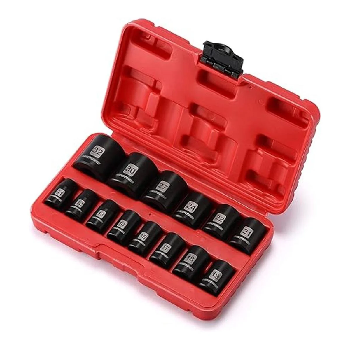 El juego incluye: 14 piezas de 1/2 pulgada de impulsión de impacto poco profundo: 0.433 in, 0.472 in, 0.512 in, 14, mm, 15, mm, 0.669 in, 18, mm, 0.748 in, 21, 22, 24, 27, 30, 1.260 in.