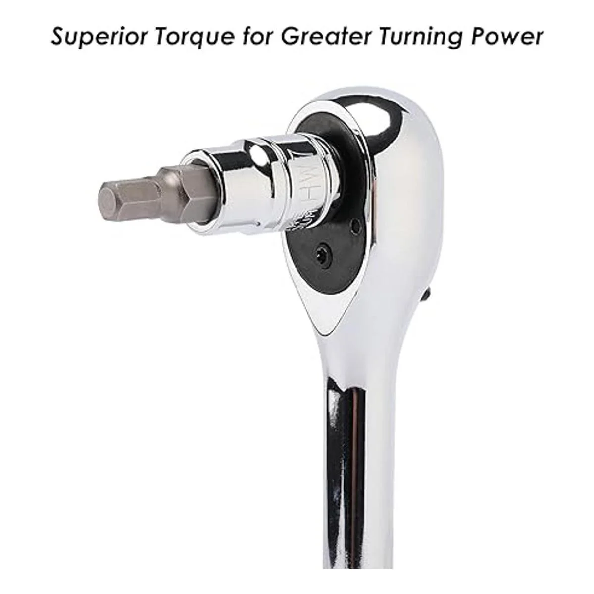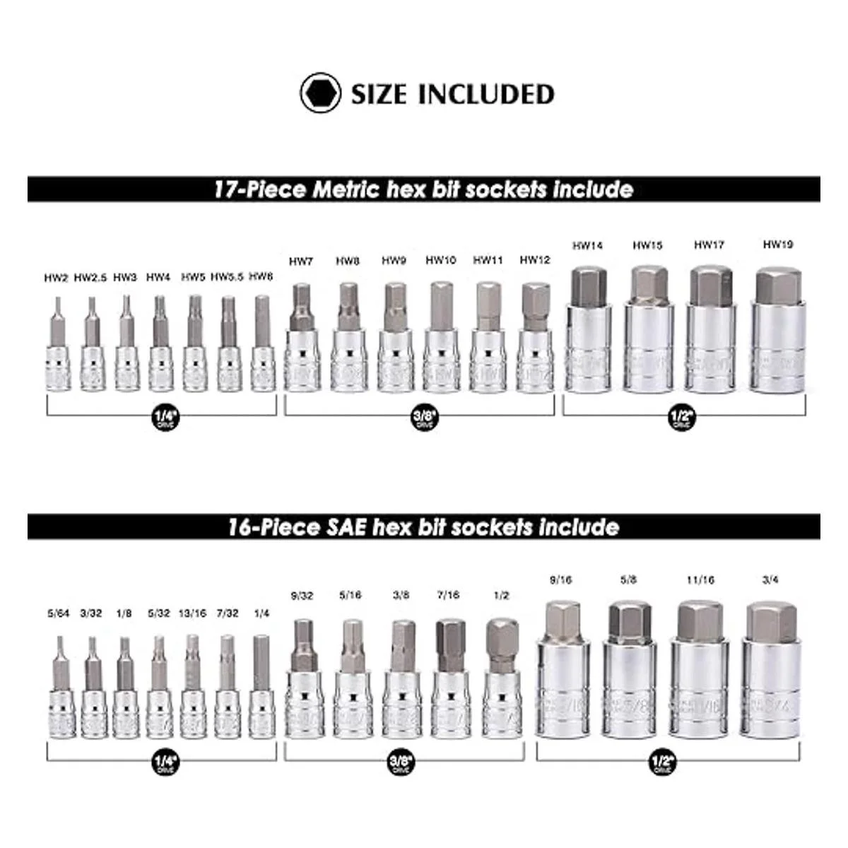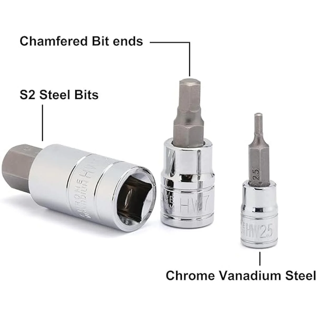 El juego incluye: 16 llaves hexagonales métricas que incluyen: 1/4 de pulgada: 0.079 in, 0.098 in, 0.118 in, 0.157 in, 0.197 in, 0.217 in, 0.236 in. Unidad de 3/8 pulgadas: 0.276 in, 0.315 in, 0.354 in, 0.394 in, 0.433 in, 0.472 in. Unidad de 1/2 pulgadas: 0.551 in, 0.591 in, 0.669 in, 0.748 in