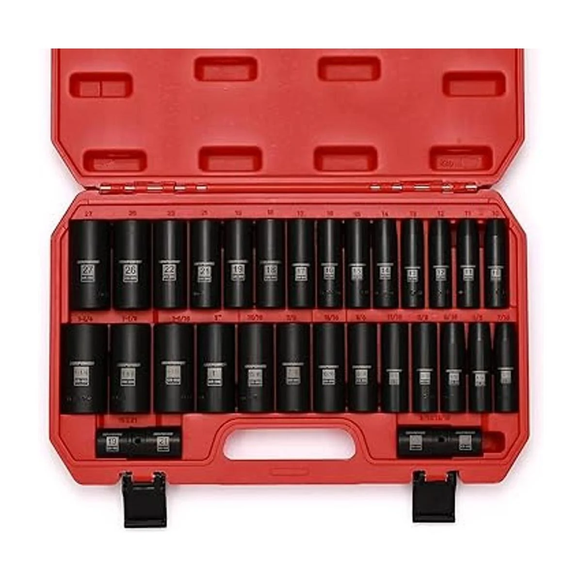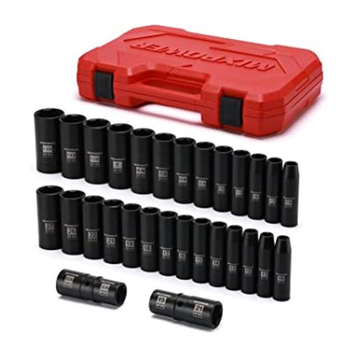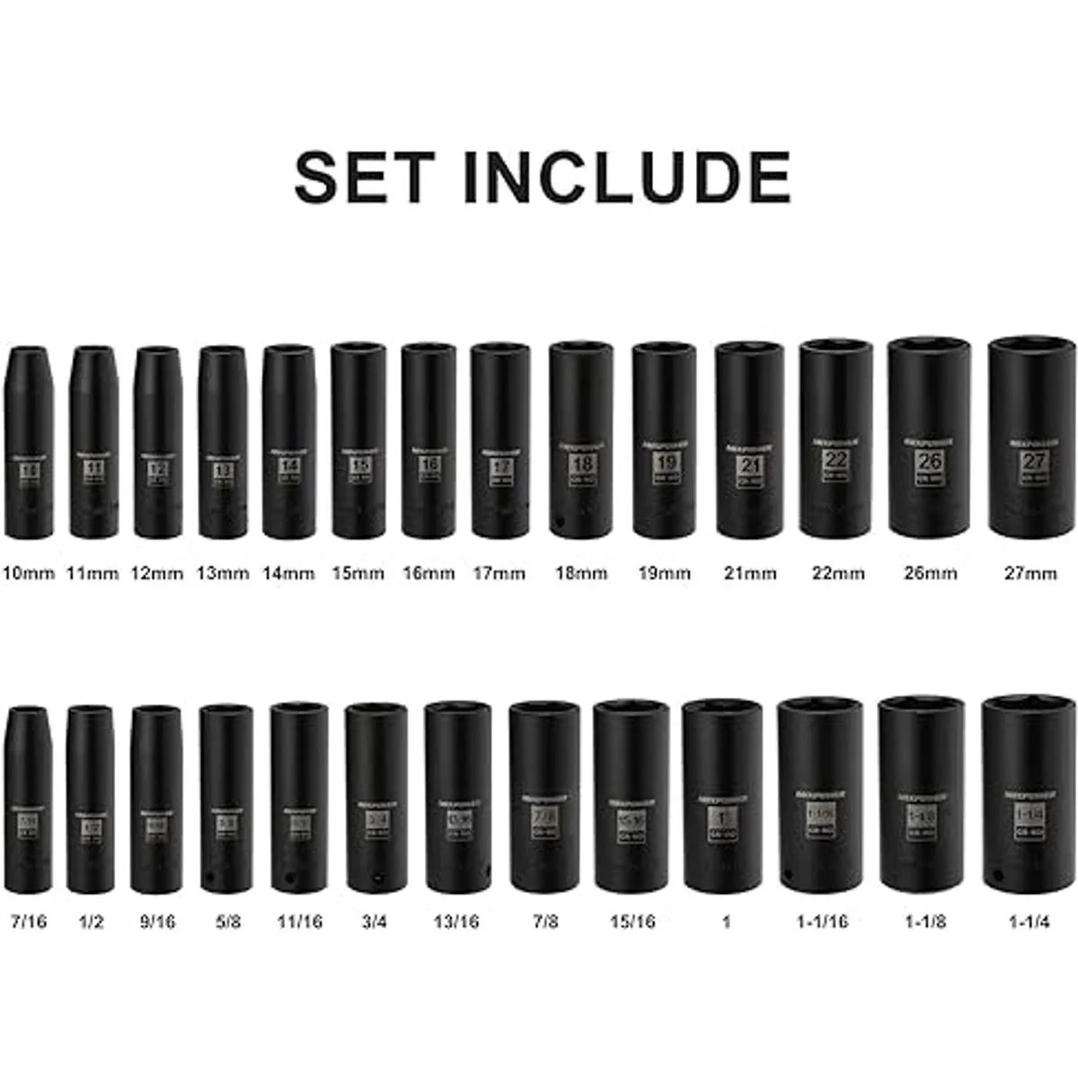 MIXPOWER Juego de enchufes de impacto profundo de 12 pulgadas, acero CrMo, juego de 29 piezas, métrico y SAE, 0.3941.063 in, 78 pulgadas 114 pulgadas, incluye enchufe de tuerca abatible, 0.748 in x 0.827 in, 34 pulgadas x 1316 pulgadas, caja de almacenamiento resistente