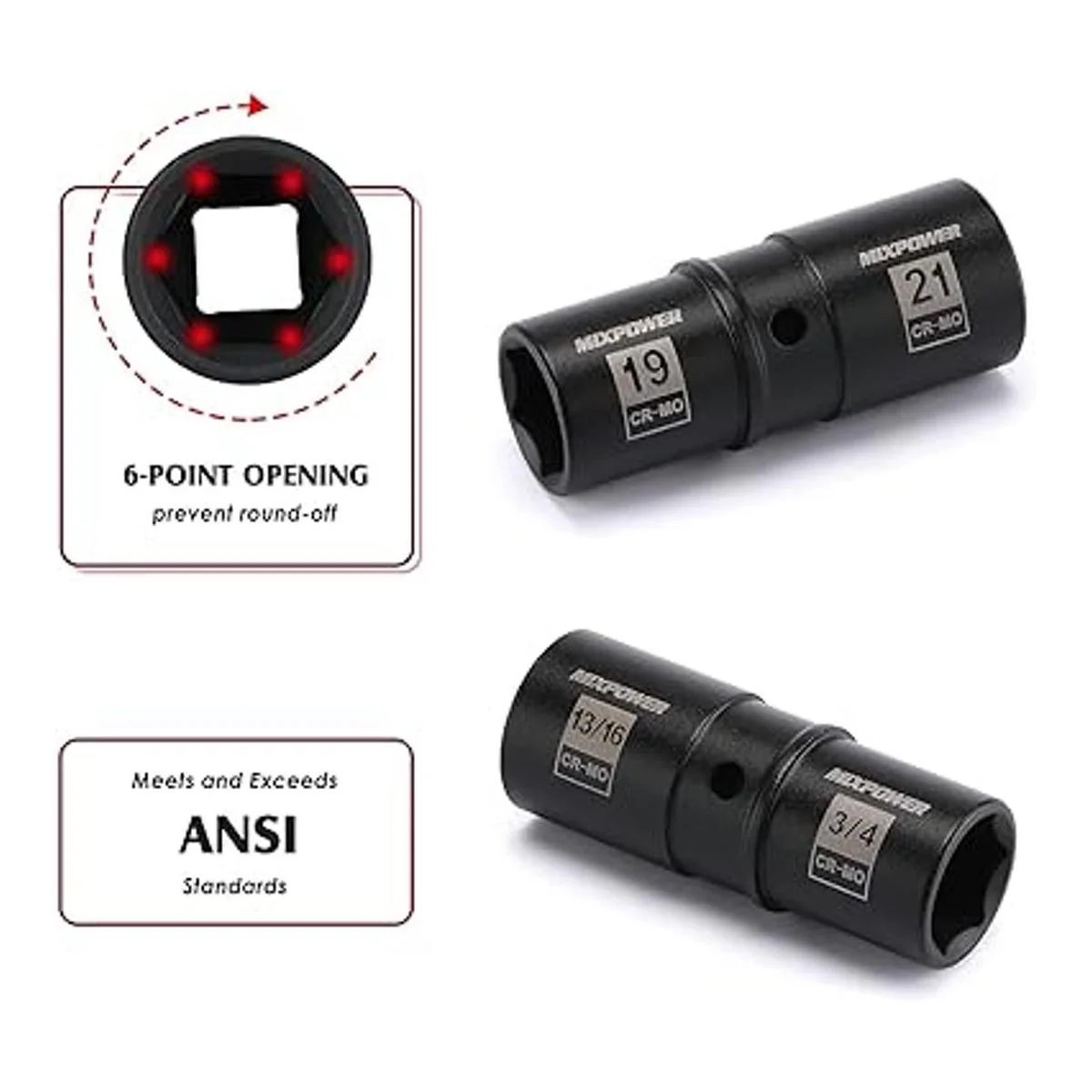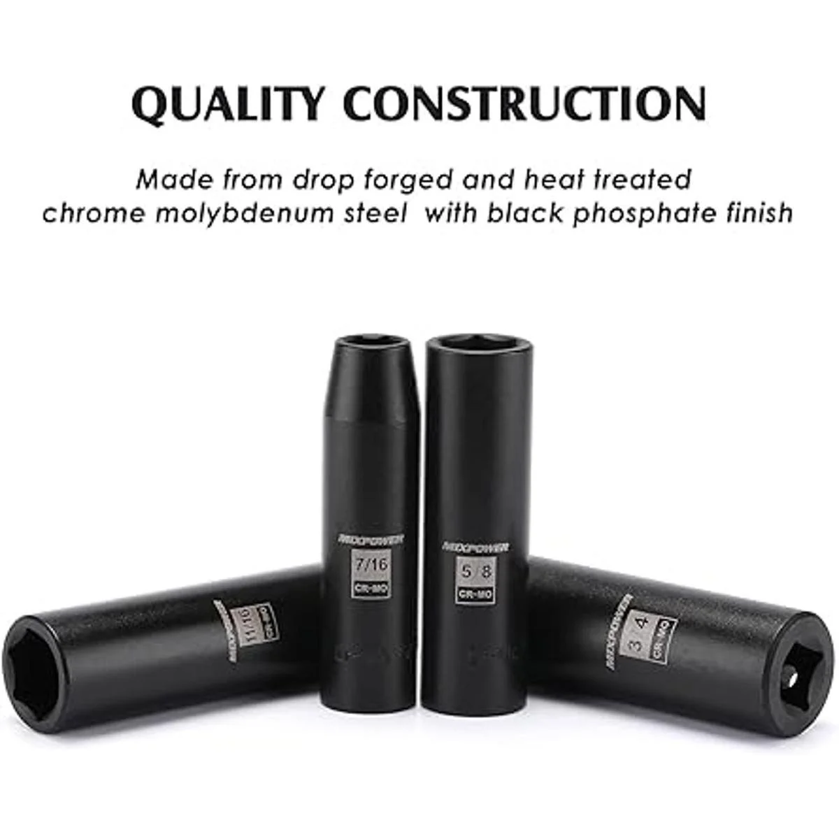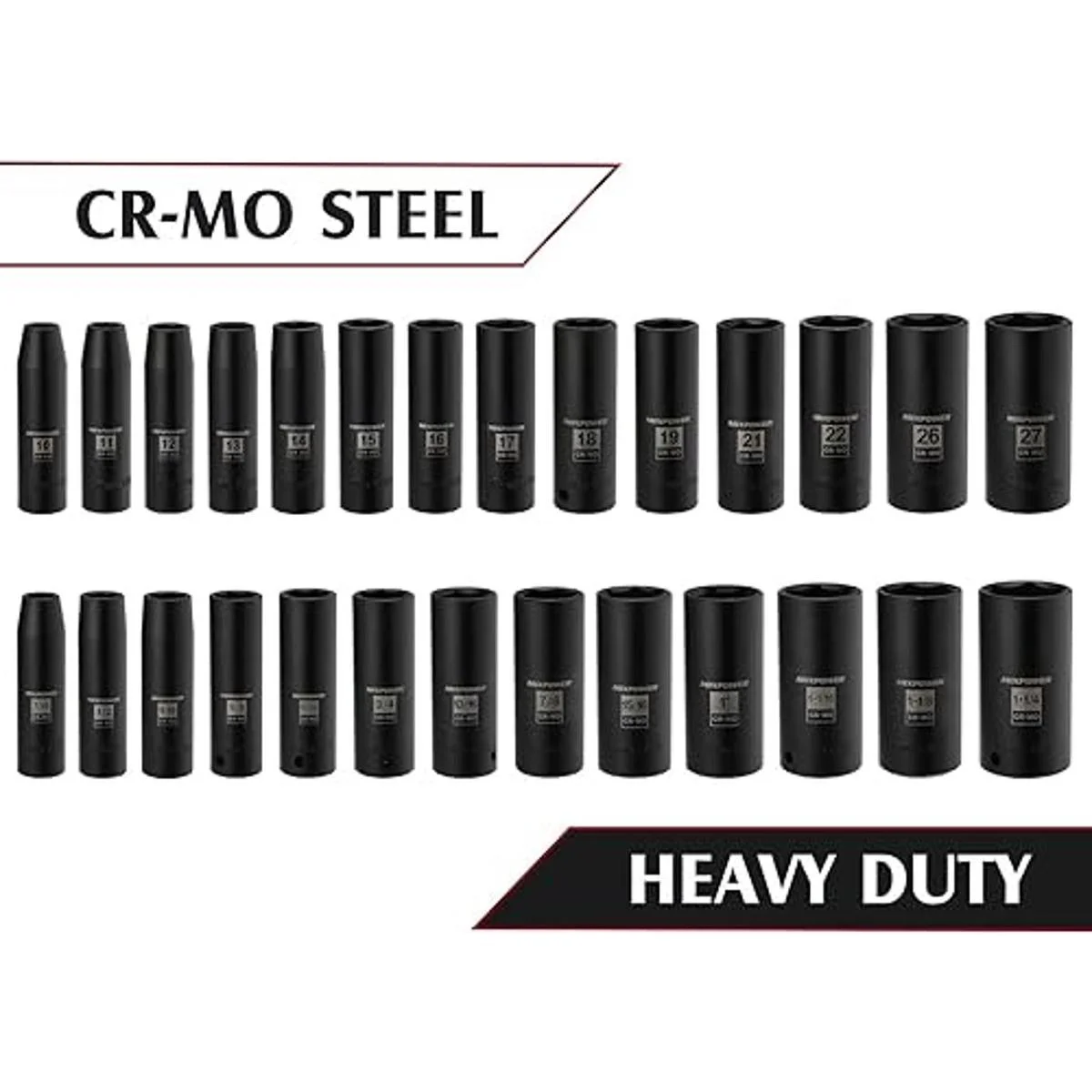 MIXPOWER Juego de enchufes de impacto profundo de 12 pulgadas, acero CrMo, juego de 29 piezas, métrico y SAE, 0.3941.063 in, 78 pulgadas 114 pulgadas, incluye enchufe de tuerca abatible, 0.748 in x 0.827 in, 34 pulgadas x 1316 pulgadas, caja de almacenamiento resistente