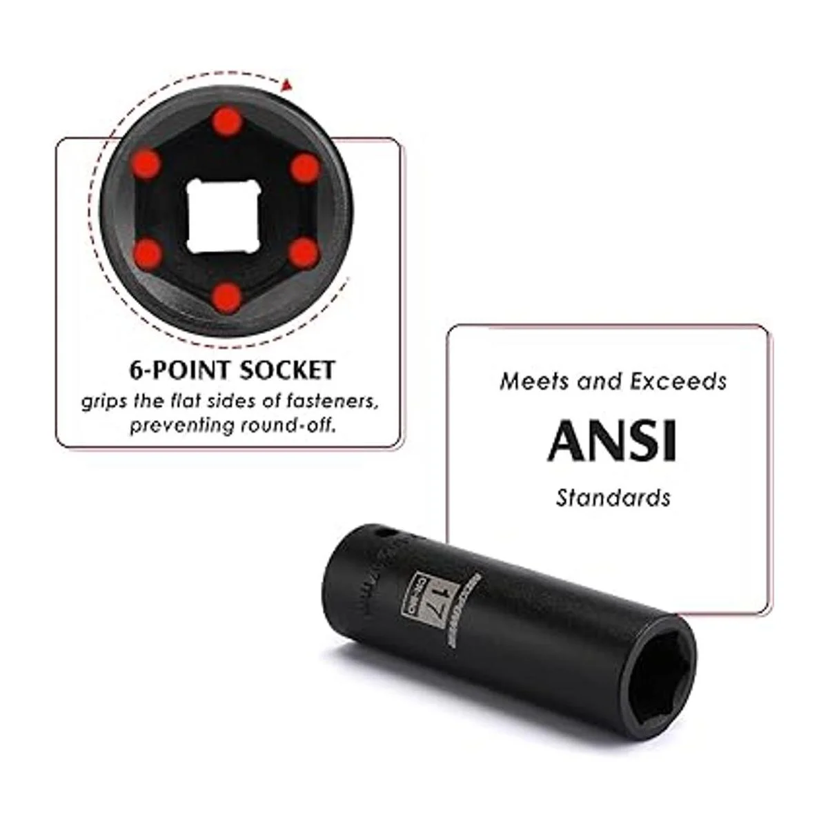 El juego incluye: 14 juego de enchufes de impacto profundo Dr. de 1/2 pulgadas métrico: 0.394 in, 0.433 in, 0.472 in, 0.512 in, 0.551 in, 0.591 in, 0.630 in, 0.669 in, 0.709 in, 0.748 in, 0.827 in, 0.866 in, 1.024 in, 1.063 in. 13 Juego de enchufes de impacto profundo Dr. de 1/2 pulgada SAE: 7/8, 1/2, 9/16, 5/8, 11/16, 3/4, 13/16, 7/8, 15/16, 1, 1116, 11/8, 11/4 2 calcetines de tuerca abatible de 1/2 de 1/2 de 1/2 et: 0.669 in17 0.354 in, 3/413/16 pulgadas