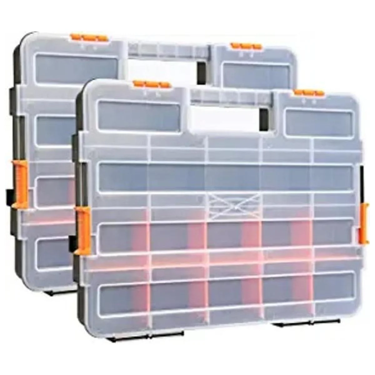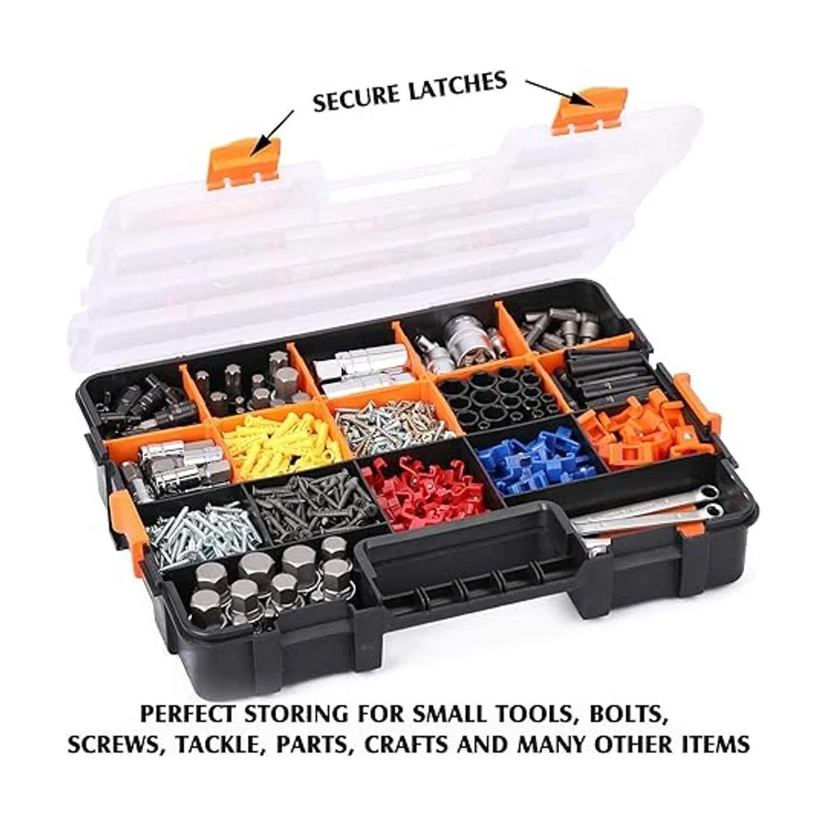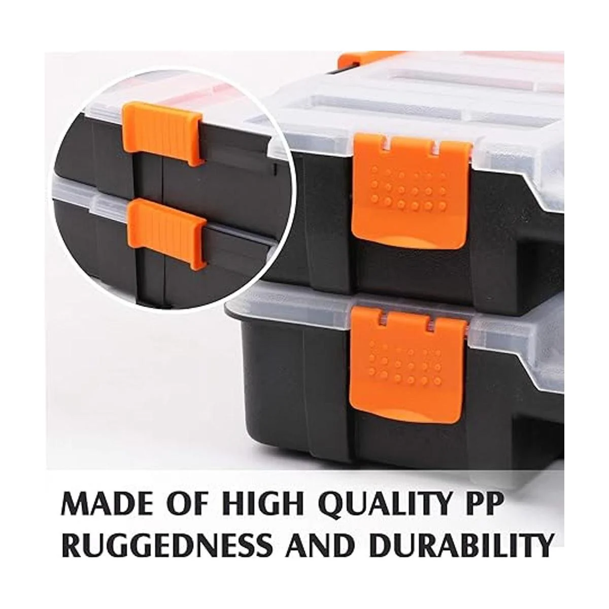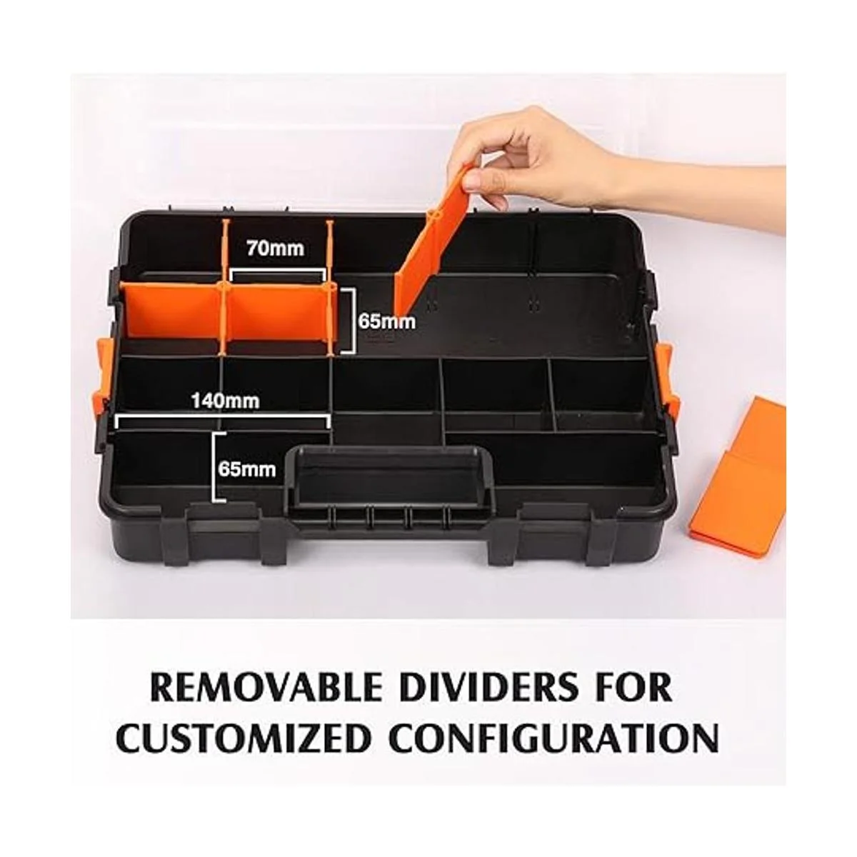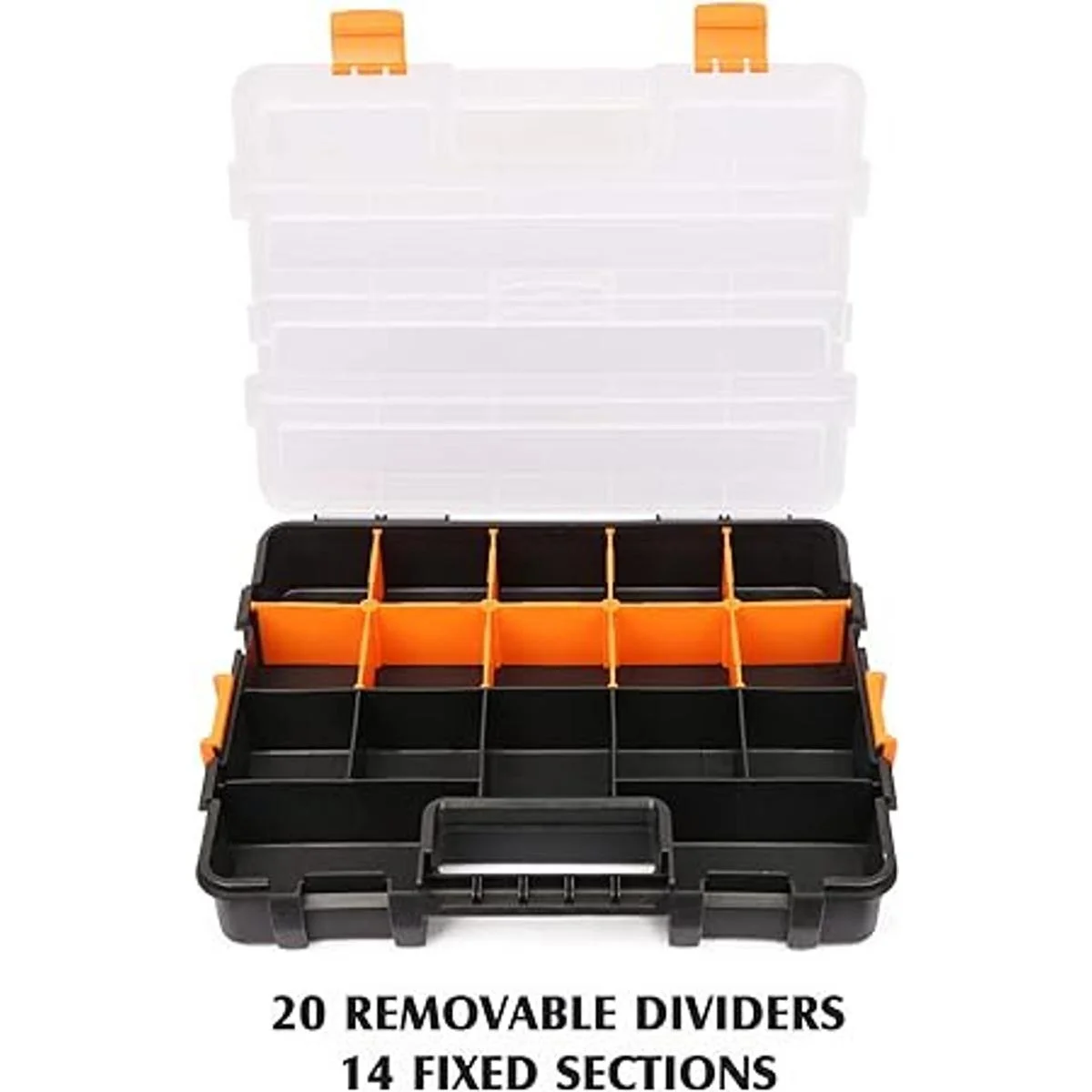 MIXPOWER Juego organizador de caja de herramientas de 15 pulgadas, 20 divisores extraíbles, caja de plástico duradera, excelente para tornillos, tuercas, piezas pequeñas, juego de 2 piezas negro y naranja de 34 compartimentos