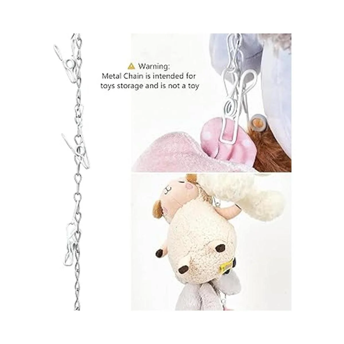 Fácil de usar: los clips ya están montados en la cadena de metal, no requiere montaje. Los clips son extraíbles, puedes ajustar la distancia entre ellos de acuerdo con el tamaño de los juguetes para obtener una mejor visualización. Adecuado para animales de peluche, juguetes de peluche y otros accesorios. La cadena de juguetes de peluche es una manera ideal de almacenar y mostrar los juguetes de tu hijo en dormitorios y salas de juegos.
