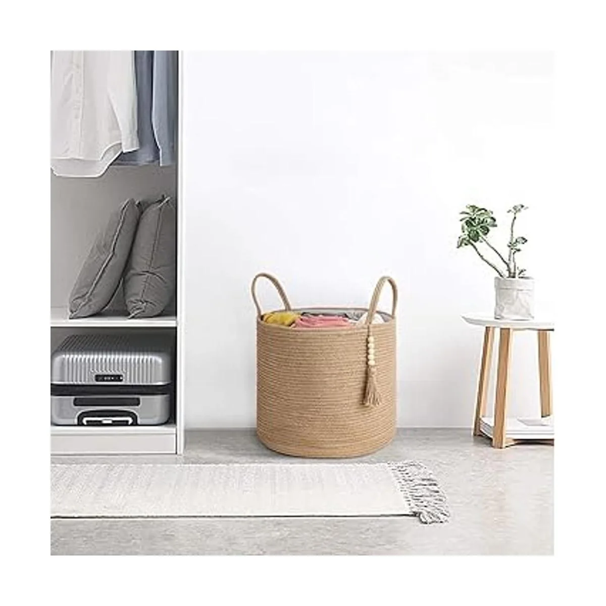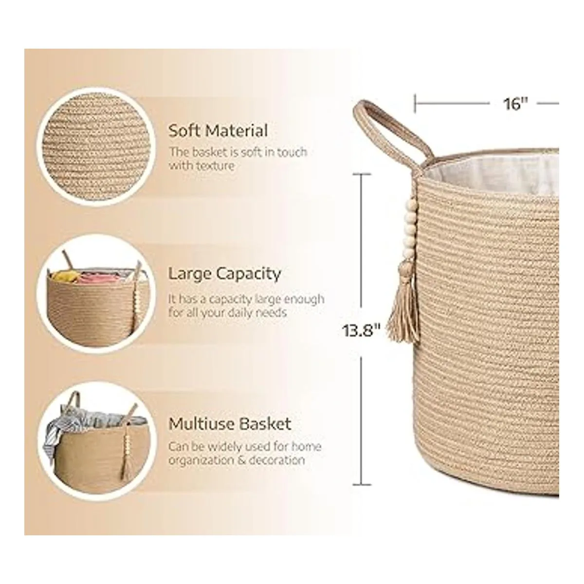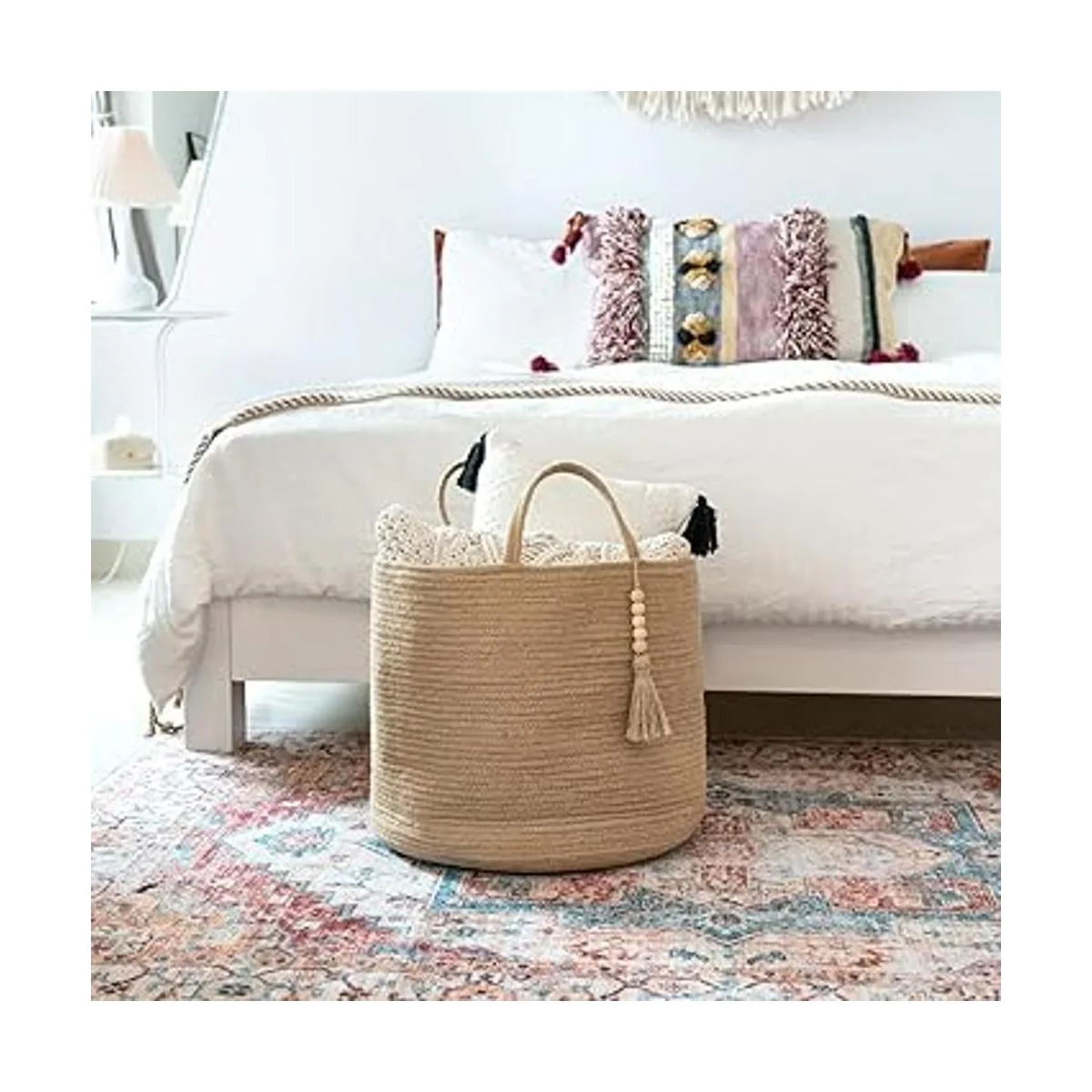 Mkono Canasta de almacenamiento tejida, canasta decorativa de cuerda natural con cuentas de madera para mantas, juguetes, ropa, zapato y plantas, contenedor organizador con asas, decoración para la sala de estar, yute, 16 pulgadas de ancho x 13.8 pulgadas de largo