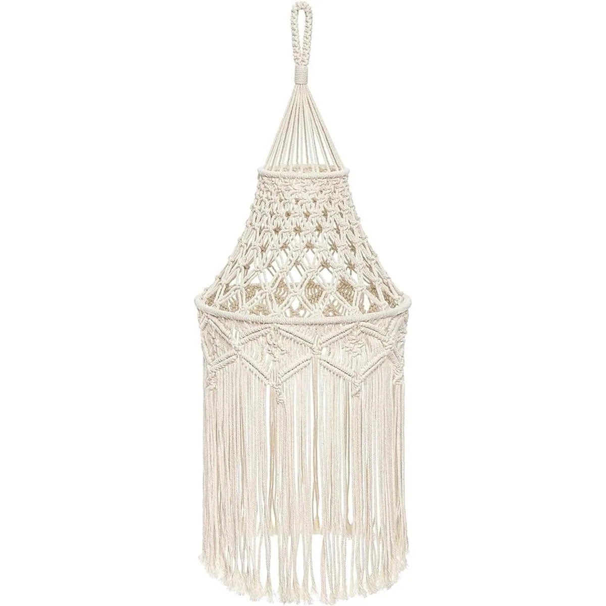 Esta hermosa pantalla de macramé está hecha con cuerda de algodón natural y por un diseño único. Este diseño único y elegante traerá un ambiente bohemio a tu habitación y belleza tu espacio. No incluye bombilla/enchufe.