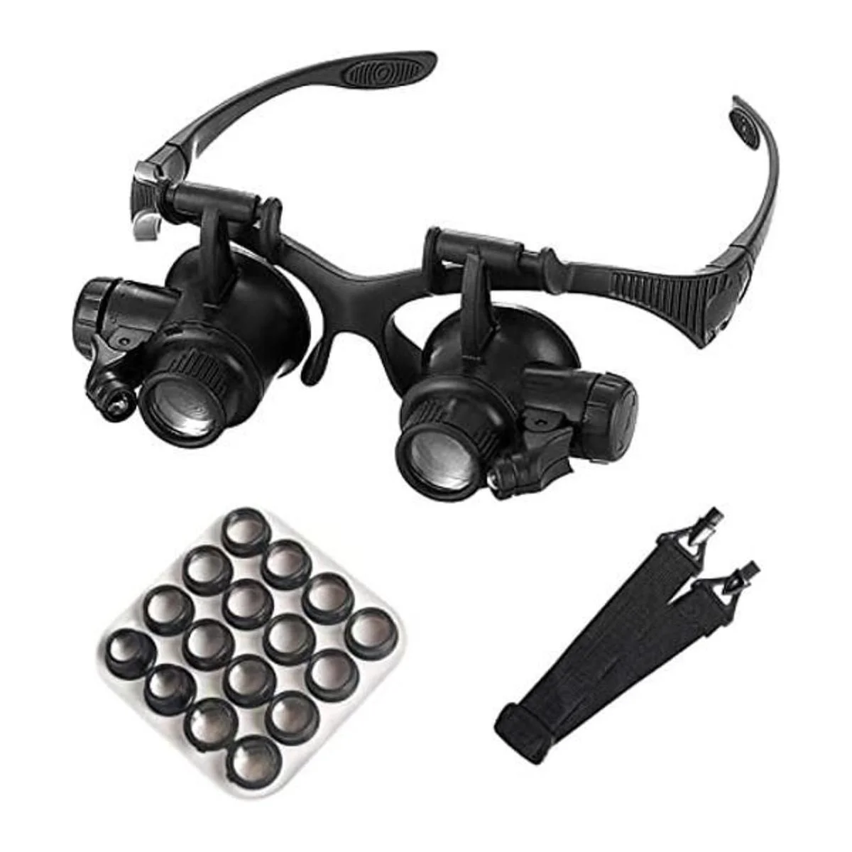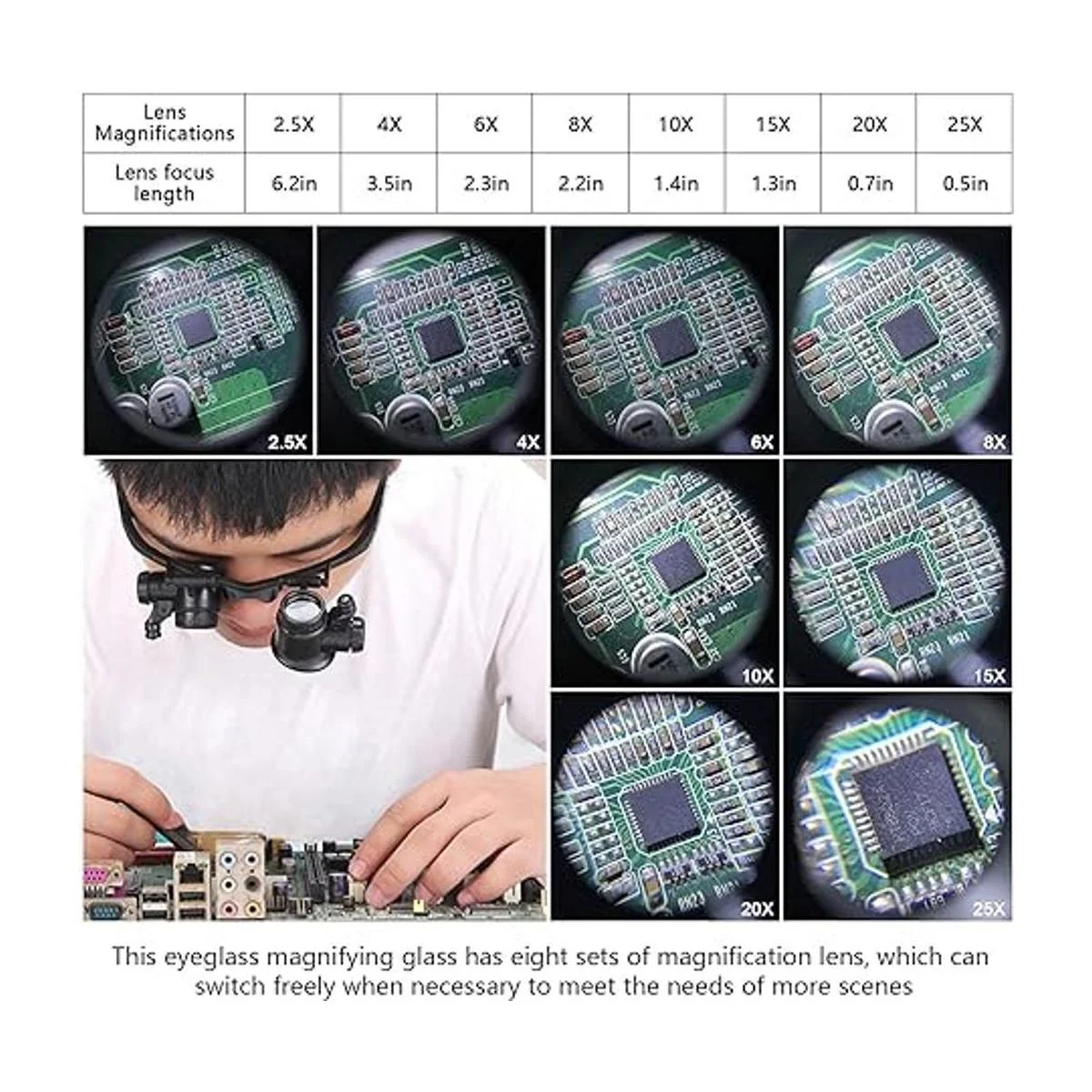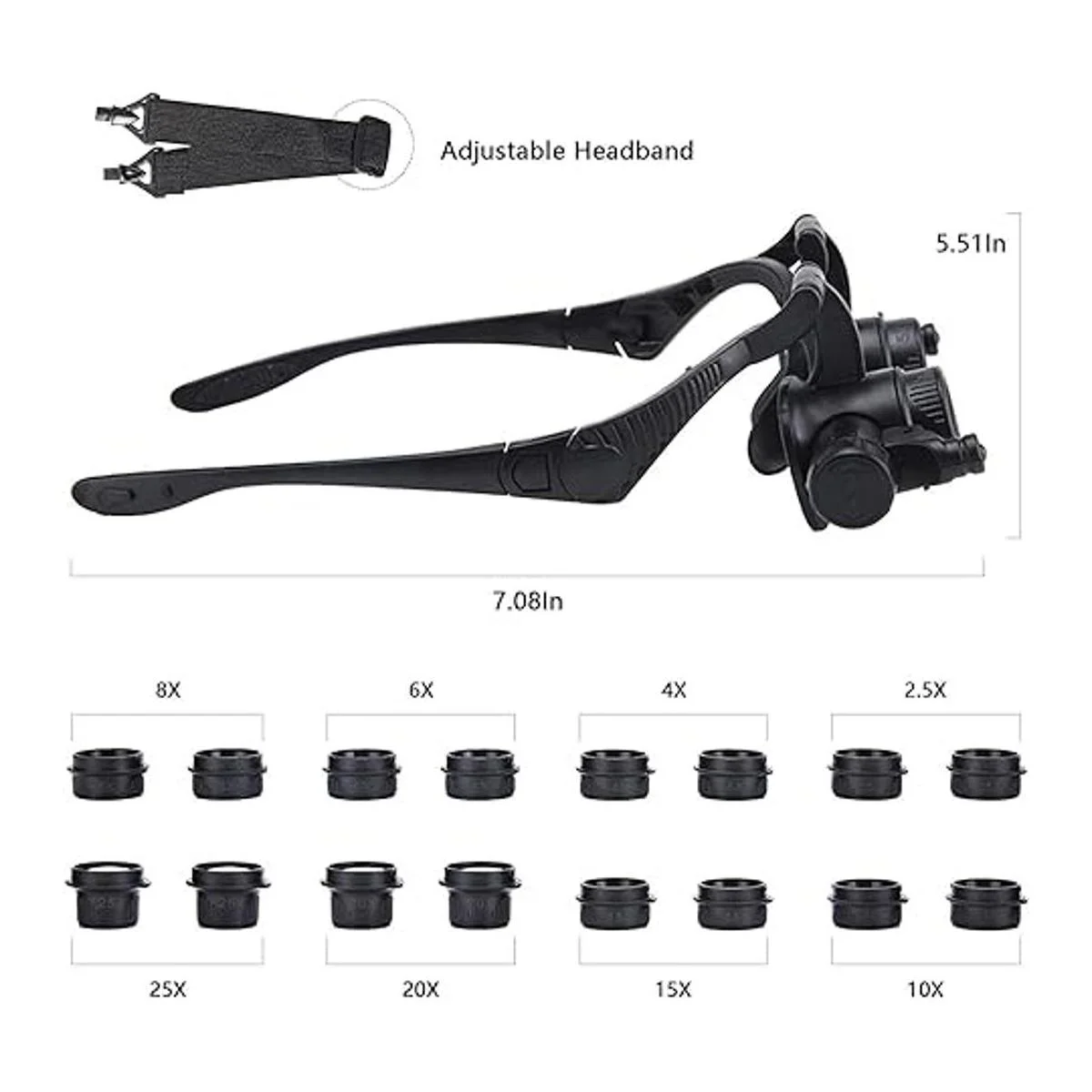 Lentes intercambiables: hay 8 grupos de lentes intercambiables en el paquete de nuestra lupa montada en la cabeza: 2.5x / 4x / 6x / 8x / 10x / 15x / 20x / 25x, que puede satisfacer tus necesidades de trabajo cercano. Tipo de demanda. Se recomienda elegir un barril de lente con un aumento adecuado de acuerdo con el tamaño del objeto a observar. El aumento se puede intercambiar rápidamente y colocar en la caja de almacenamiento de lentes correspondiente para mantenerlo ordenado.