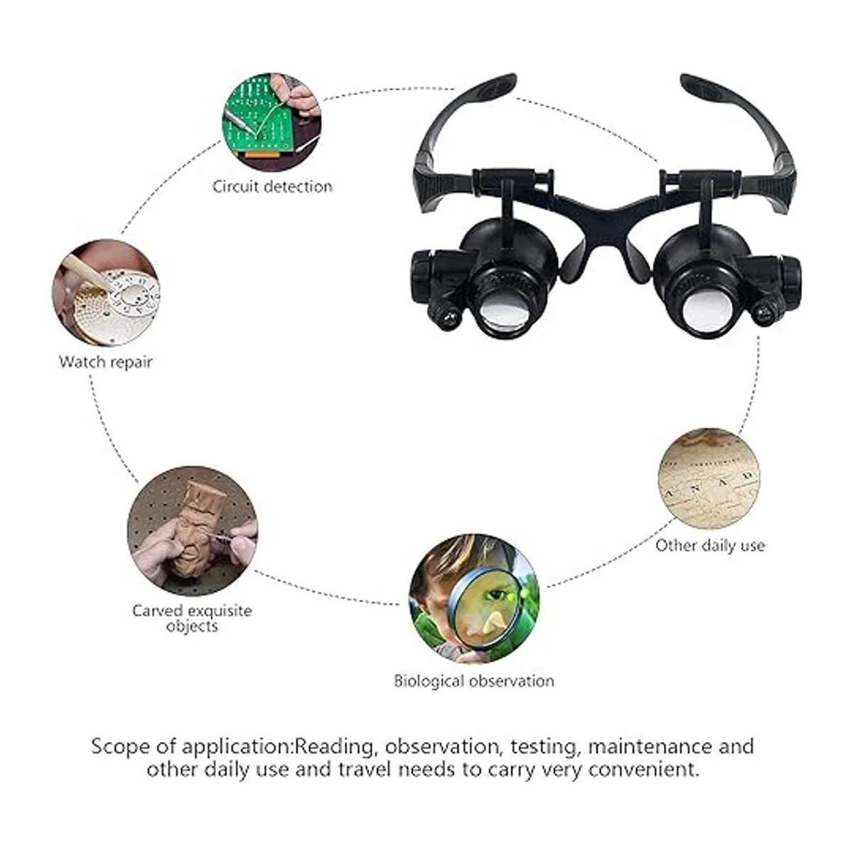 Observación de un solo ojo: recomendamos utilizar solo un ojo de las gafas de lupa de doble ojo para ver el objeto, porque cuando se utilizan dos gafas al mismo tiempo, el enfoque fallará. Puedes utilizar los dos barriles de lente alternativamente para eliminar la fatiga visual y mejorar eficazmente tu trabajo. Nota: estas lupas con luz son adecuadas para trabajos de rango cercano, mantente más cerca del objeto de observación objetivo.