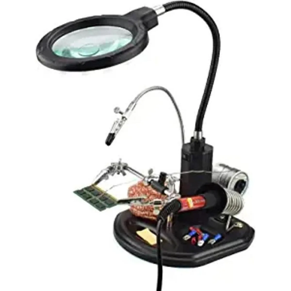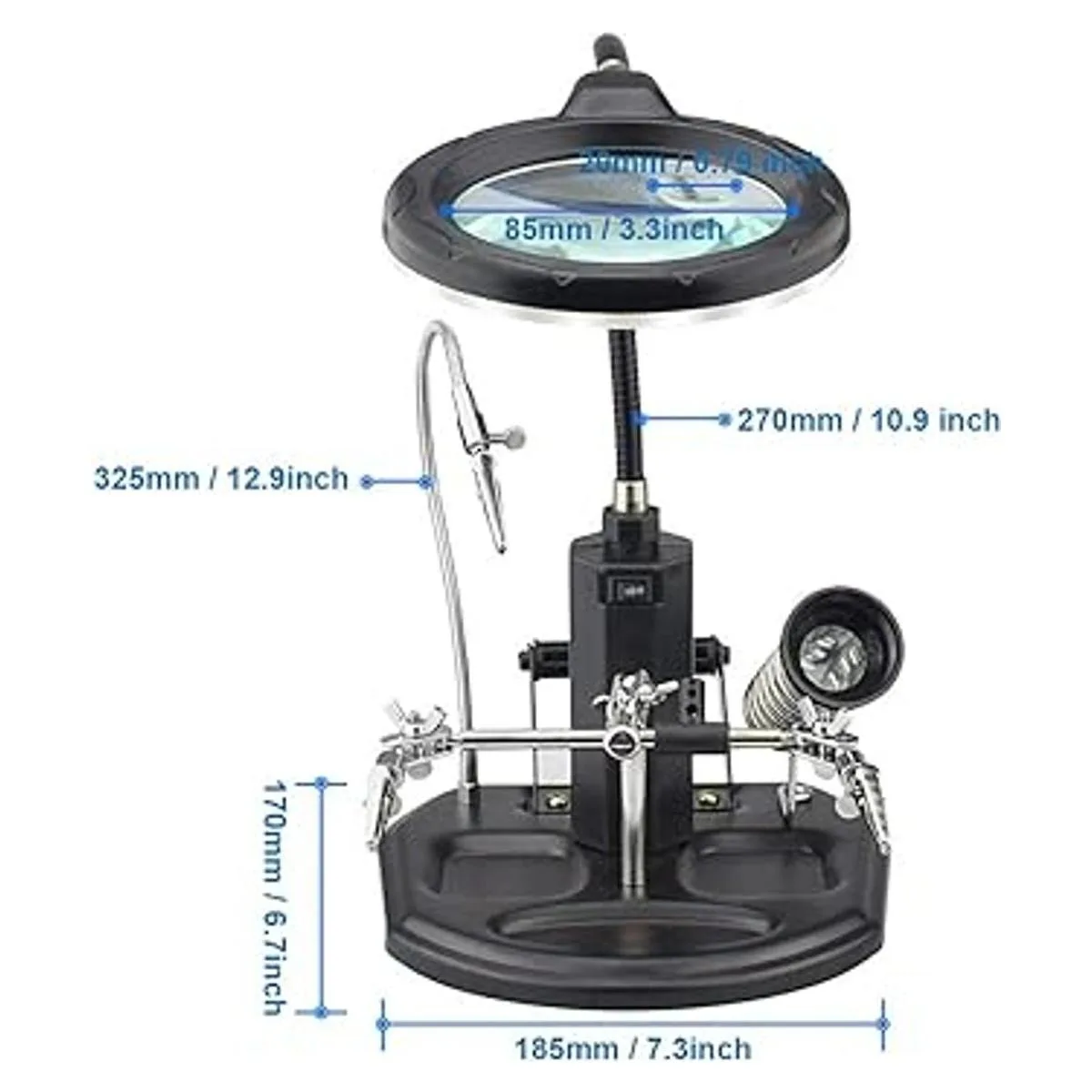 Soporte de lupa con abrazadera y clips de cocodrilo de 11.417 in, incluye soporte de hierro y bandeja, soporte de carrete de soldadura y soporte de soldador, estación de trabajo perfecta para soldadura, montaje, reparación de electrónica, modelado, pasatiempos y manualidades.