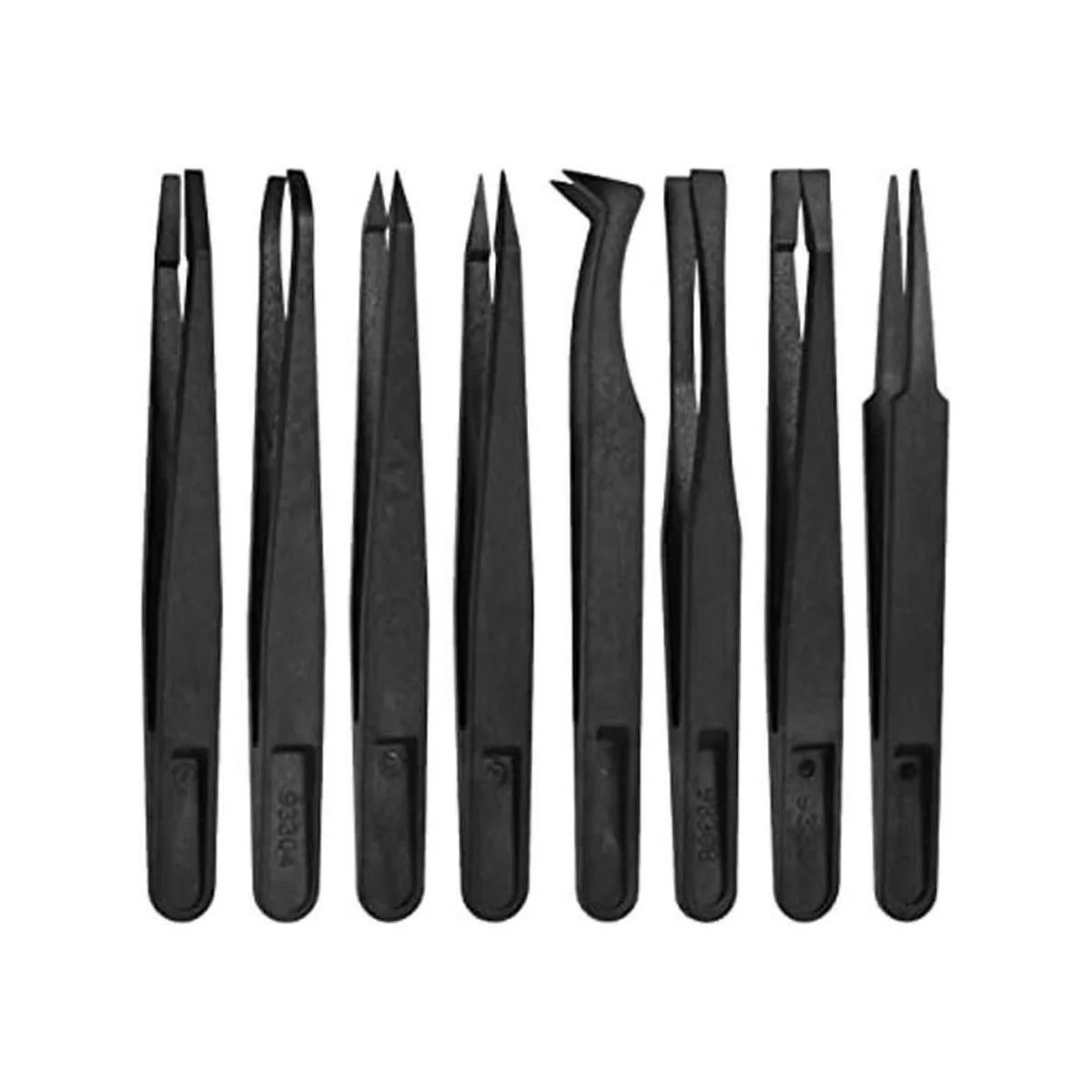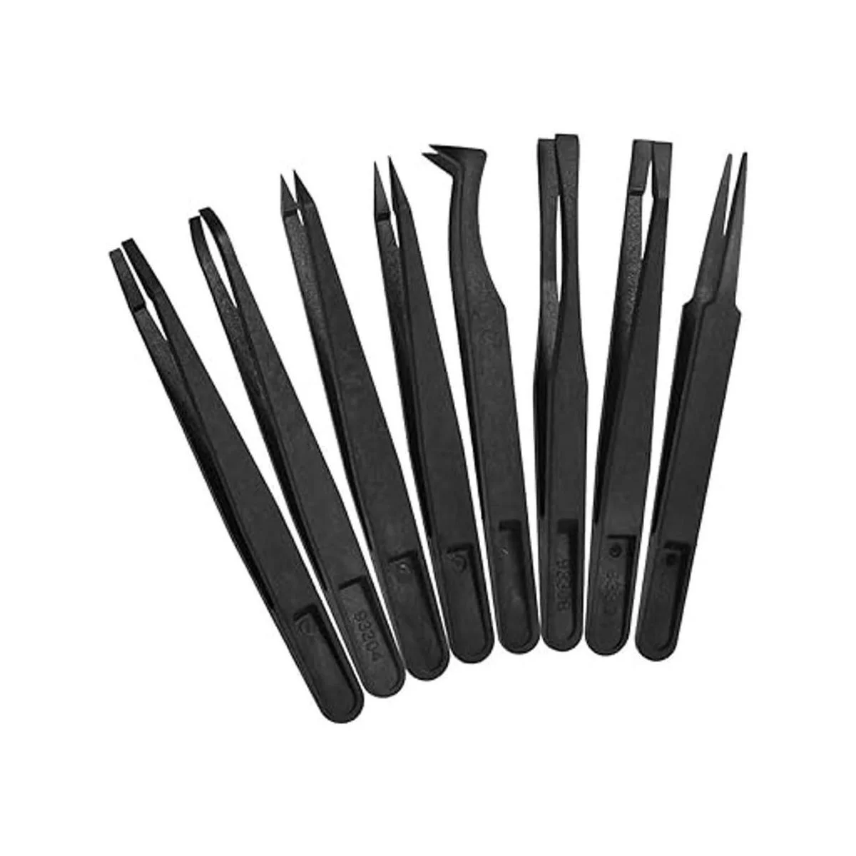 MMOBIEL Juego de 8 pinzas de precisión de plástico multifuncionales antiestáticas, pinzas de punta plana inclinadapuntas curvadas para electrónica, fabricación de joyas, trabajo de laboratorio, reparación negra