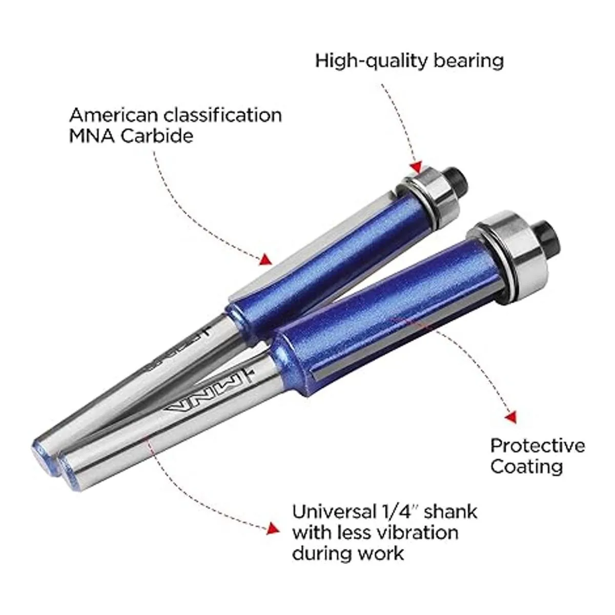 MNA Además, el juego de brocas rectas es un kit de enrutador de actualización diseñado para recortar una superficie chapada al ras con un sustrato o utilizar una plantilla para crear múltiples piezas idénticas.