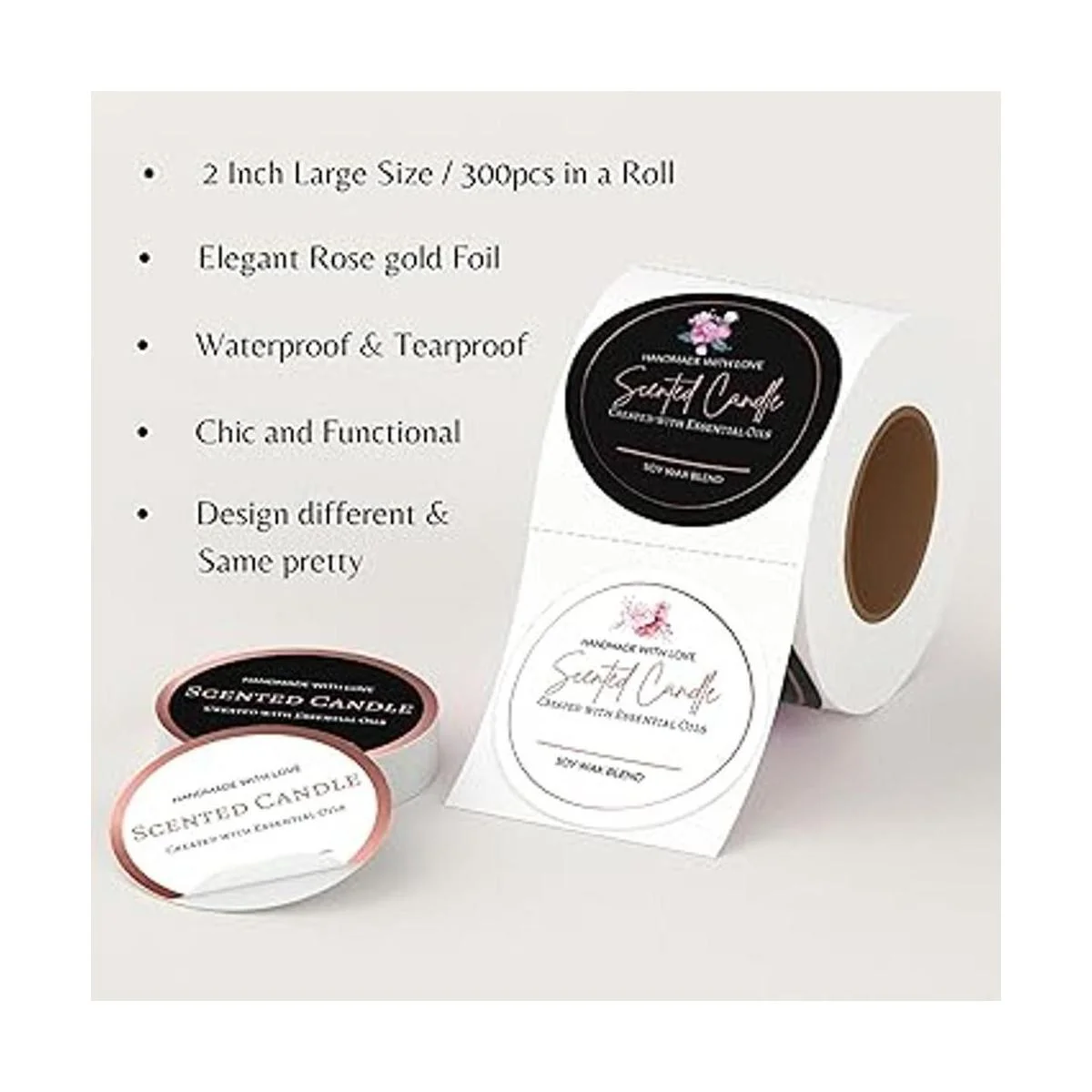 Cantidad y tamaño: 300 etiquetas impermeables para velas en un rollo. Corte redondo de 2.0 in de diámetro. El tamaño grande los hace bien ajustados para latas, tarros y recipientes. Estas atractivas etiquetas están diseñadas de una manera fácil de combinar y rentable para el embalaje de velas hecho a mano.