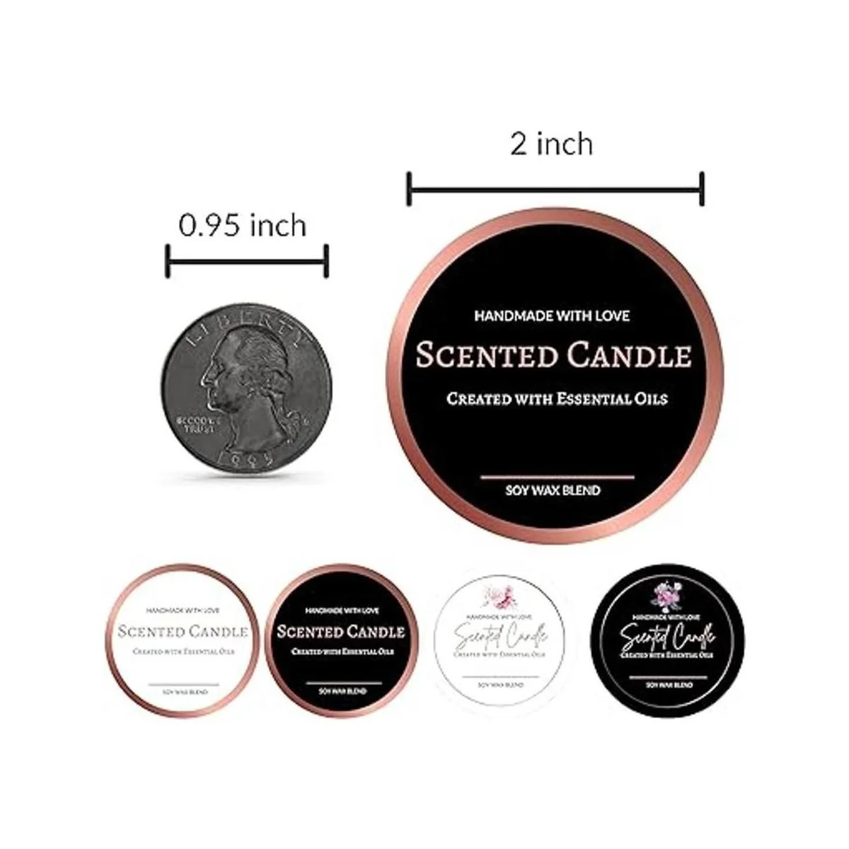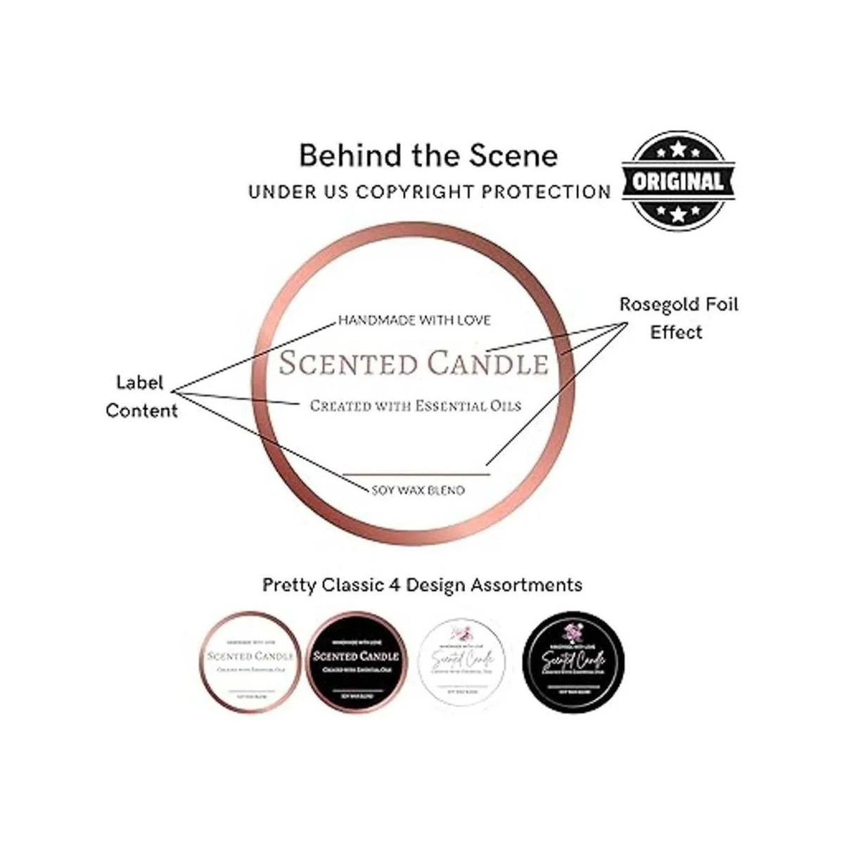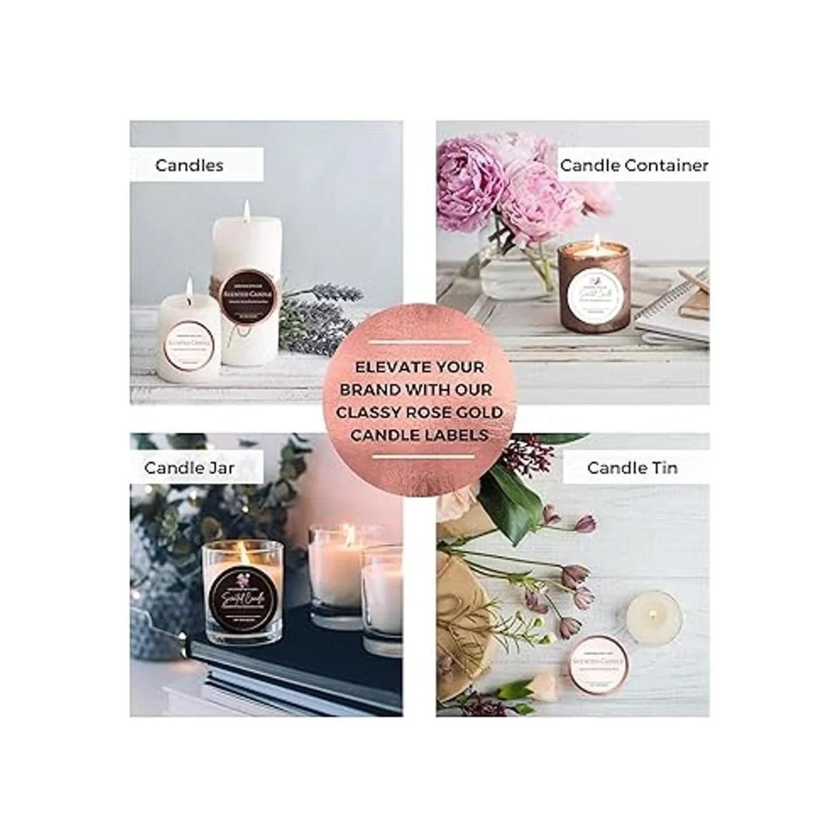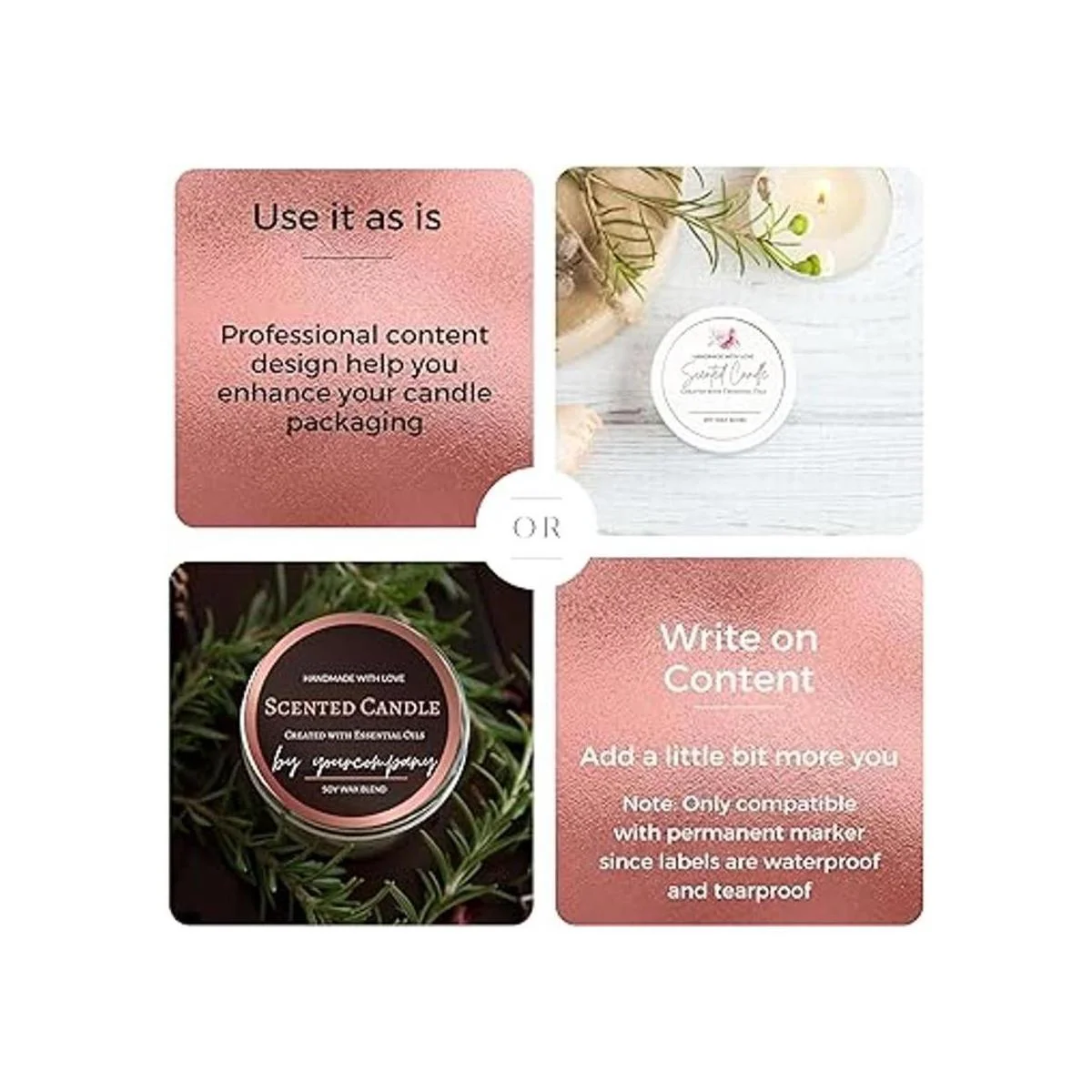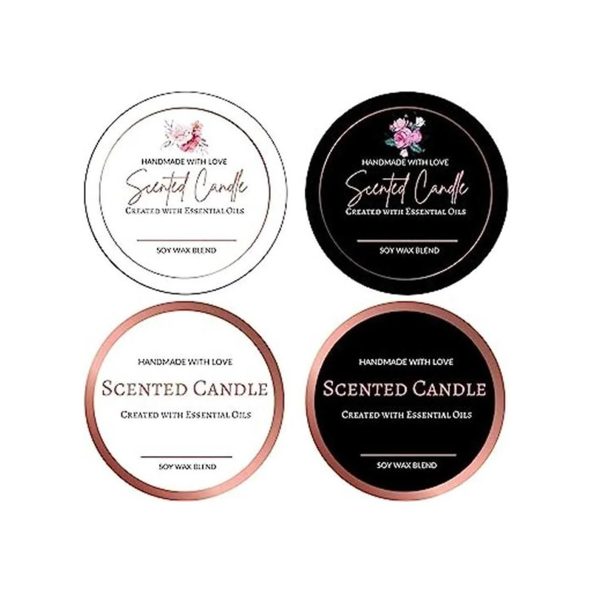Diseño único de primera calidad: diseño único de Mobiusea. 4 elegantes surtidos de oro rosa que promueven un aspecto profesional. Un gran complemento para tu embalaje de vela de cera de soja perfumada casera, personaliza con marcadores permanentes o úsalos tal como está.