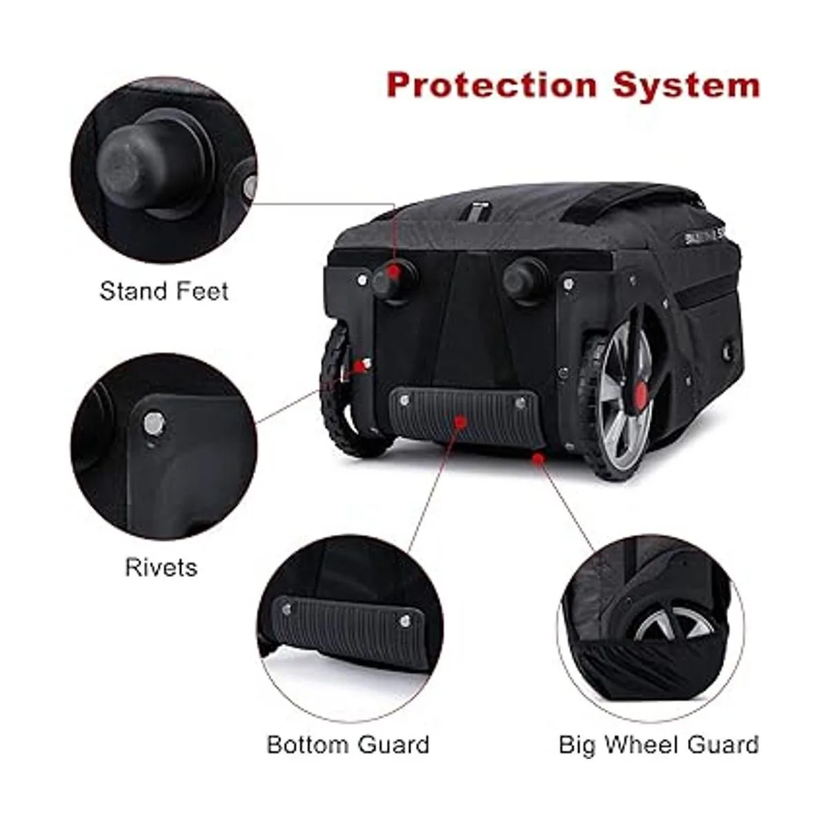 Bolsa y mochila de doble uso: puedes guardar la barra de tracción y utilizar como una mochila, o la barra de tracción se puede sacar y utilizar como una bolsa de carrito, que es práctica y profesional. La mochila de transporte aprobada por avión con 2 ruedas resistentes y 2 pies fijos delanteros, puedes fijar la mochila con ruedas en su lugar cuando estés cansado. Además, hay una cubierta de lluvia para ruedas en la parte inferior de la mochila.