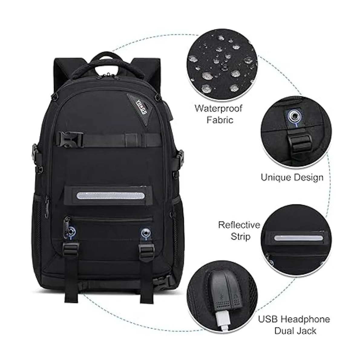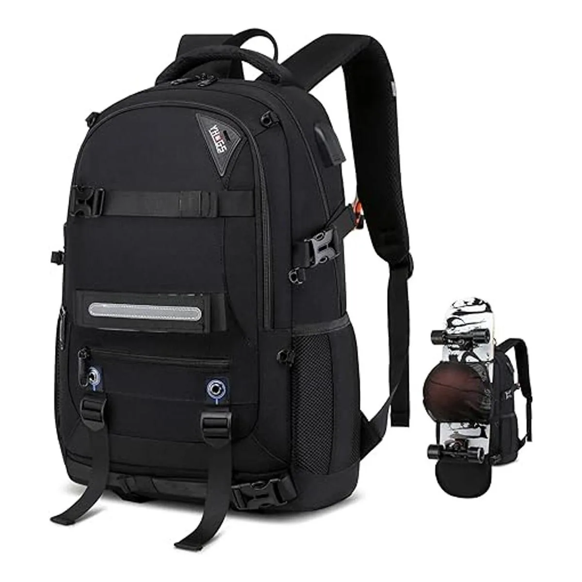 Material duradero y diseño de puerto USB: la mochila para patineta cuenta con un bolsillo especial antirrobo RFID, así como un bolsillo antirrobo oculto para proteger tus objetos de valor del robo, y un compartimento especial oculto con cremallera en la parte posterior especialmente diseñado para almacenar zapatos.