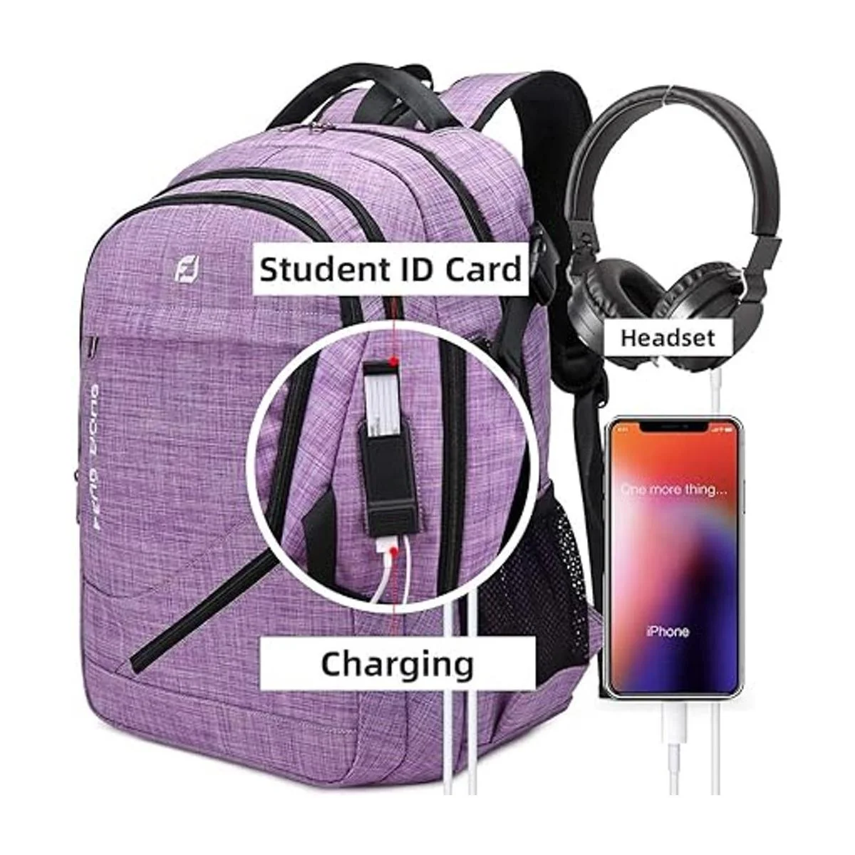 Accesorios modernos y prácticos Esta elegante mochila de día con puerto micro USB externo y puerto de auriculares de 0.138 in, con el fin de ofrecerte una manera más creativa de cargar tu dispositivo electrónico y hacer una experiencia de uso más cómoda. Y la interfaz de auriculares libera tus manos cuando disfrutas de audios, música, etc. Mientras tanto, ten en cuenta que esta mochila no incluye un banco de energía.
