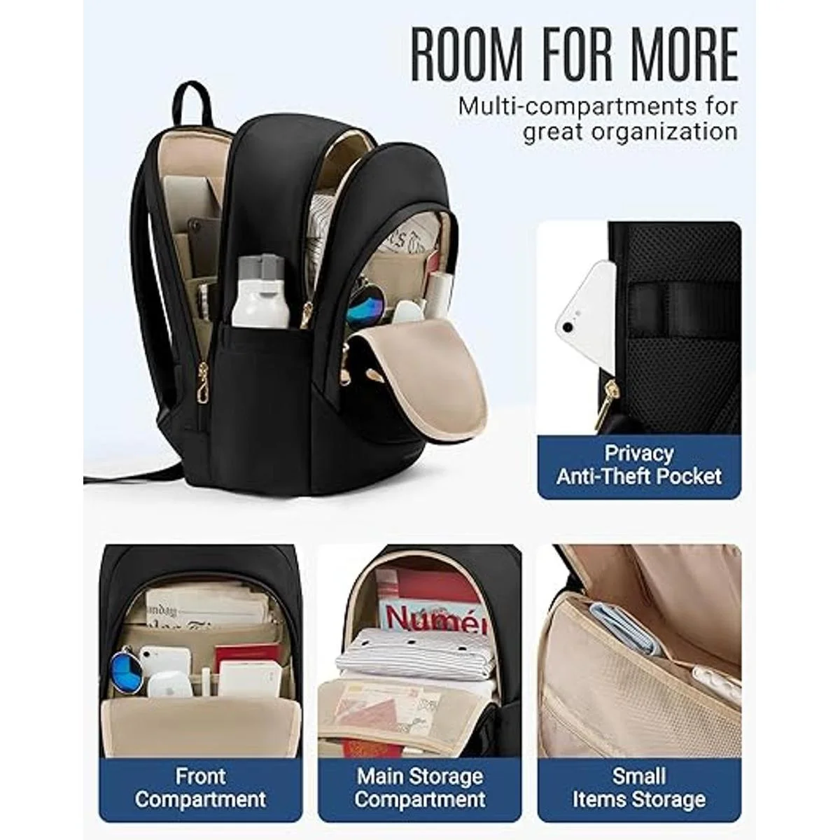 Gran capacidad: el compartimento separado para laptop se adapta a portátiles de hasta 15.6 pulgadas. Gran compartimento principal espacioso para las necesidades diarias, como carpetas A4, revistas, tabletas, cargadores, banco de energía y ropa.