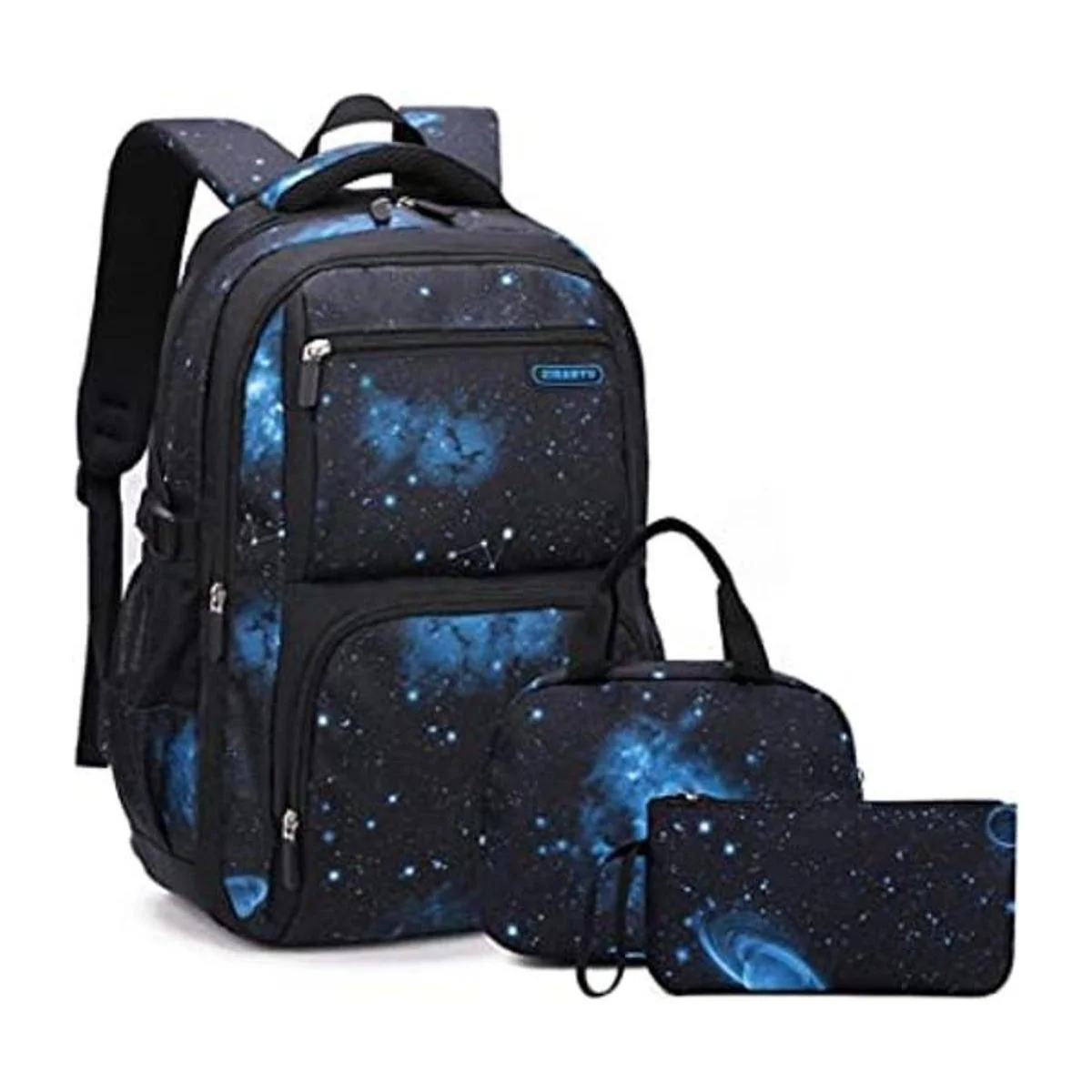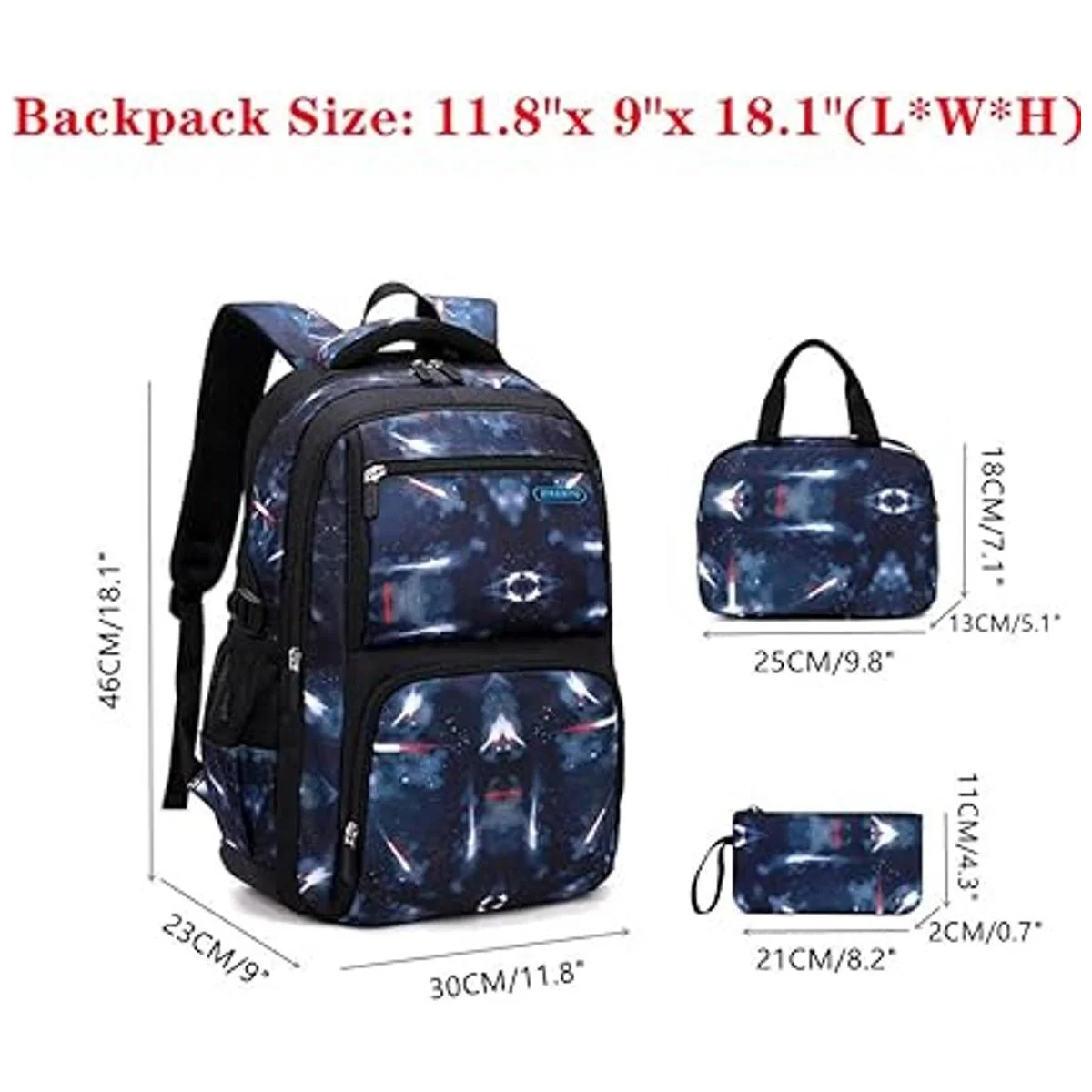 Juego de mochila para niños: mochila: 11.8 x 9 x 18.1 pulgadas largo x ancho x alto; bolsa de almuerzo: 9.8 x 5.1 x 7.1 pulgadas largo x ancho x alto, bolsa de lápices: 8.2 x 4.3 pulgadas largo x alto; mochila para niños con patrón de galaxia fresco, costuras robustas, cremalleras duraderas. Regalo ideal para cumpleaños, vuelta a la escuela y Navidad para niñas y niños.