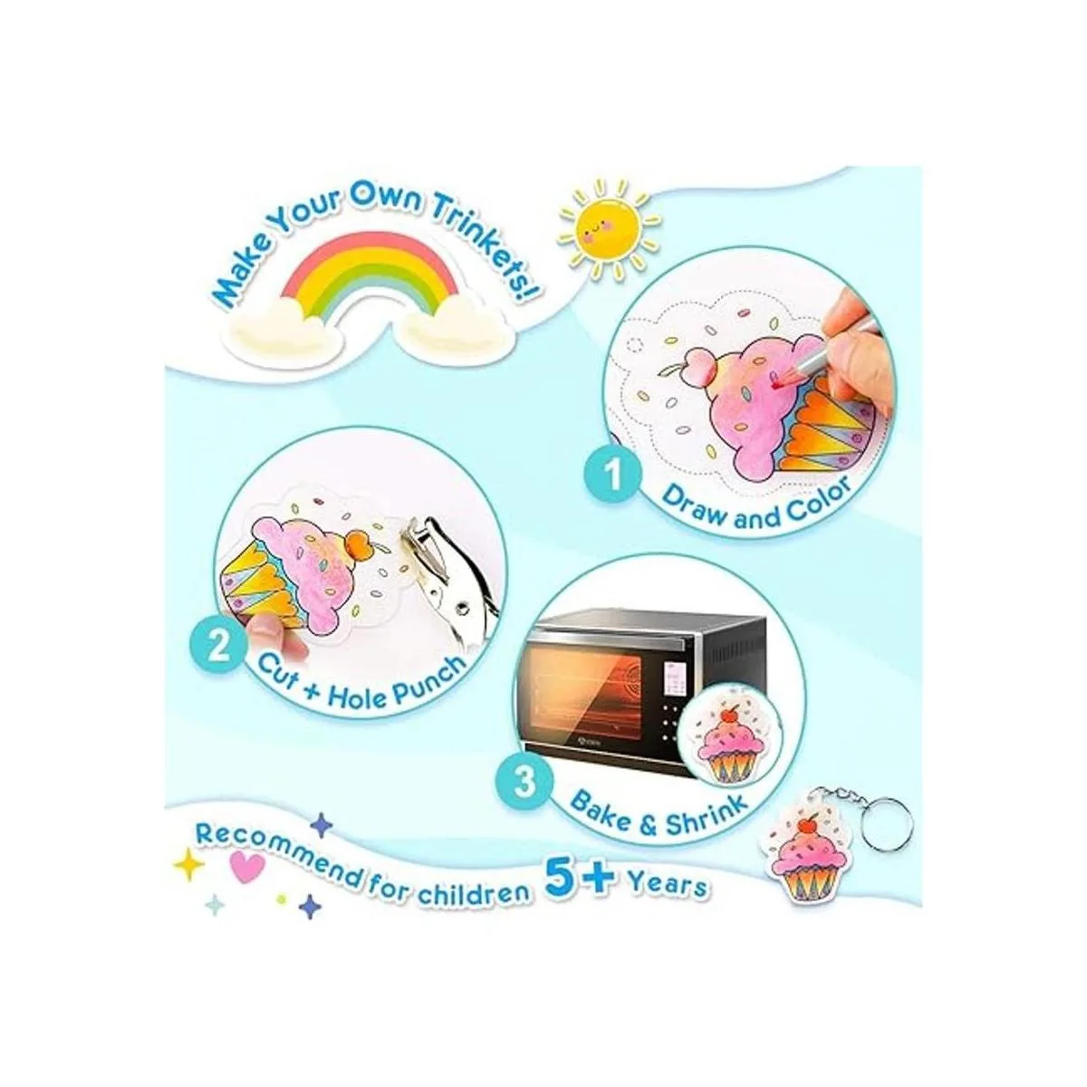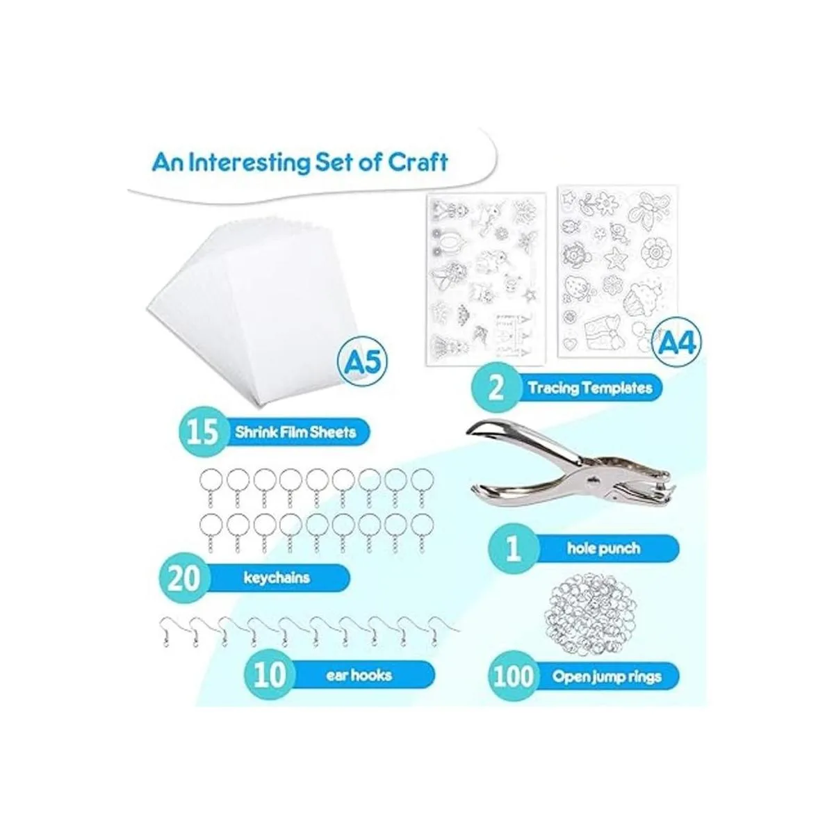 Fácil de crear: este kit de joyería retráctil es fácil de usar, perfecto para todas las edades. Dibuja y colorea, corta y perfora agujeros, luego hornea durante 12 minutos, mira cómo bailan en el horno y se convierte en un pequeño encanto de plástico duro. Vienen con imágenes rastreables para que puedas trazar y hojas en blanco para crear piezas personalizadas. Kit de película retráctil perfecto para actividades en casa con los niños