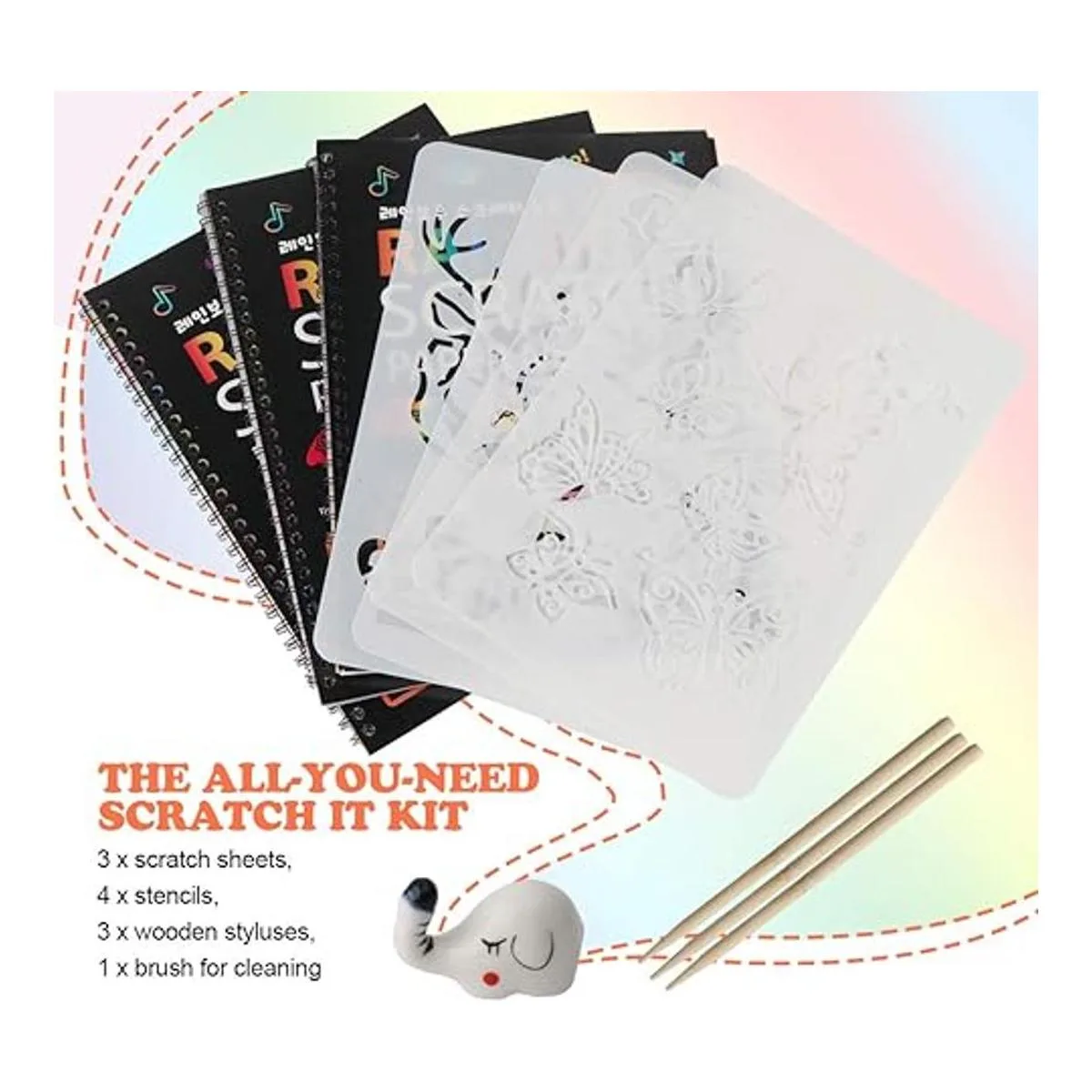 Combo de 3 cuadernos de arte para rascar: incluye 30 páginas de tamaño completo para tus propios garabatos y dibujos. Resistente encuadernación en espiral para que las páginas estén protegidas de arañazos involuntarios. Viene con 4 plantillas de pintura de 10.25 x 7.5 pulgadas, 3 lápices de madera y un soporte para lápices. Las imágenes coloridas emergen mágicamente de la oscuridad mientras te rascas
