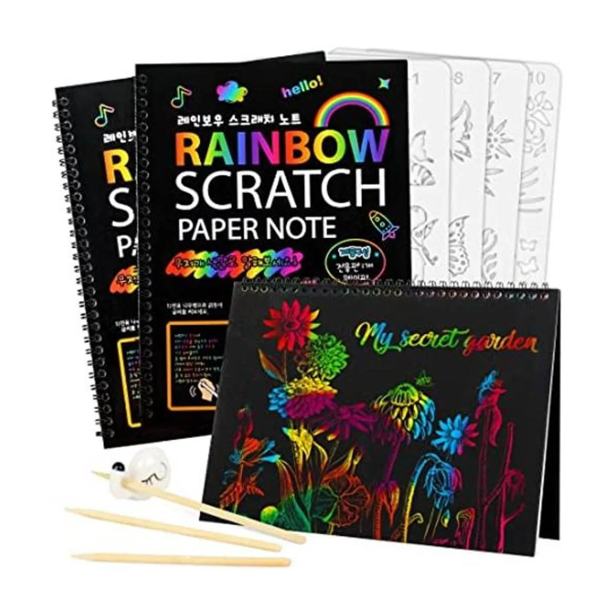 Materiales mejorados: nuestros libros de arte para rascar están hechos de cartulina gruesa con superficie recubierta de negro, no se rompe ni se rompe fácilmente. Y las plantillas están hechas de plástico PET de alta calidad, duradero y lavable. Los lápices están hechos de madera, seguros y respetuosos con el medio ambiente. No tóxico y sin sabor extraño, por lo que los niños pueden crear diseños coloridos y sin fallos de forma segura