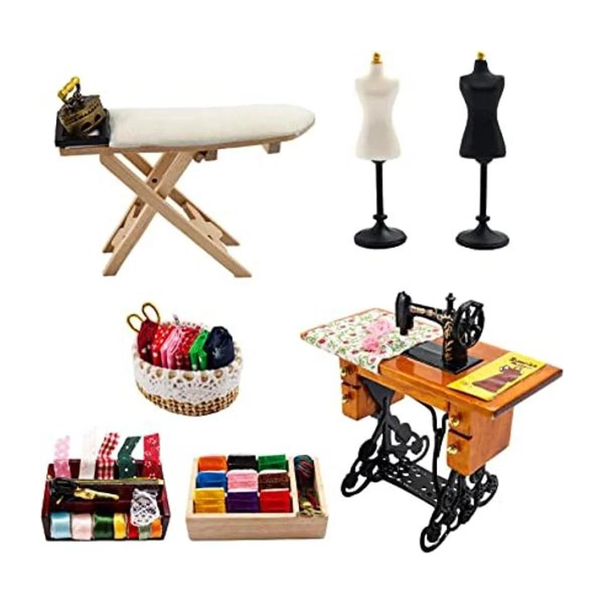 Modelo de casa de coser en miniatura a escala 112, accesorios de simulación para máquina de coser vintage, caja de coser, tabla de planchar