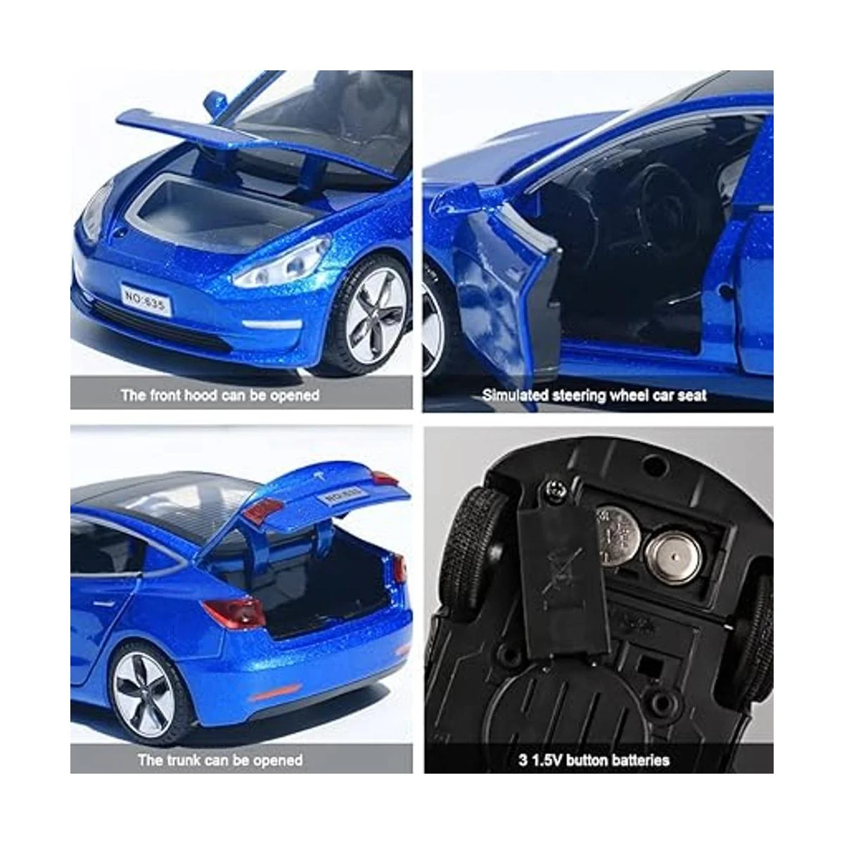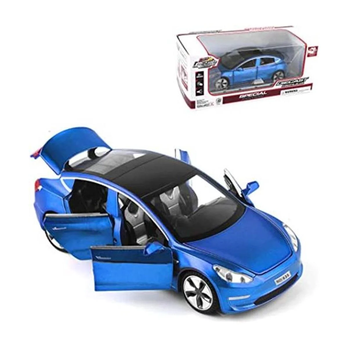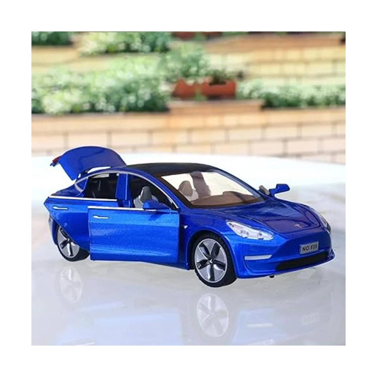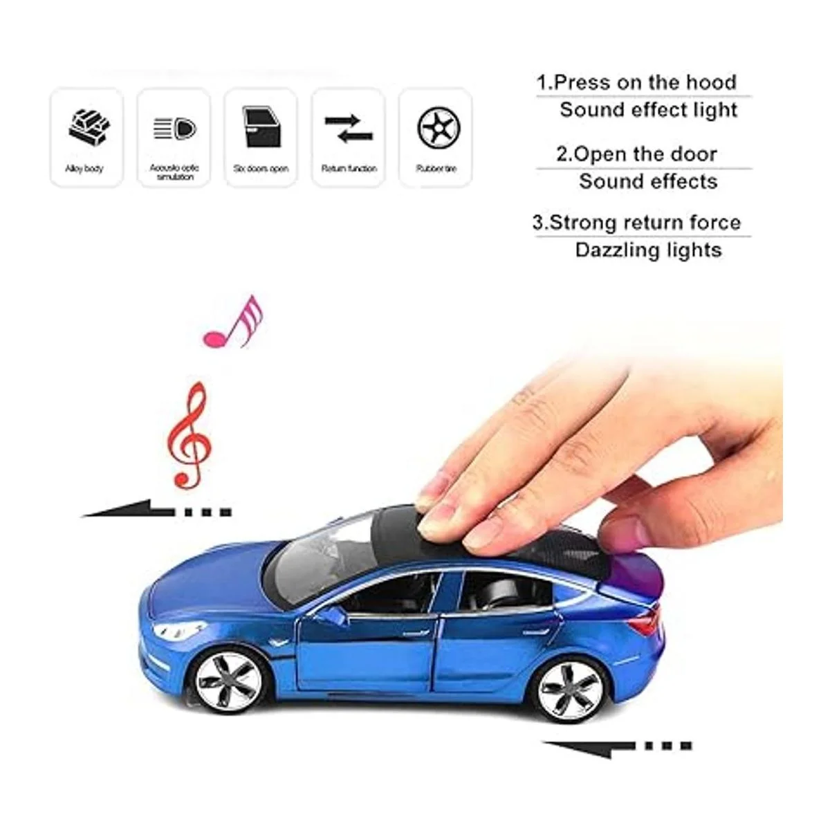 Modelo de coche de juguete Diecast modelo 3, de aleación de zinc, simulación, modelo de coche Tesla, vehículos tirantes, mini vehículos a escala 132, juguetes con luces y música para niños pequeños, regalo de cumpleaños azul