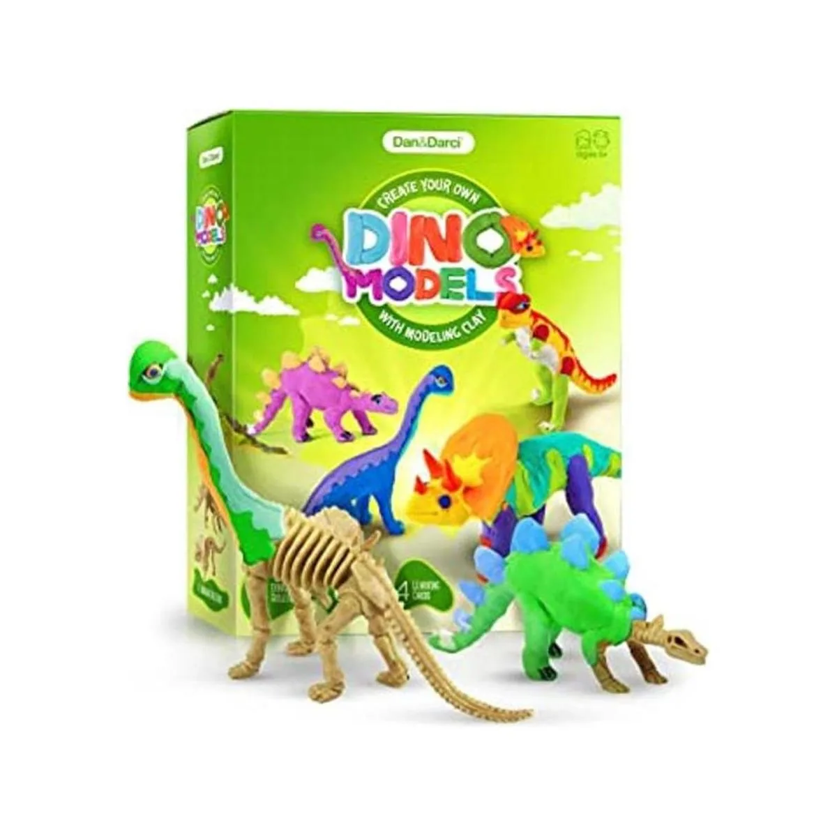 El kit incluye: 4 esqueletos de dinosaurio Trex, Brachiosaurus, Triceratops y Stegosaurus, 6 colores de arcilla de modelado, 3 herramientas de escultura, 4 soportes de dinosaurio, 4 tarjetas de aprendizaje de dinosaurios y guía de instrucciones idioma español no garantizado.