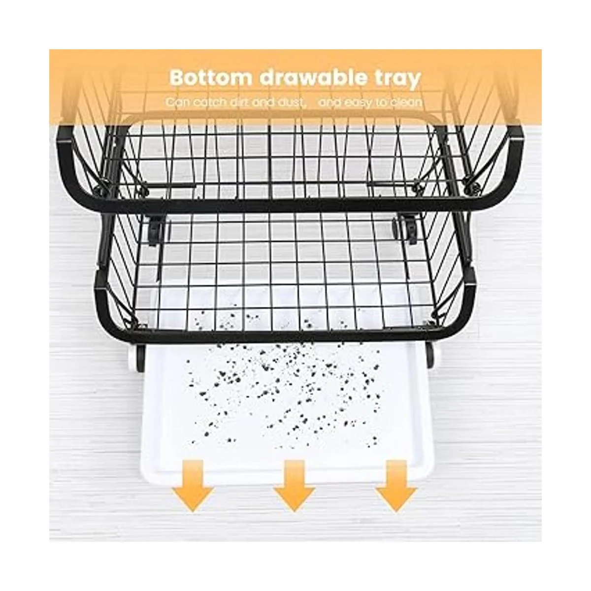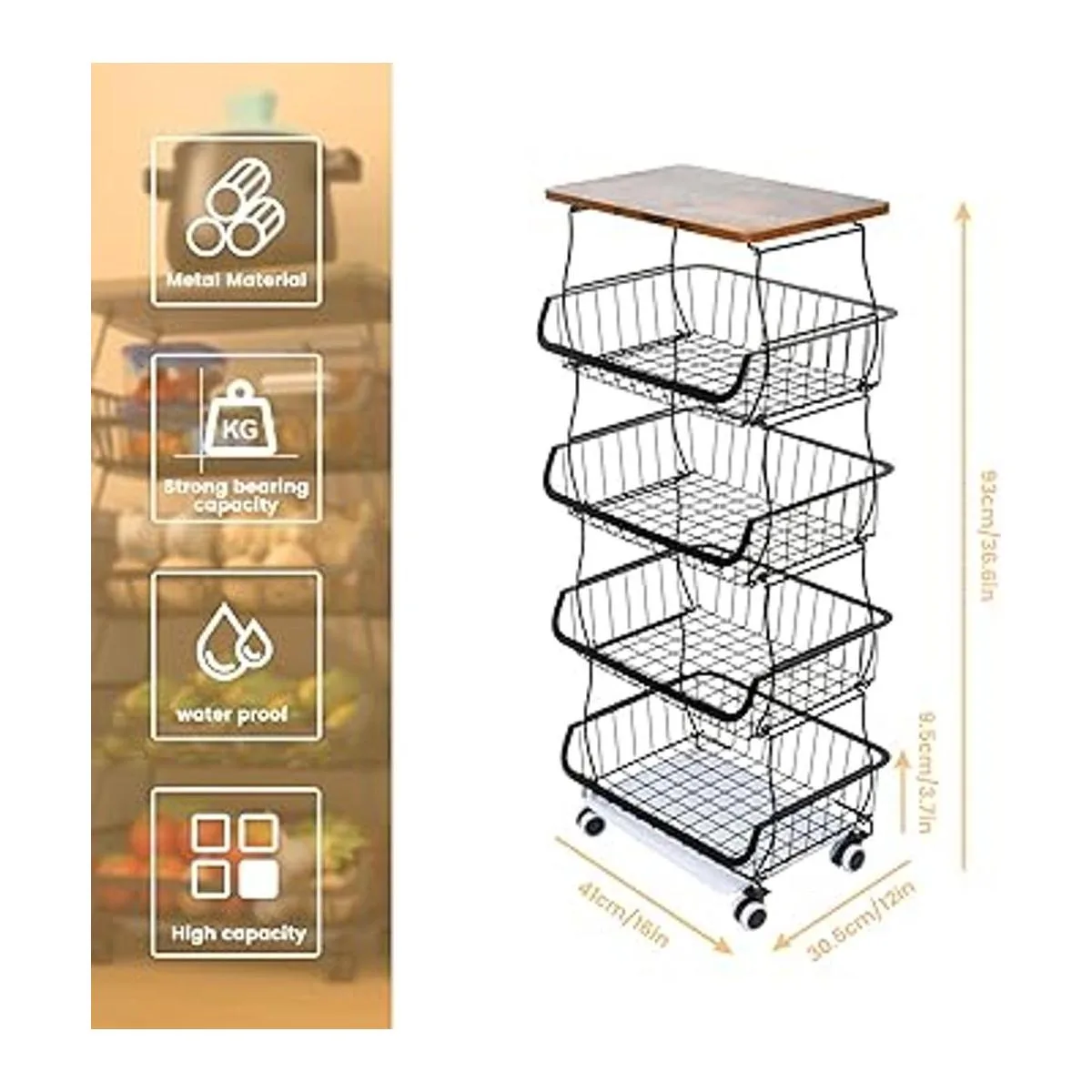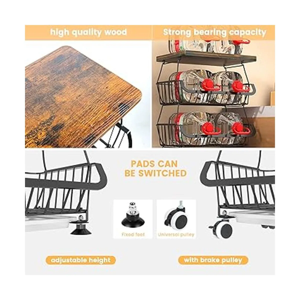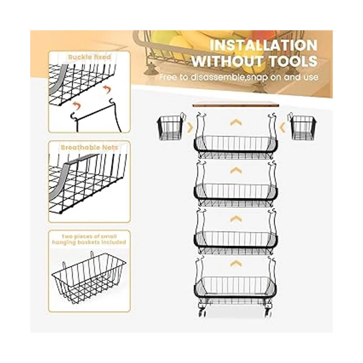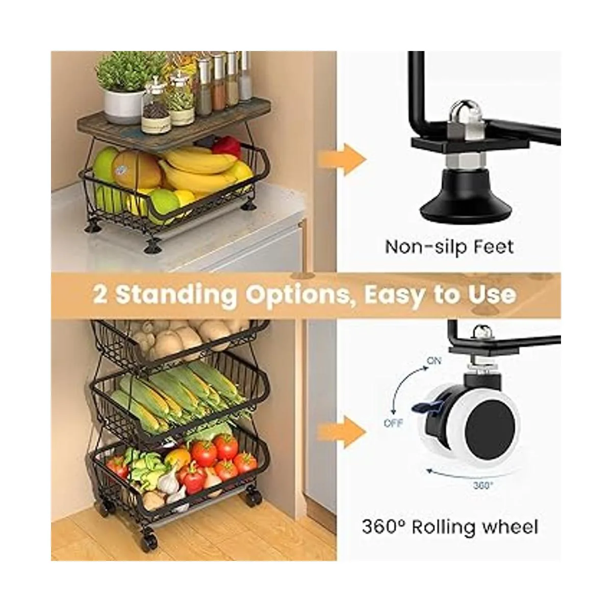 Fácil instalación: las cestas de almacenamiento de frutas son muy fáciles de montar. Hay dos tipos de pies proporcionados, uno es rueda rodante con bloqueo, el otro es pies antideslizantes. El soporte de cesta de alambre de 5 niveles se puede utilizar por separado como cesta rodante y cesta de encimera con los pies antideslizantes según sea necesario