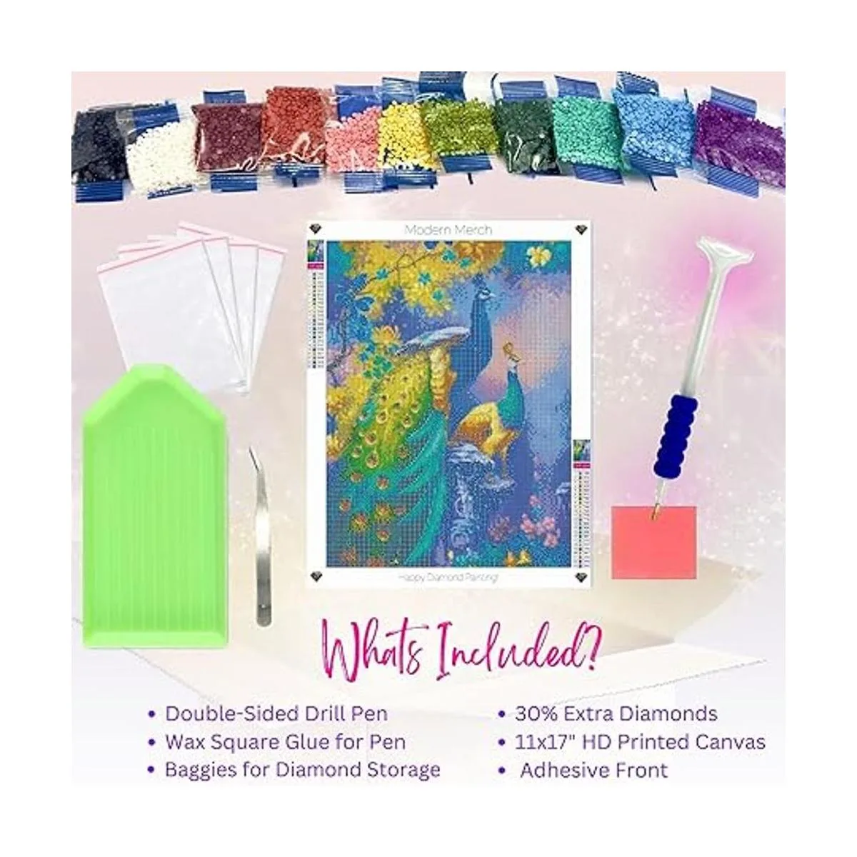 Modern Merch Kits de pintura de diamantes de pavo real para adultos, arte de diamantes de pavo real, paisaje de pájaros de paisaje, pintura de pavo real de diamantes para adultos, taladro redondo de 11 x 17 pulgadas, arte y manualidades para adultos