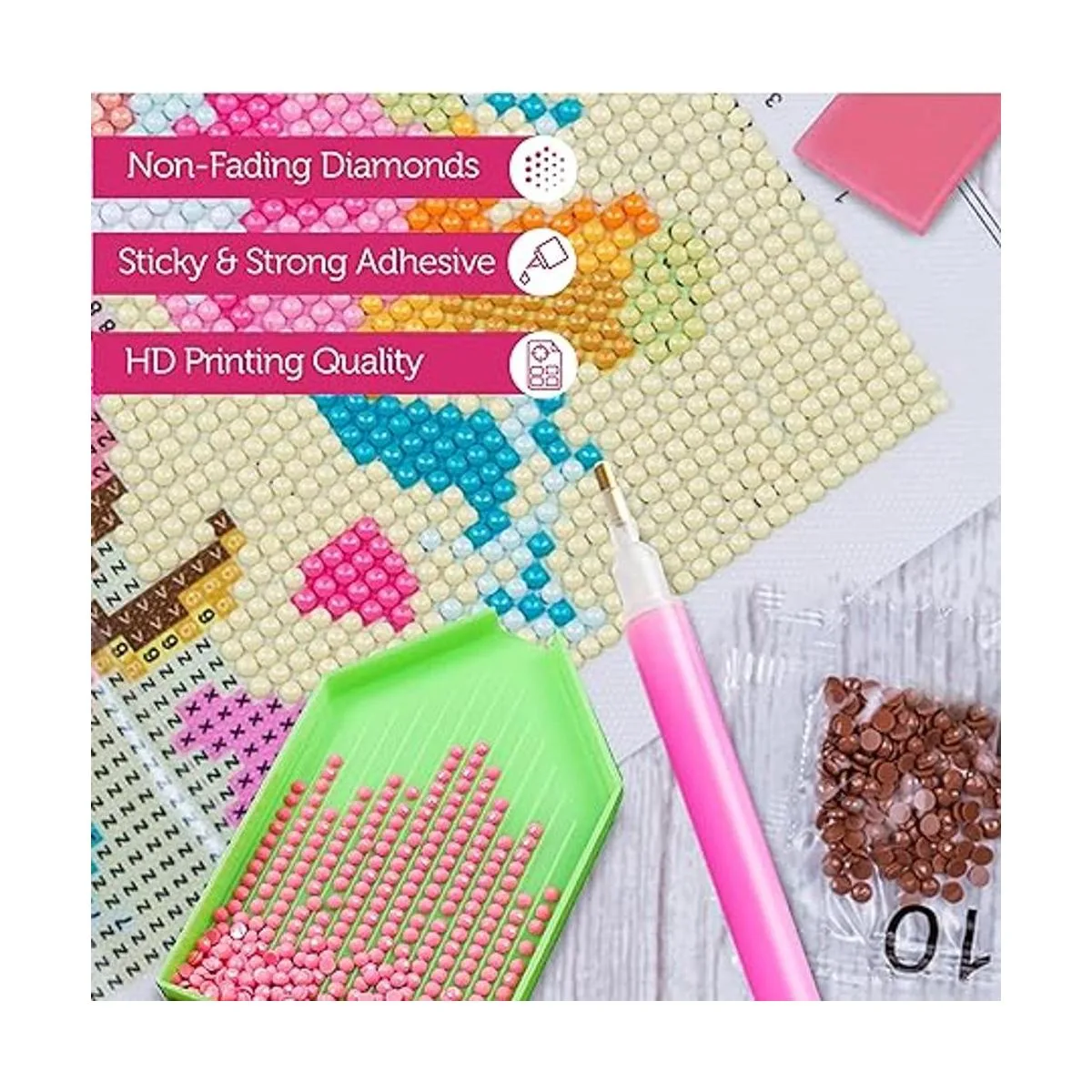 Contenido del kit de pintura de diamantes: bolígrafo redondo de doble cara, cuadrado de pegamento de pectina, puntos de diamante de resina redondos en varios colores con 30 de diamantes adicionales, lienzo impreso HD de 11 x 17 pulgadas con adhesivo frontal y llave de símbolo