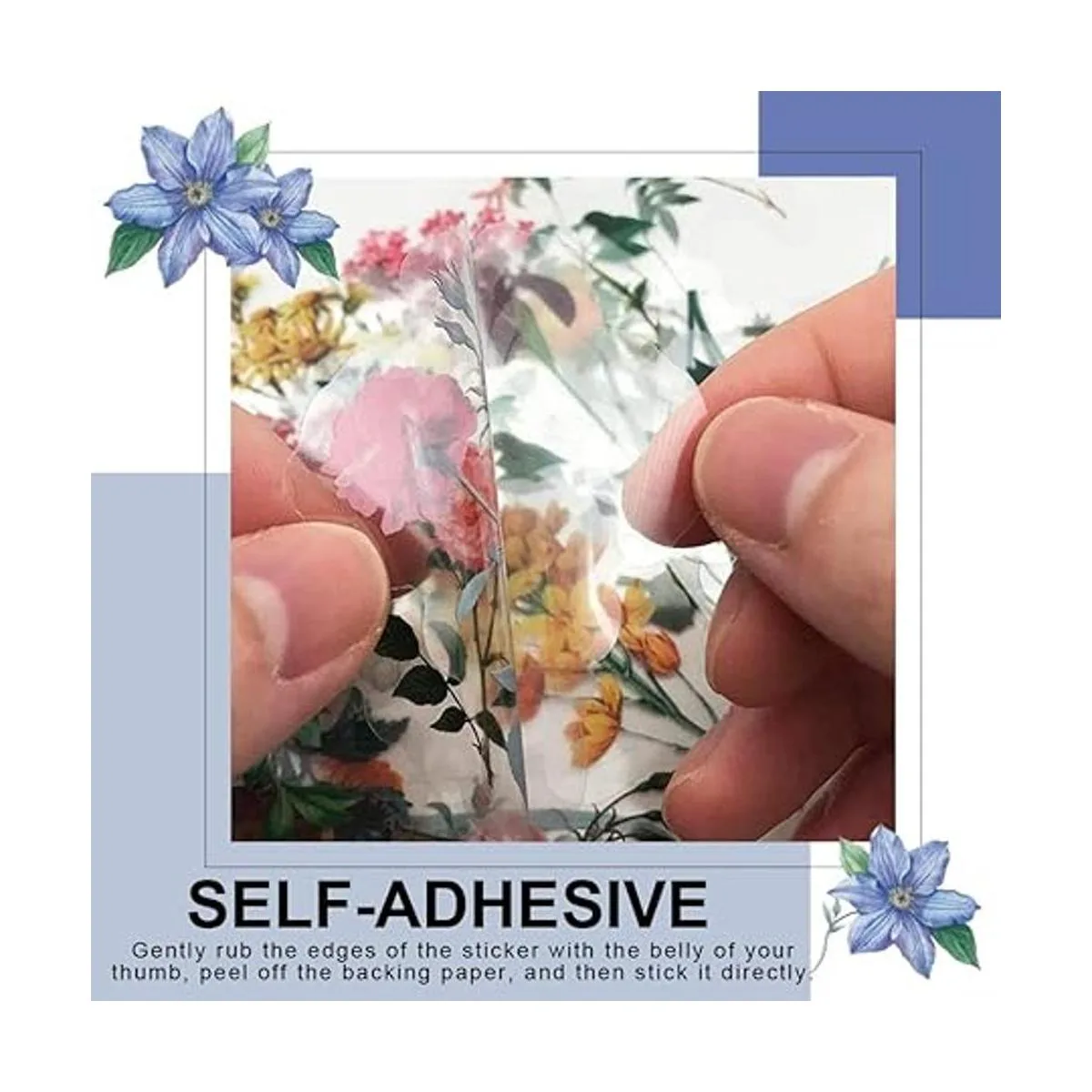 Cómo quitar el papel trasero Frota suavemente los bordes de la calcomanía autoadhesiva varias veces con el pulgar, retira el papel posterior y luego pégala directamente.
