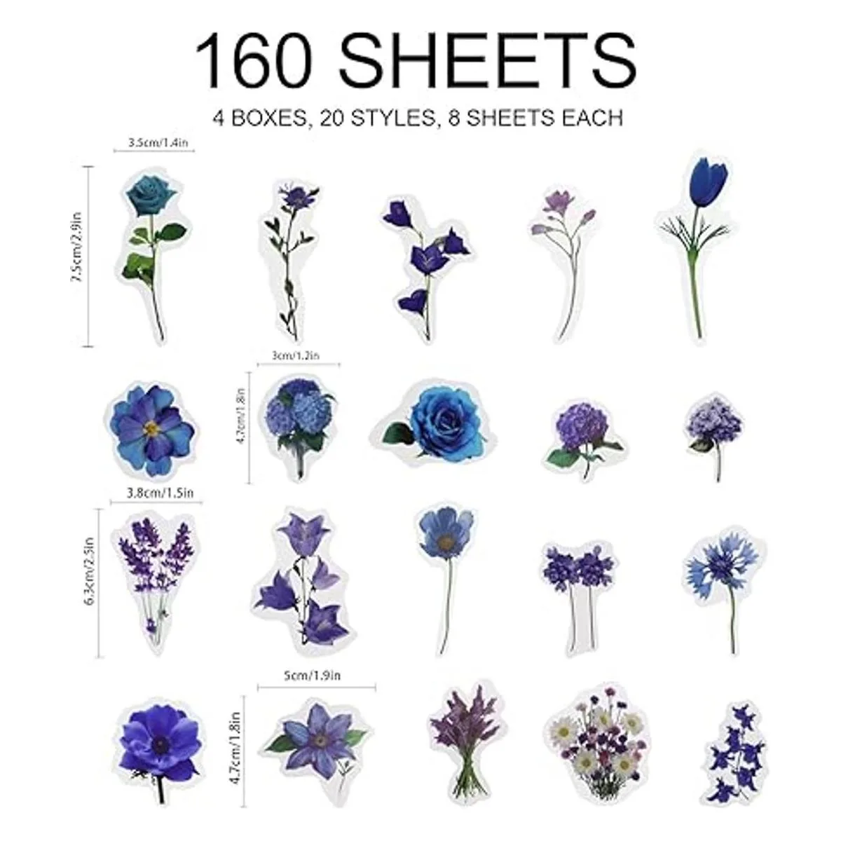 Varios patrones: esta calcomanía floral está temática con flores moradas. Hay un total de 160 calcomanías, 20 patrones de flores diferentes, 8 piezas de cada patrón, 4 cajas. Cantidad suficiente y variedad para satisfacer tus necesidades.