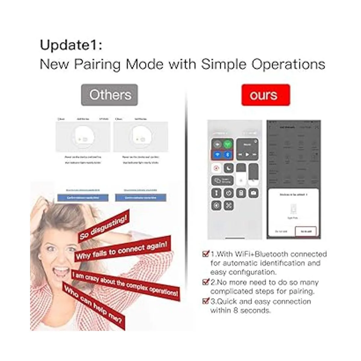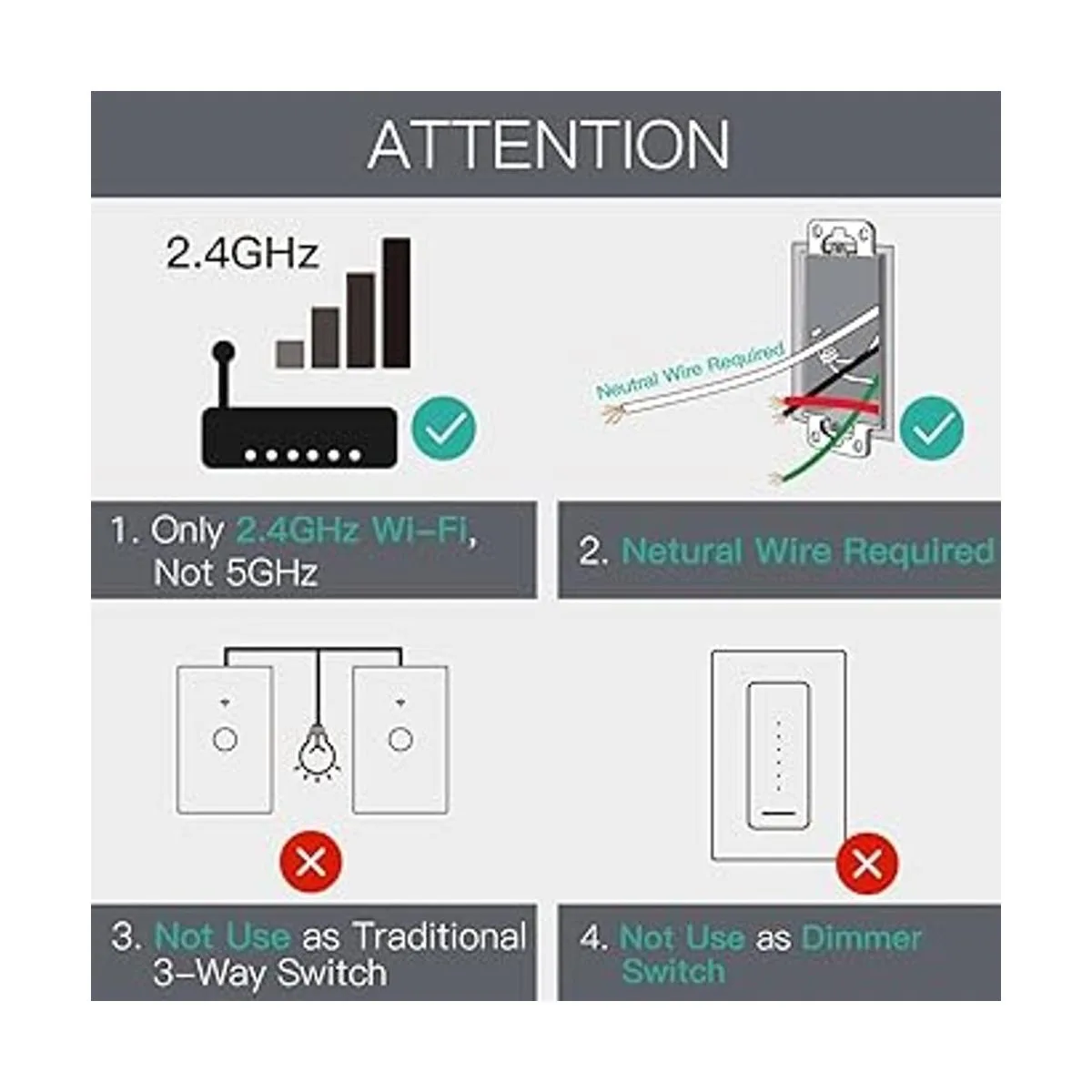 5. Requiere cable neutro para un funcionamiento seguro; no requiere concentrador; soporta red 2.4 G; un modo de emparejamiento mucho más fácil para añadir el dispositivo con WiFi y Bluetooth conectado.