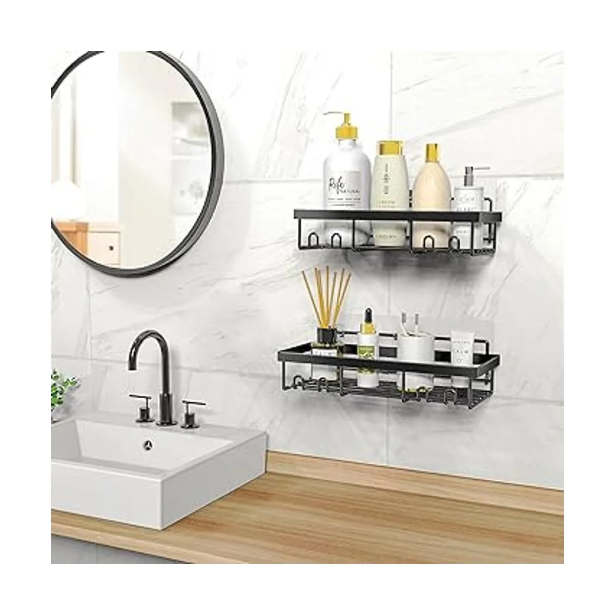 MOFOROCO Estante organizador de estante de ducha paquete de 2, cesta autoadhesiva negra para estantes de baño, para la pared del hogar, para la organización y almacenamiento de accesorios para caravana, artículos esenciales para el primer apartamento