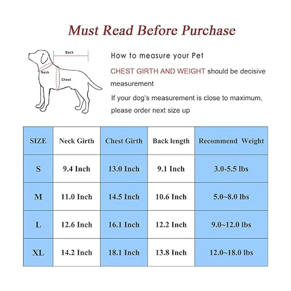 Talla XL: circunferencia del cuello de 14.2 pulgadas; circunferencia del pecho de 18.1 pulgadas; longitud de espalda de 13.7 pulgadas, recomendado para 12 a 18 libras, debes medir la circunferencia del cuello/pecho de tu mascota, longitud de espalda, peso corporal y comprobar la tabla de tallas antes de realizar el pedido, no tomes una decisión solo por el nombre del tamaño, un poco suelto será más cómodo