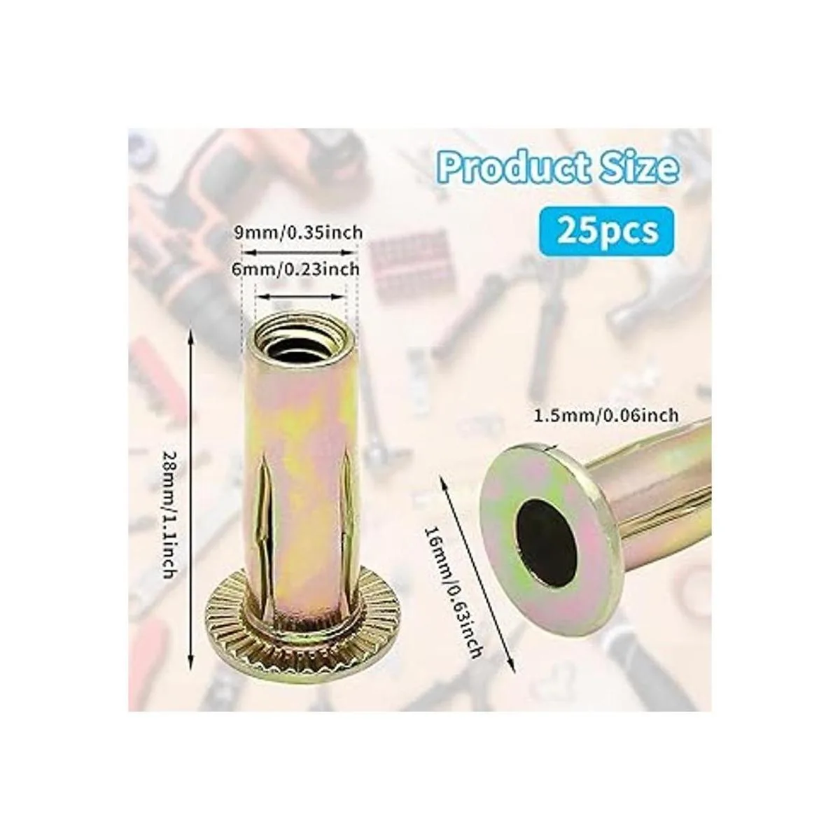 Contenido del paquete: 25 tuercas de remache de agarre múltiple de 1/4 pulgadas. La longitud total es de 1.102 in, el tamaño de la rosca es M6 x 0.059 in, el tamaño del agujero es de 0.354 in.